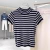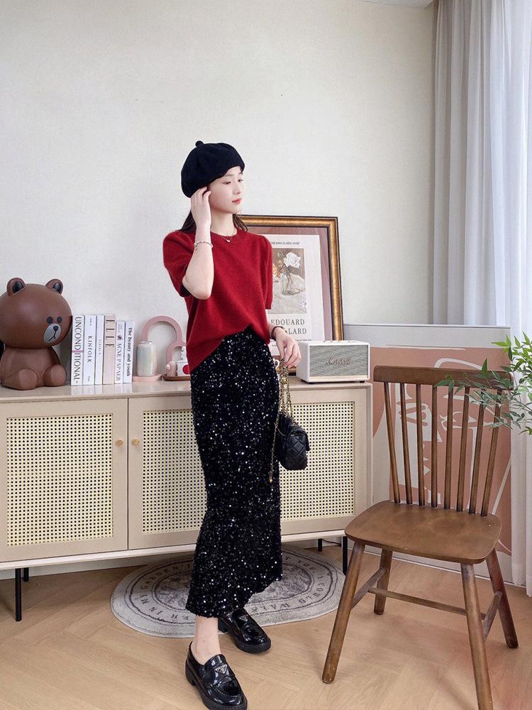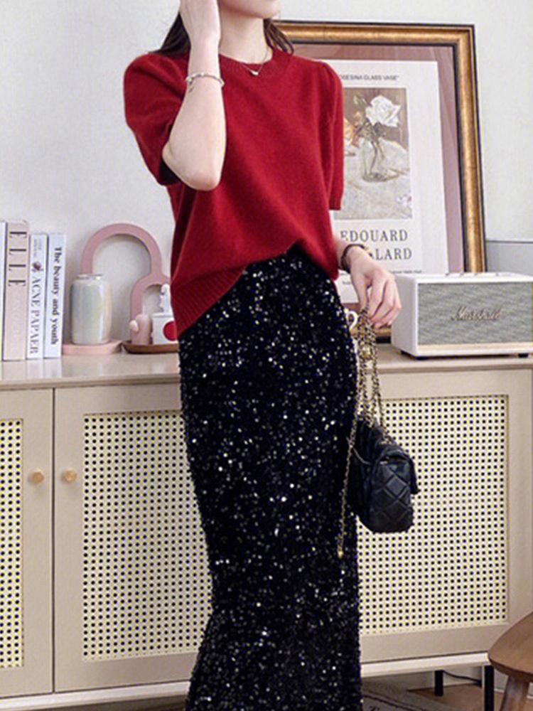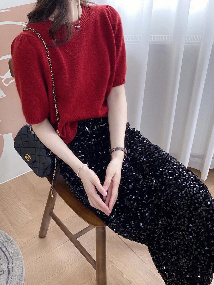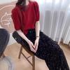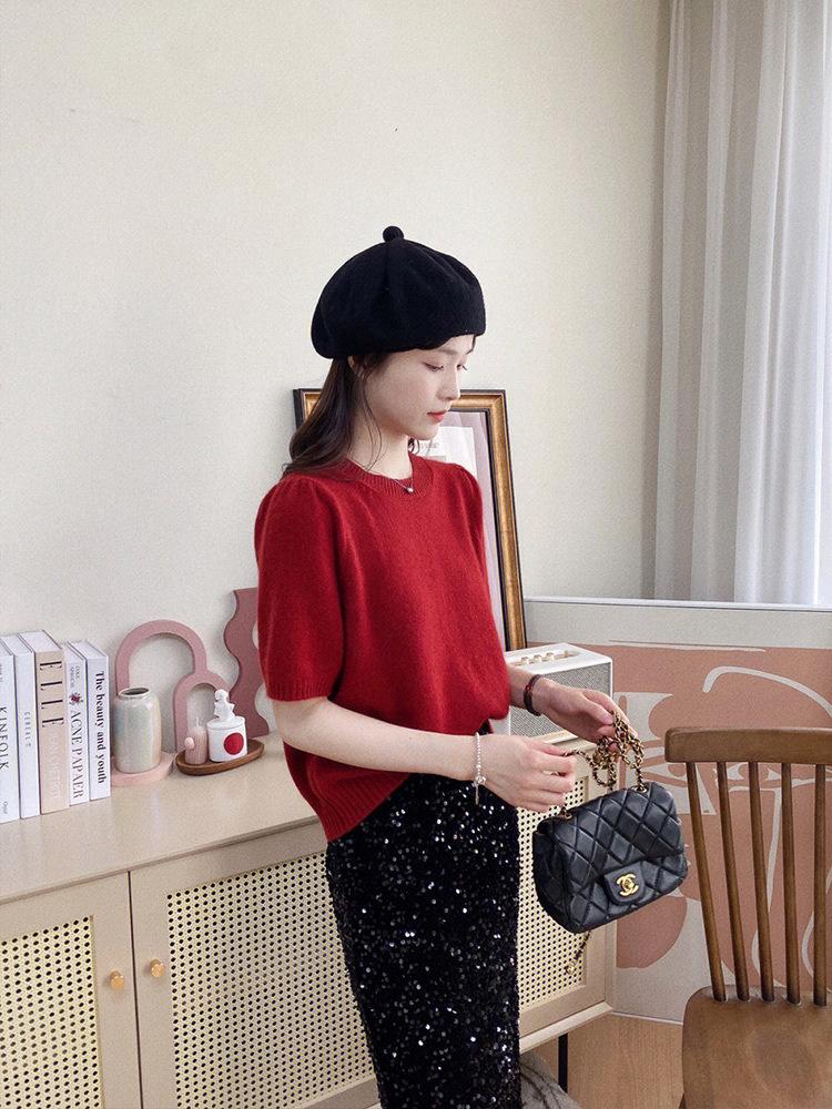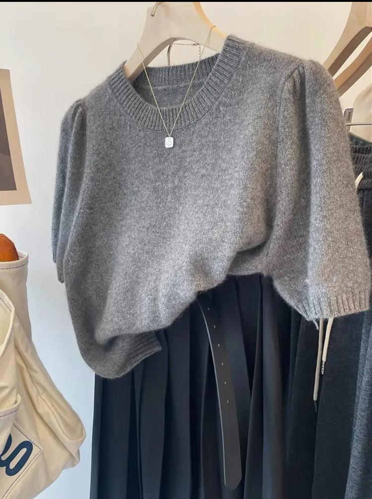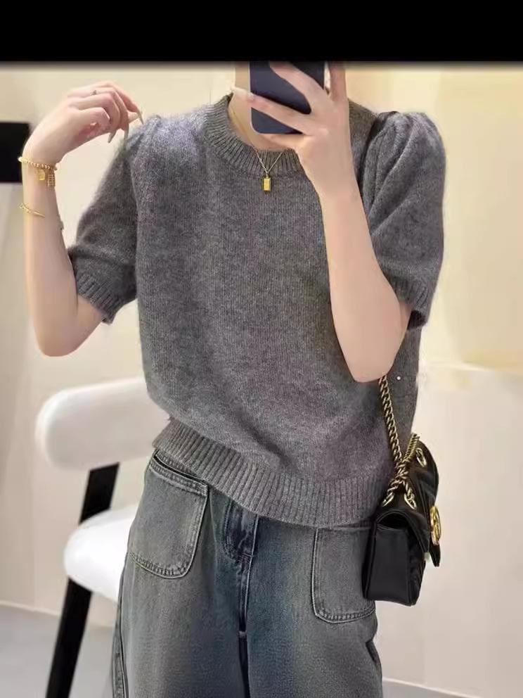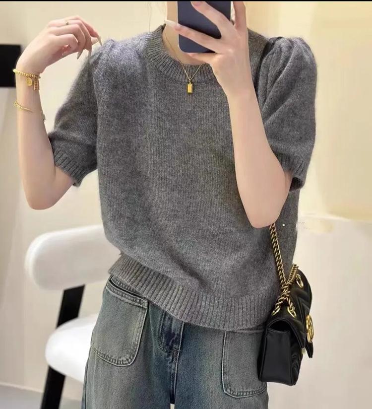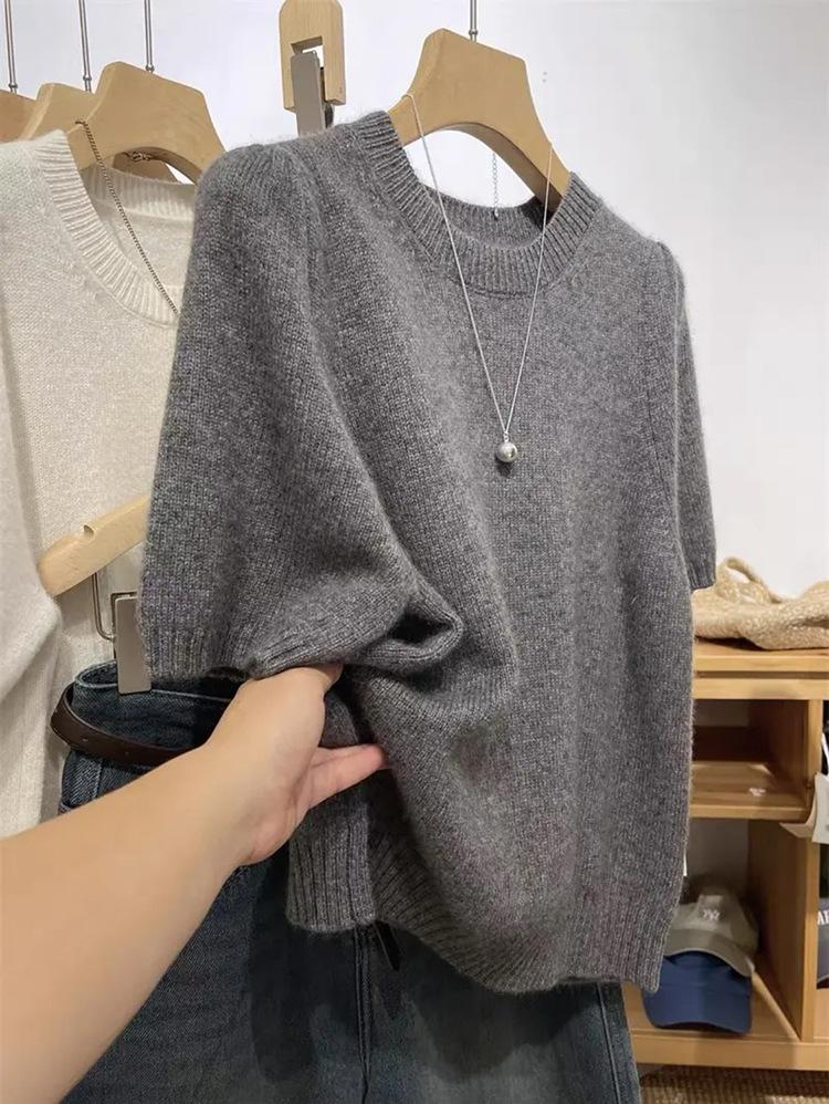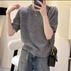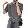 Camiseta de punto de manga corta para mujer, cuello redondo francés, media manga, color liso, elegante, combina con todo, prenda exterior holgada.