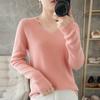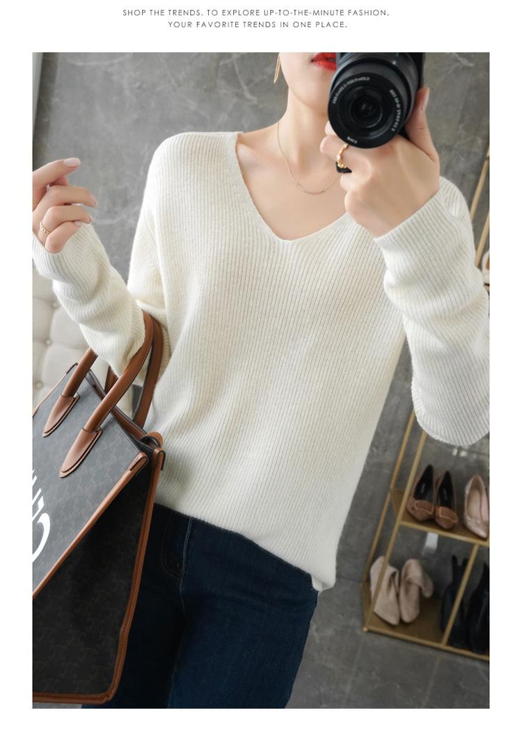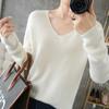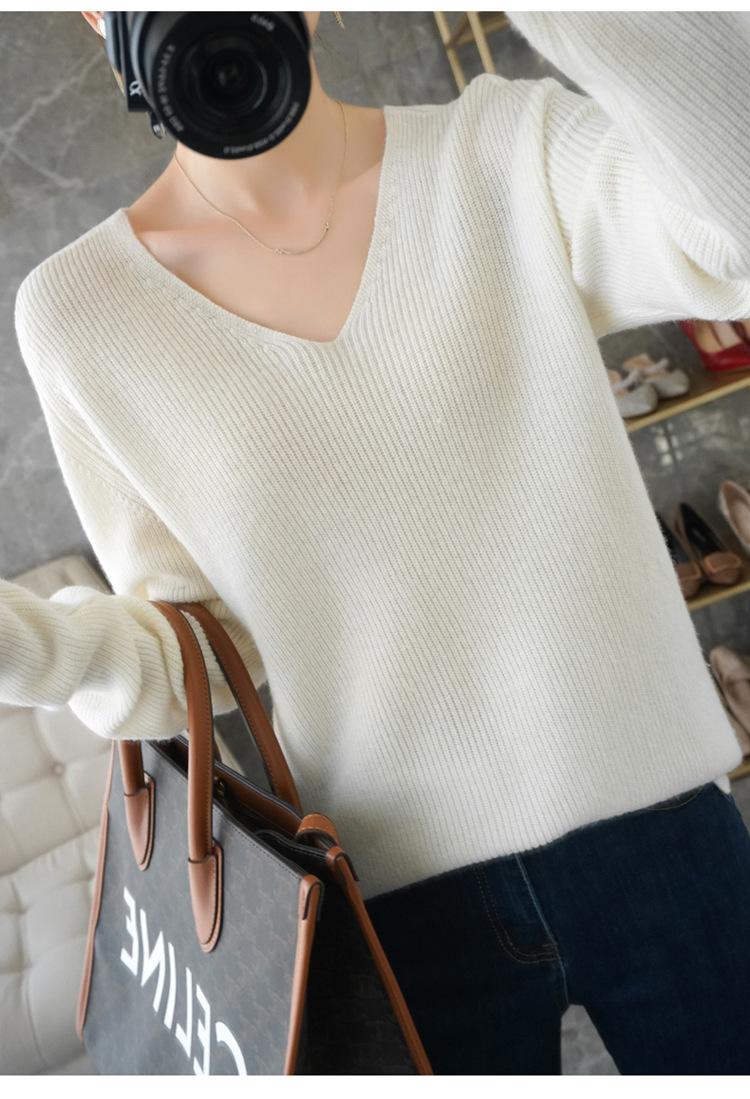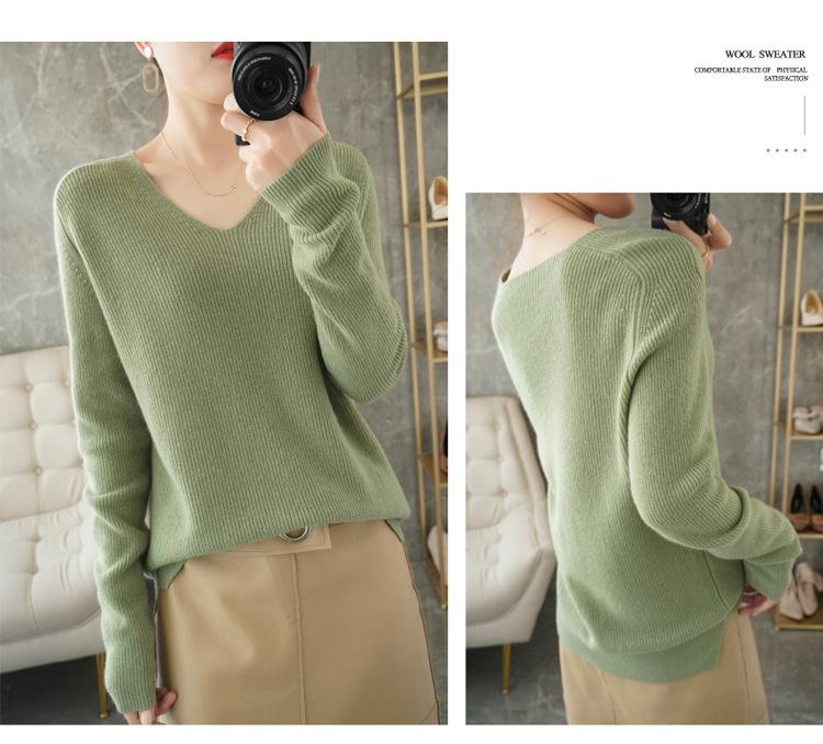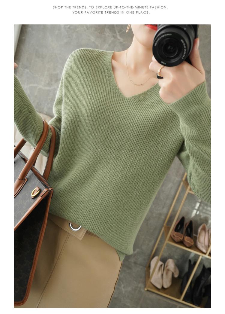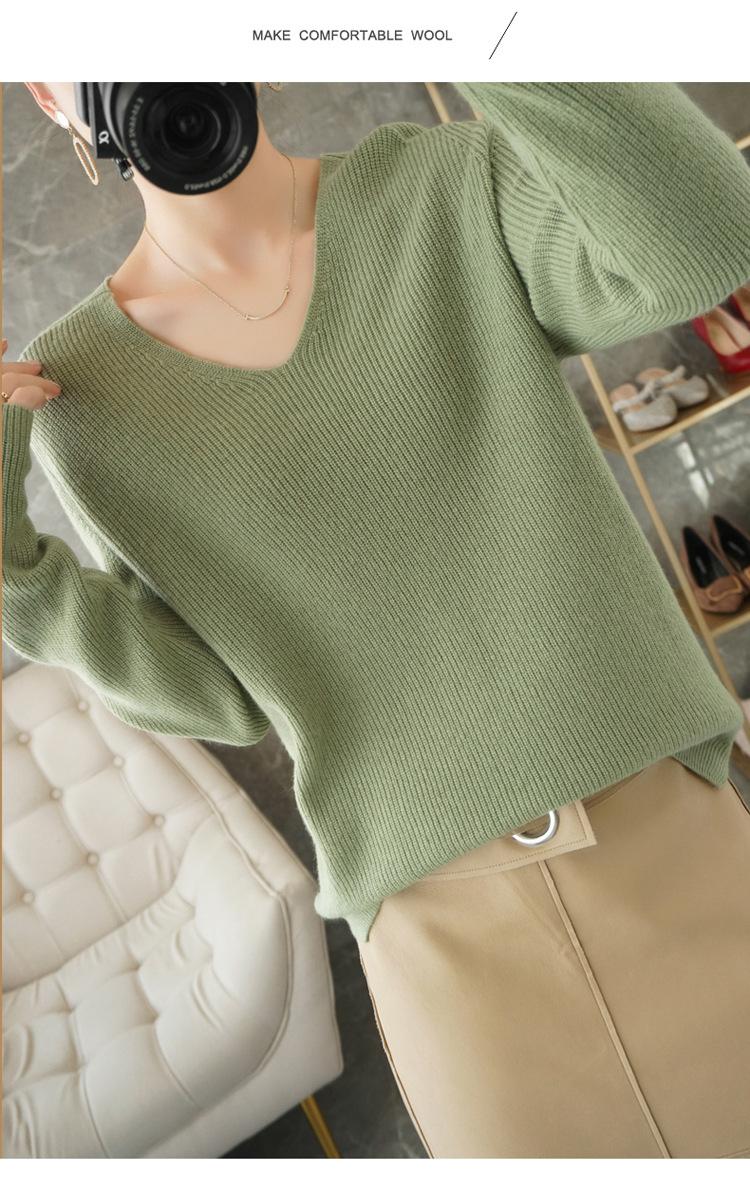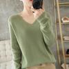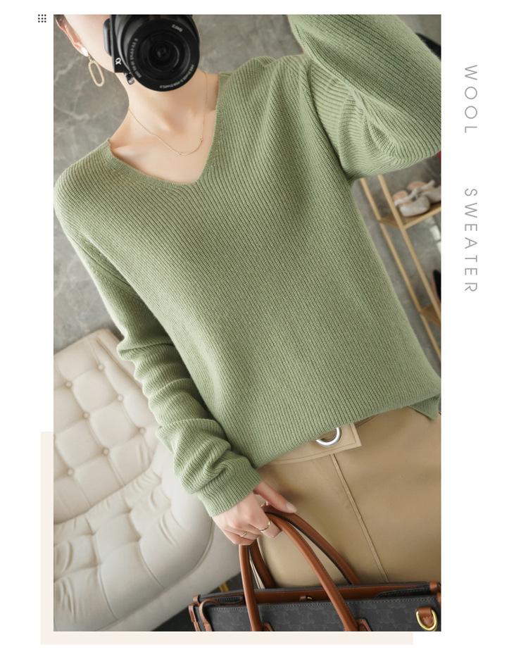 Suéter de lana con cuello en V para mujer, jersey de punto holgado y moderno, camisa adelgazante de color liso.