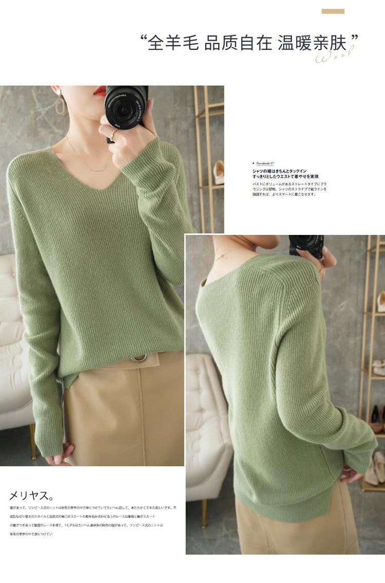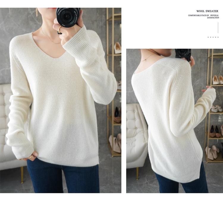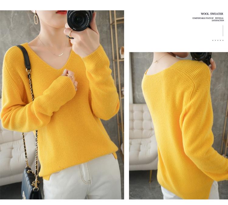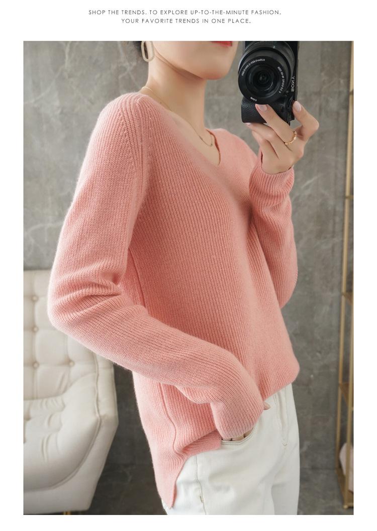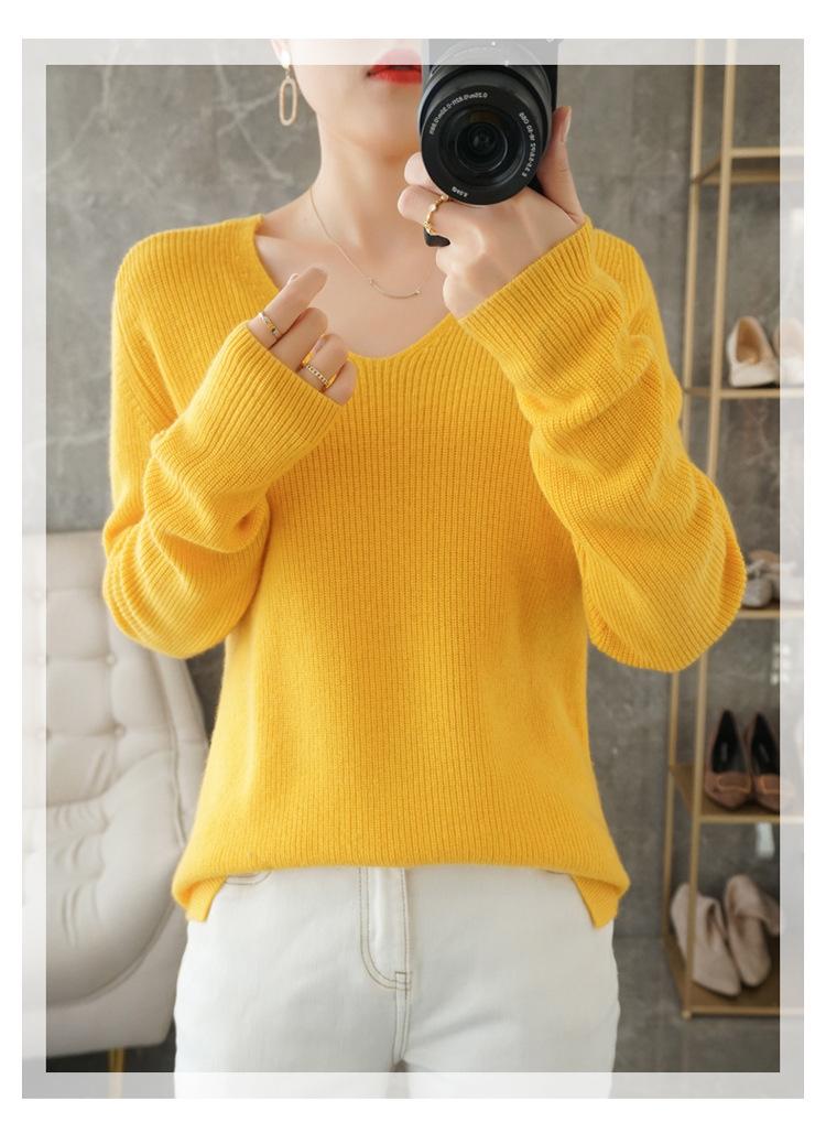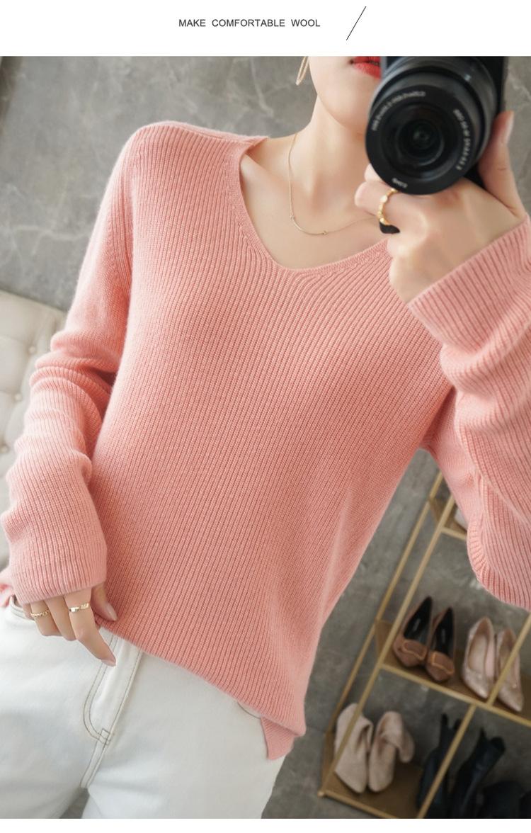 Suéter de lana con cuello en V para mujer, jersey de punto holgado y moderno, camisa adelgazante de color liso.
