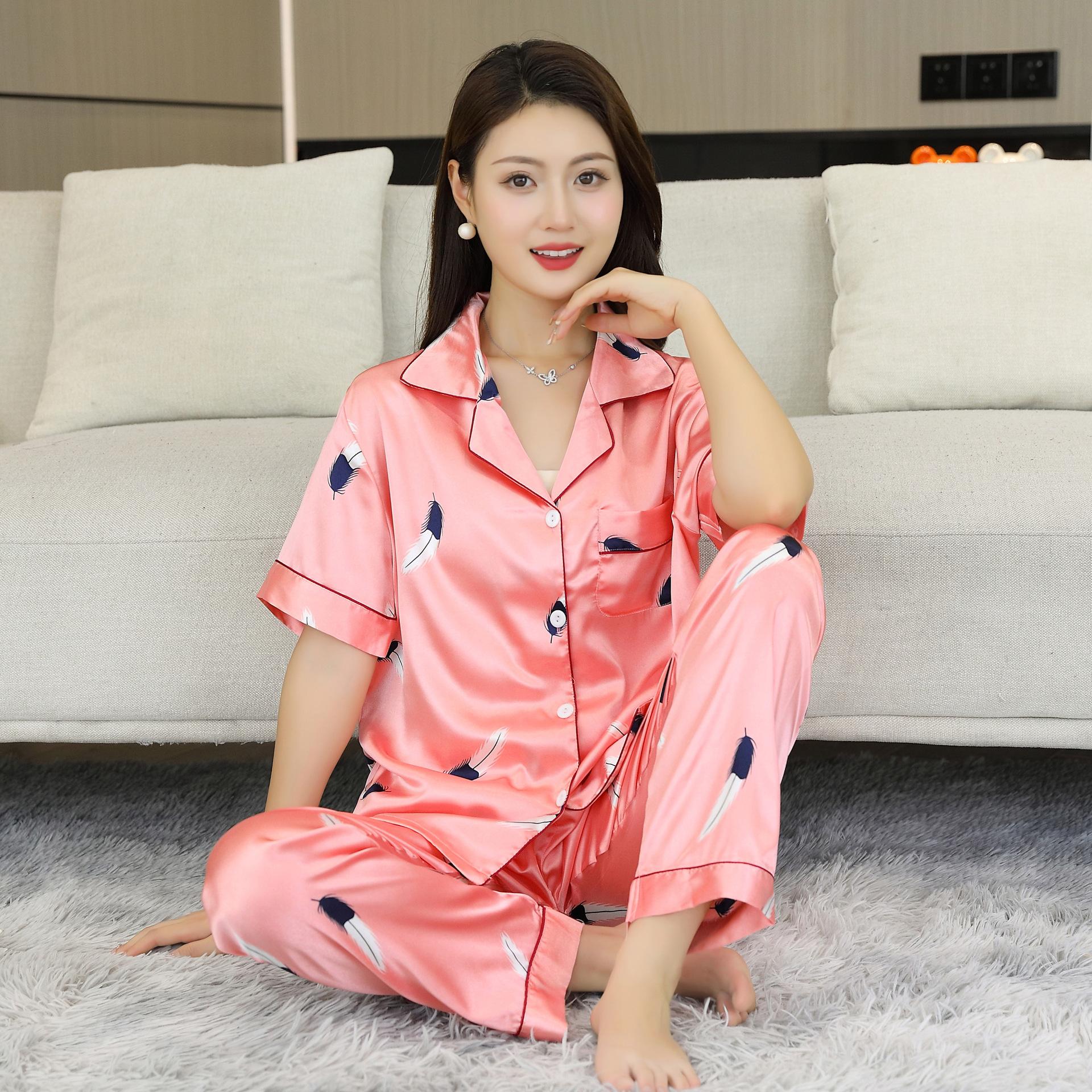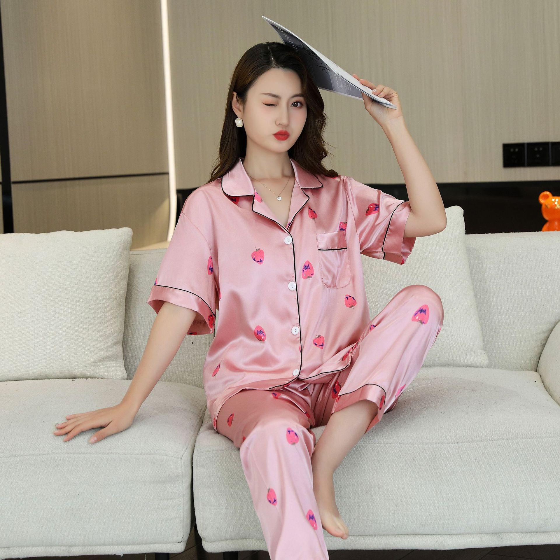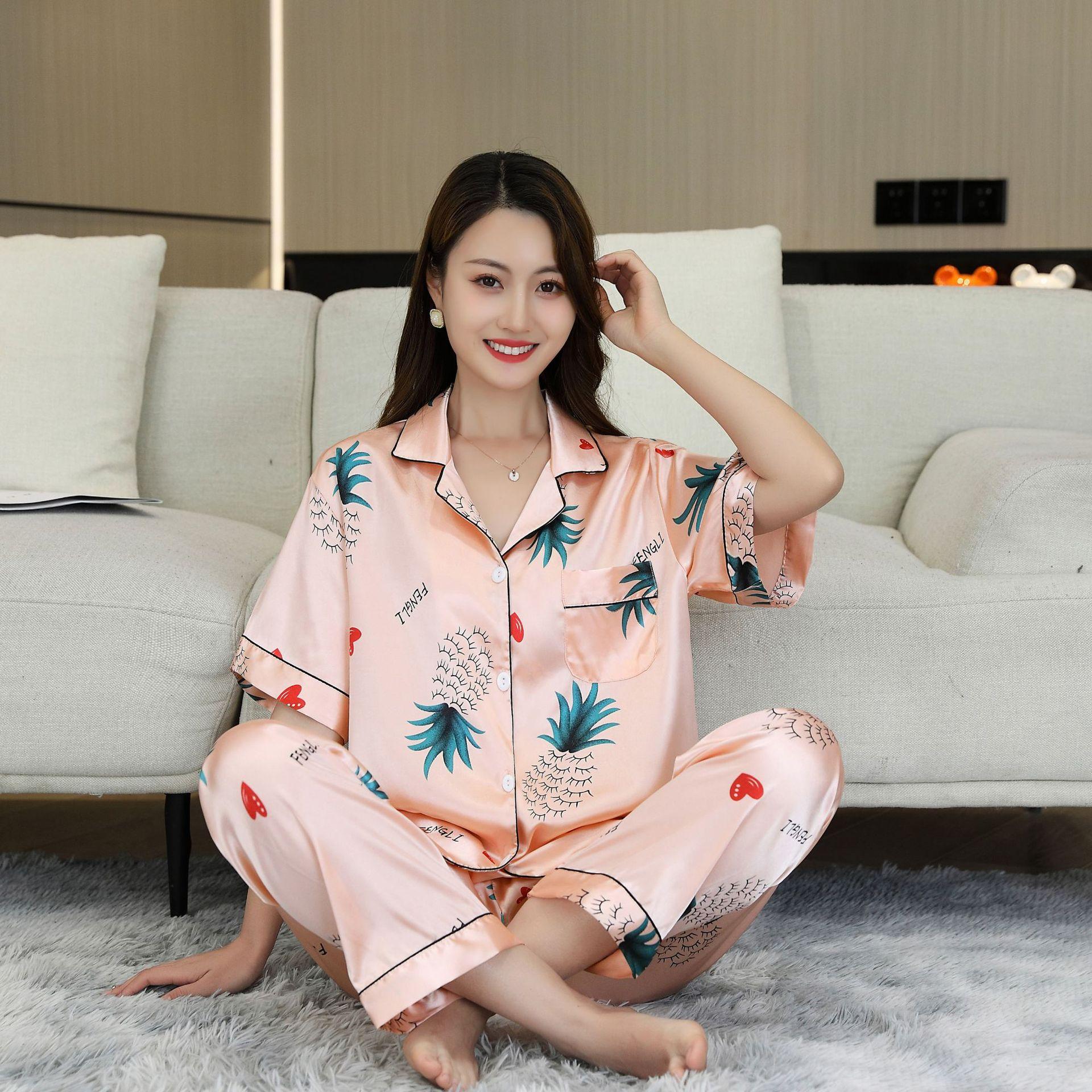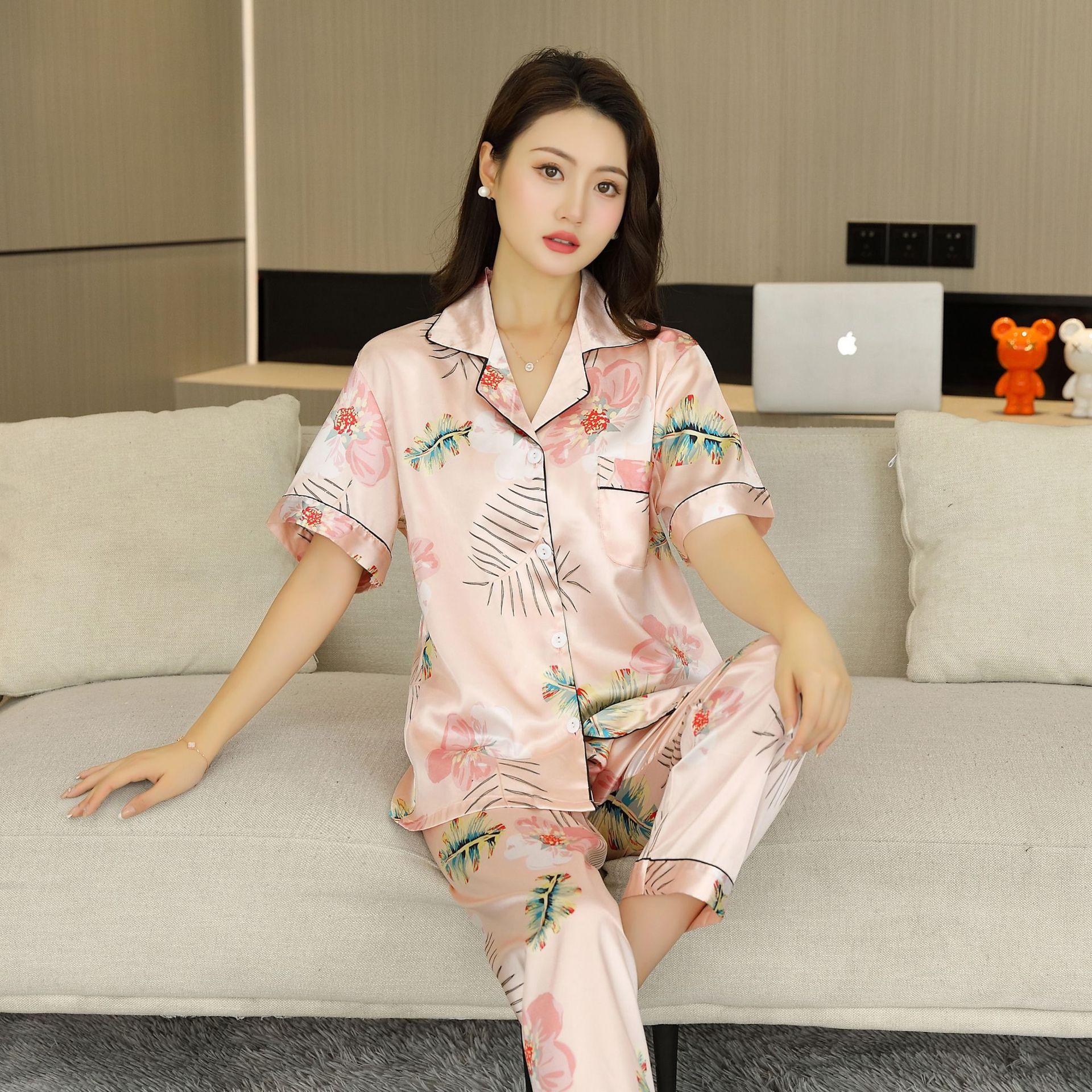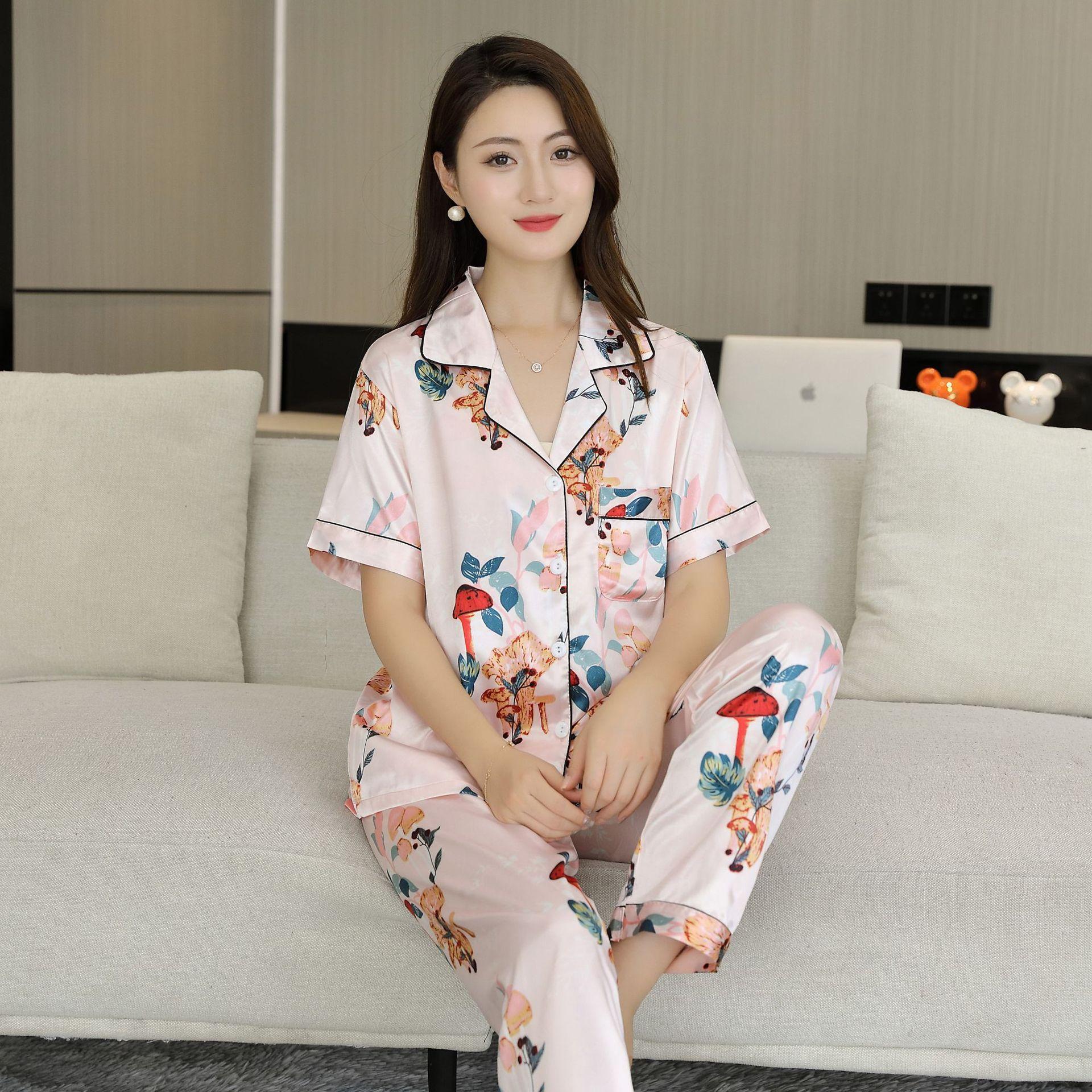 Pijama de Seda de Hielo para Mujer Verano Ropa para el Hogar de Alta Gama Lujo Ligero Manga Corta Pantalón Conjunto de Dos Piezas Pijama de Seda Imitación Estilo Delgado Se Puede Usar Afuera