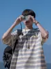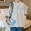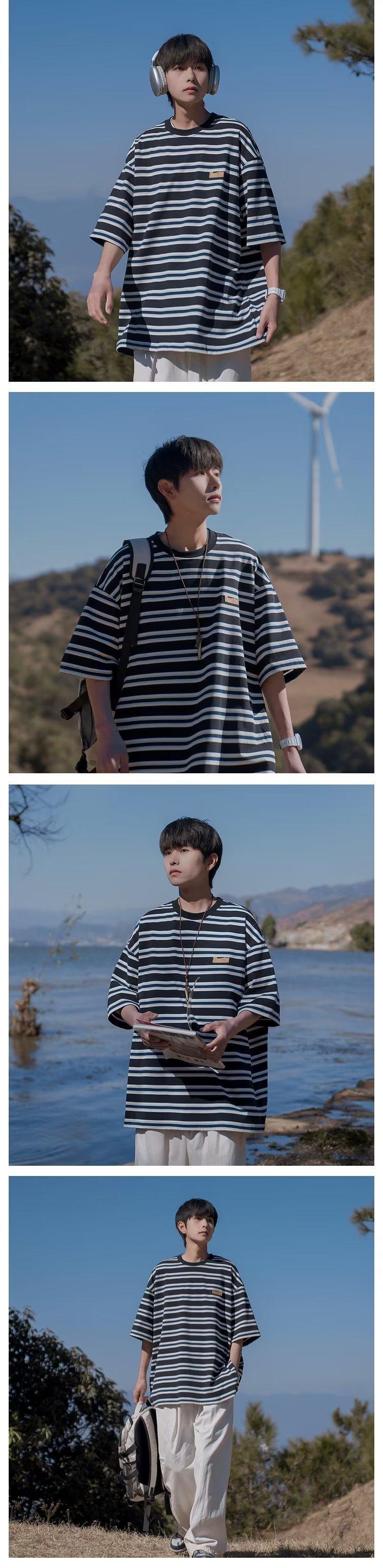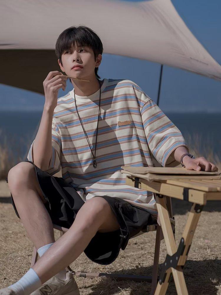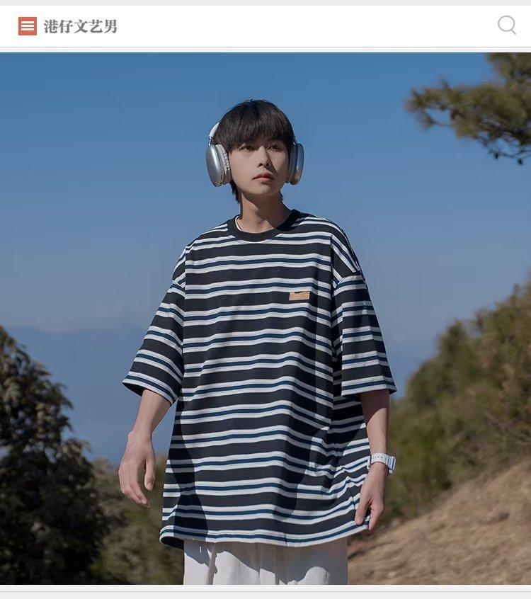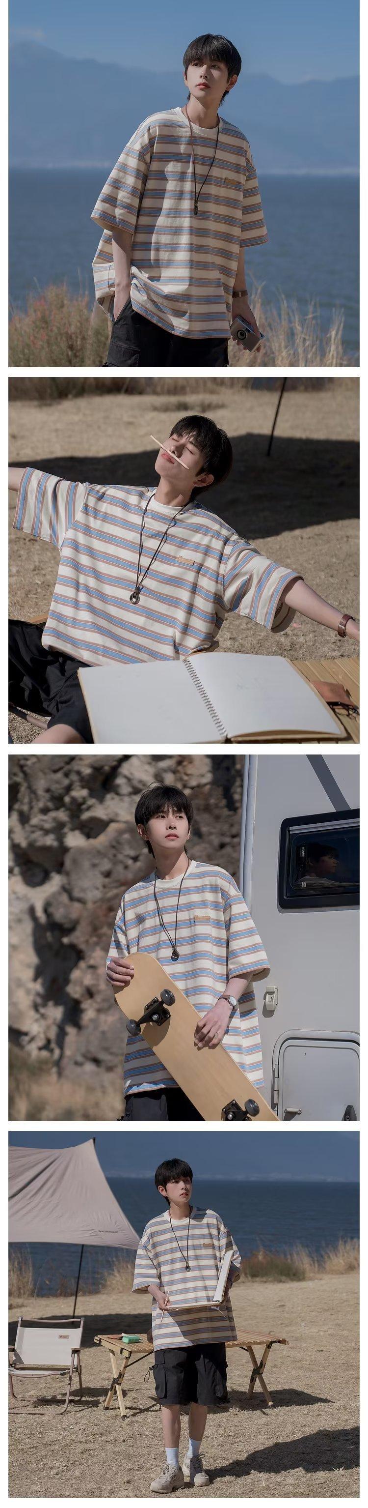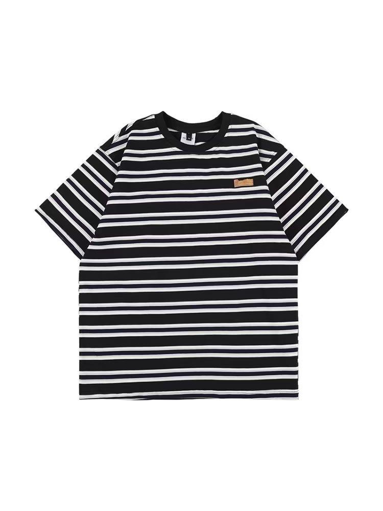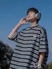 Camiseta de manga corta a rayas japonesas para hombre, estilo americano de verano, estilo retro urbano, marca de moda, camiseta de media manga con cuello redondo y combinación para parejas.
