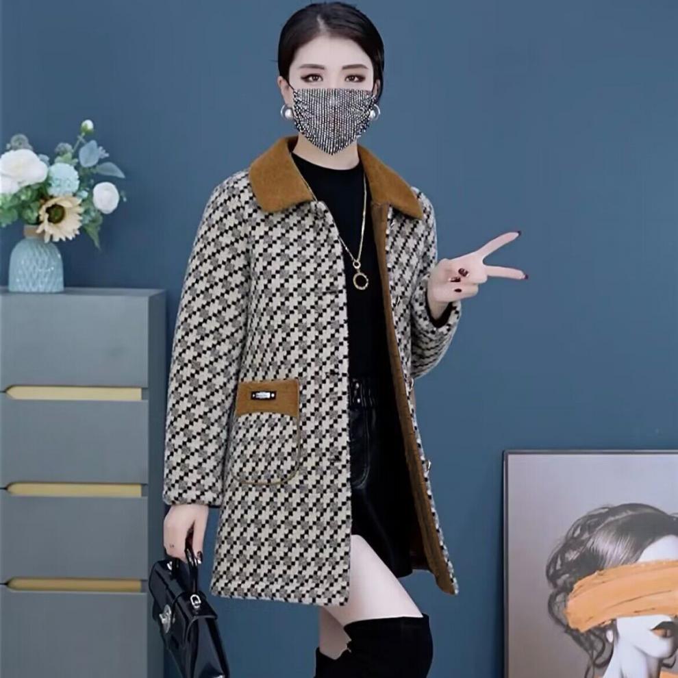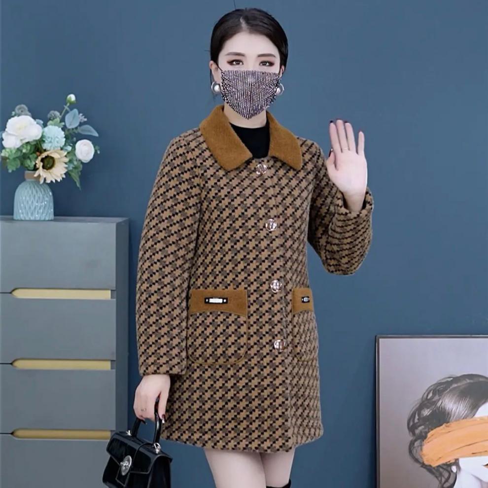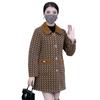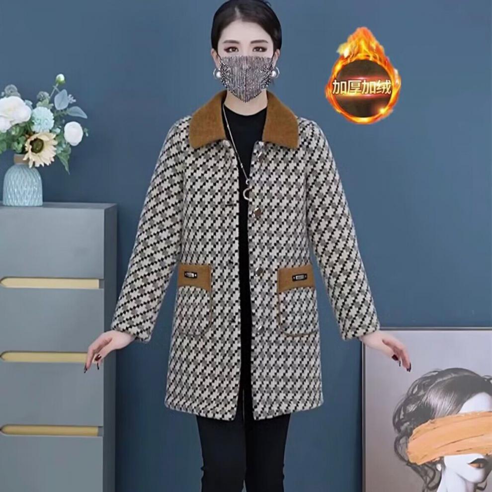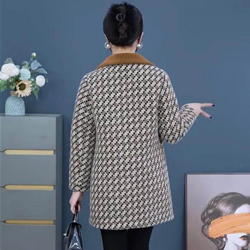 Abrigo largo de estilo occidental de otoño e invierno para madres de mediana edad, nuevas mujeres de mediana edad y mayores que usan cuello cuadrado a cuadros