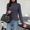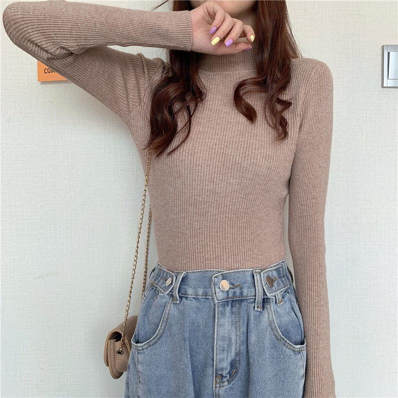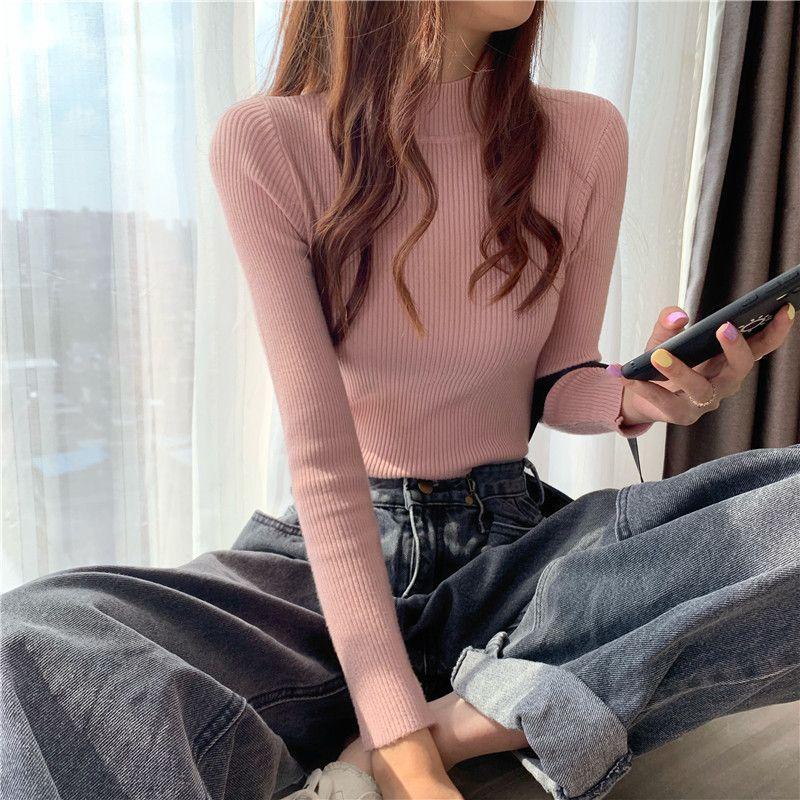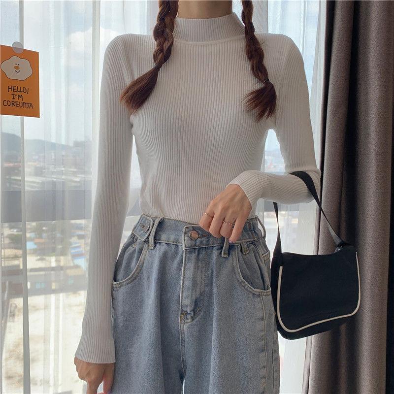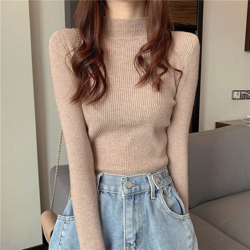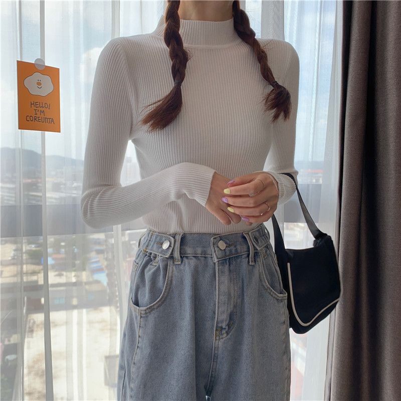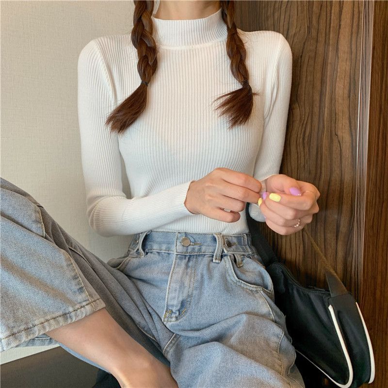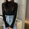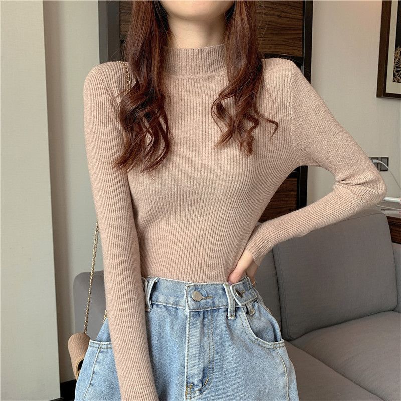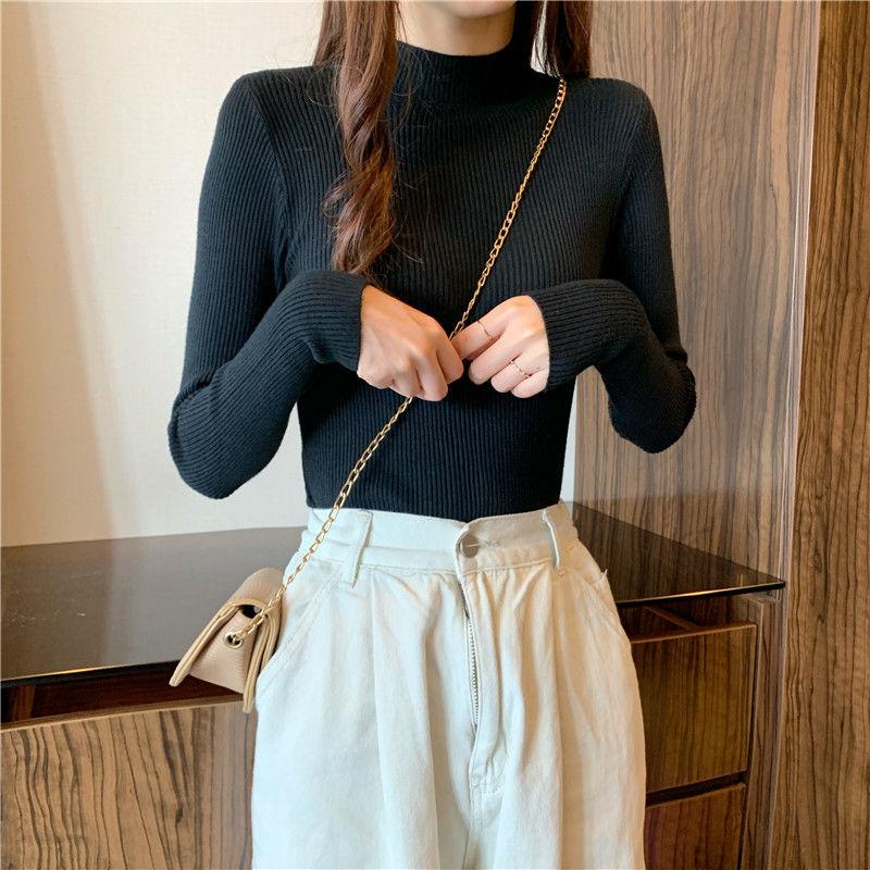 Camiseta básica de punto negro de cuello medio para mujer, nuevo estilo otoño e invierno 2022, suéter de cuello alto medio moderno y entallado