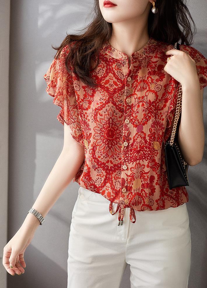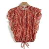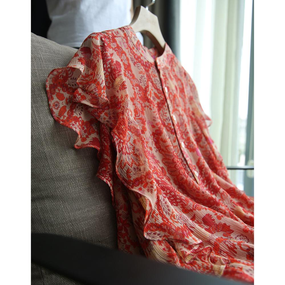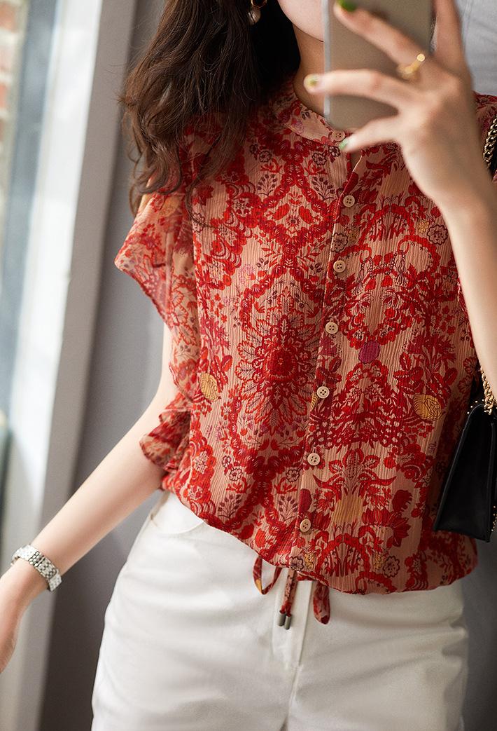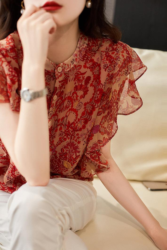 Camisa de gasa de manga corta para mujer, verano 2021, nueva, elegante, estilo occidental, coreana, holgada, estampada, con estampado de hadas, que cubre el vientre.