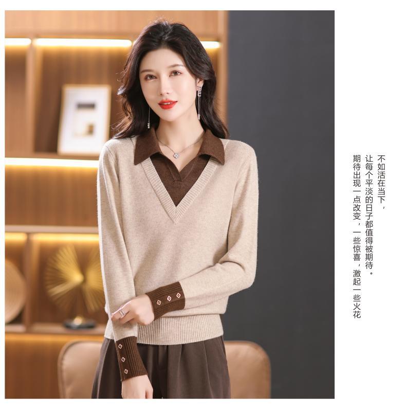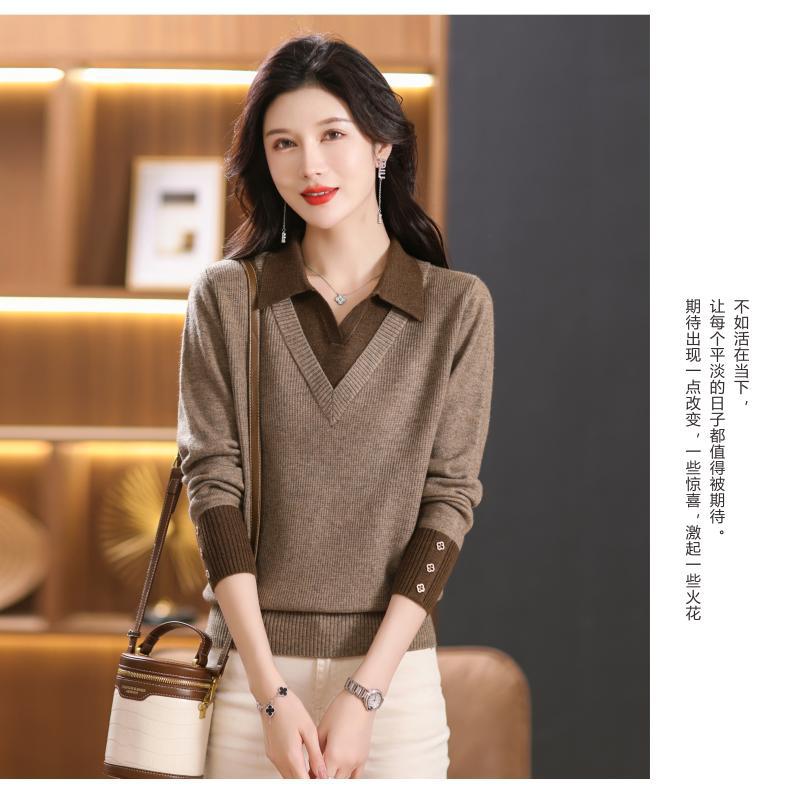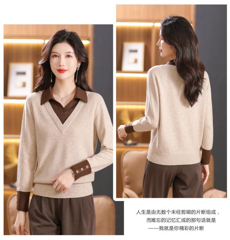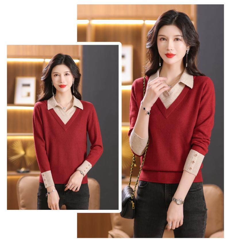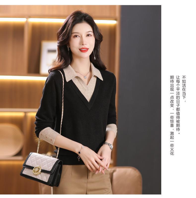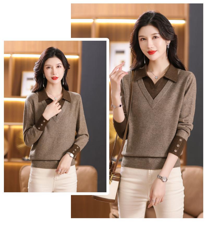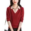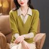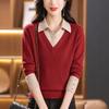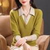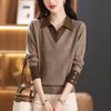 Camiseta de punto de fondo de costura falsa de dos piezas para mujer primavera y otoño 2023 Nuevo suéter de solapa suelto de talla grande para mujer estilo occidental