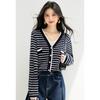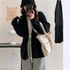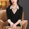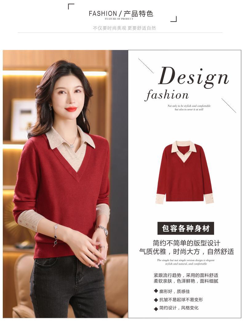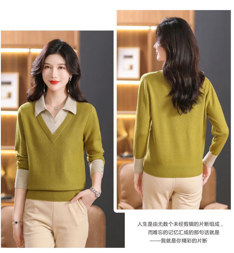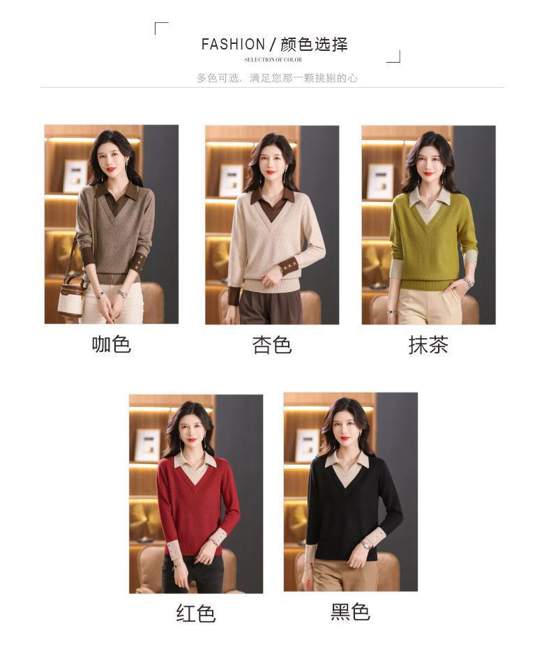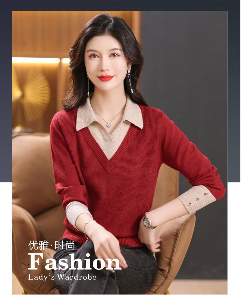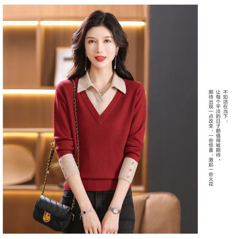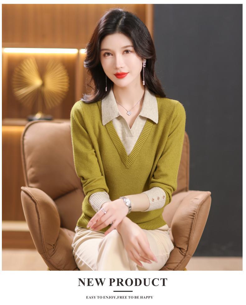 Camiseta de punto de fondo de costura falsa de dos piezas para mujer primavera y otoño 2023 Nuevo suéter de solapa suelto de talla grande para mujer estilo occidental