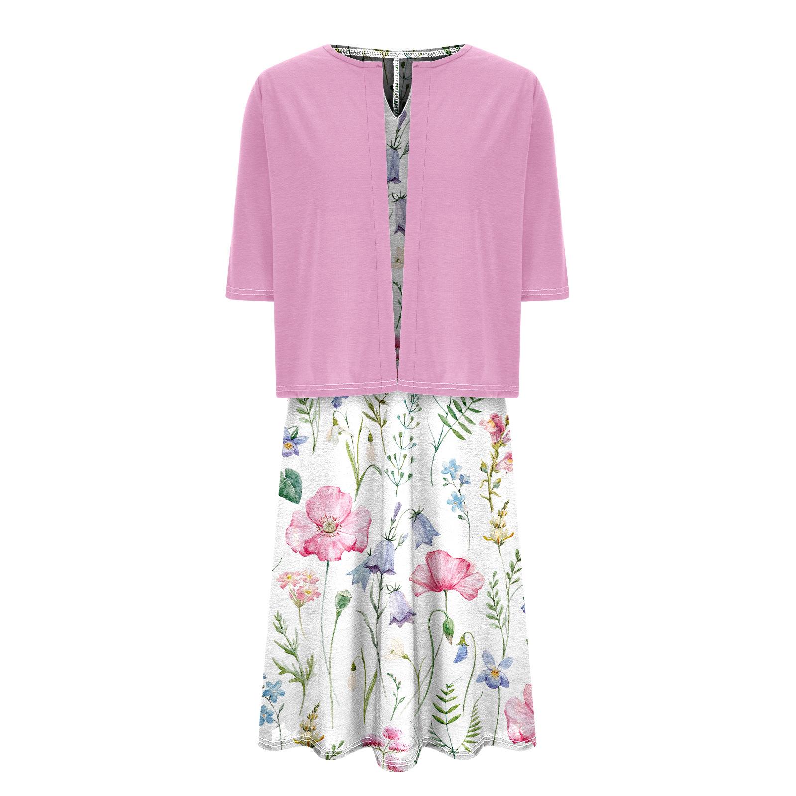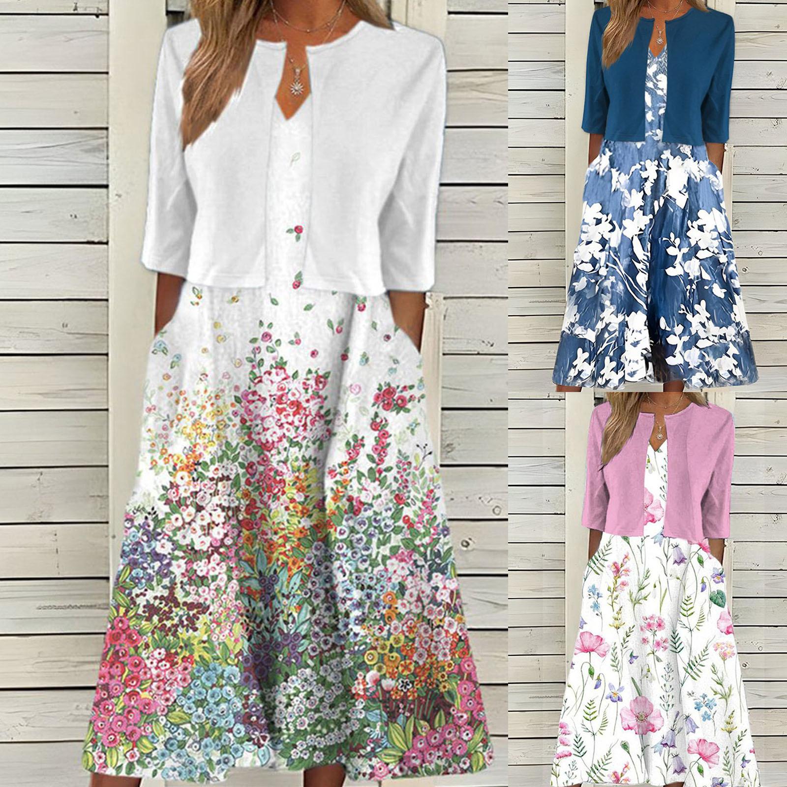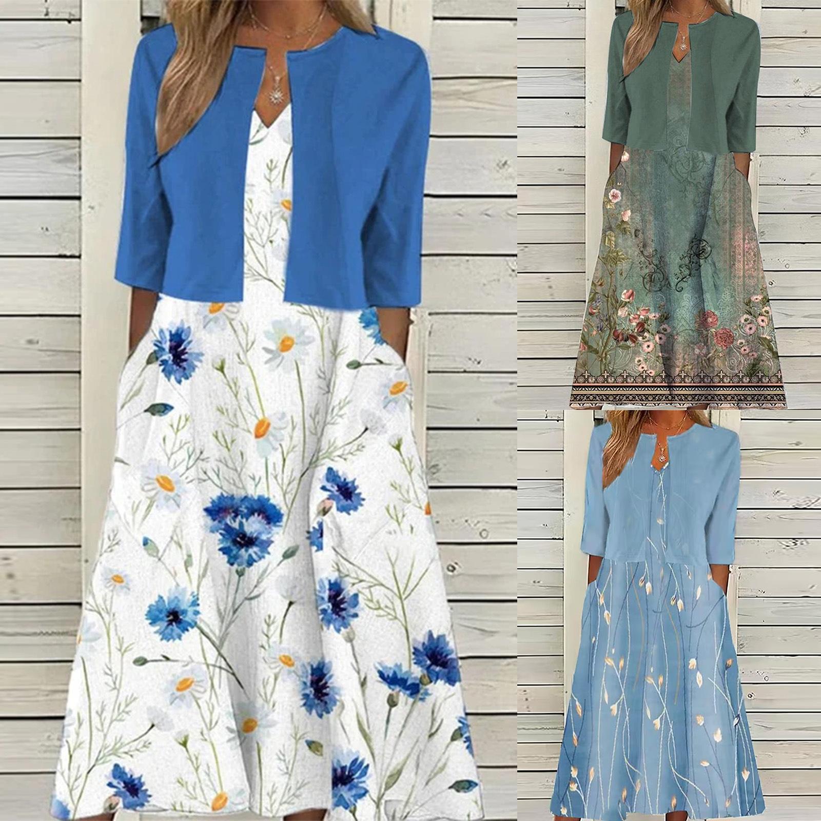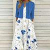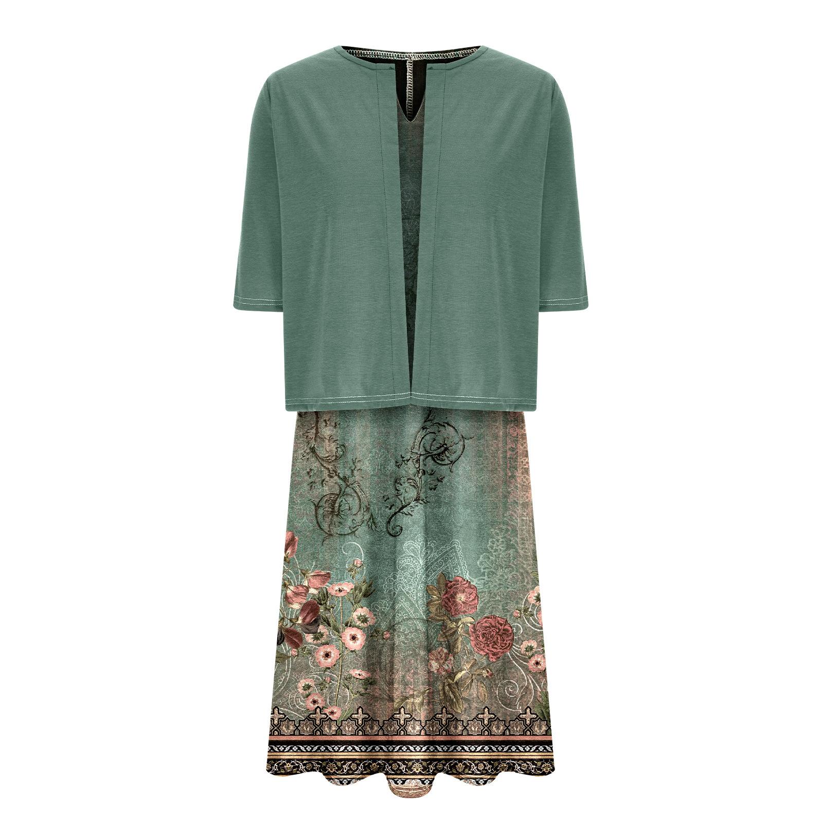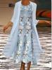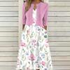 [Talla Grande] Vestido Chaleco Elegante Estilo Étnico con Estampado Floral y Chaqueta Cárdigan de Manga Media Conjunto de Dos Piezas