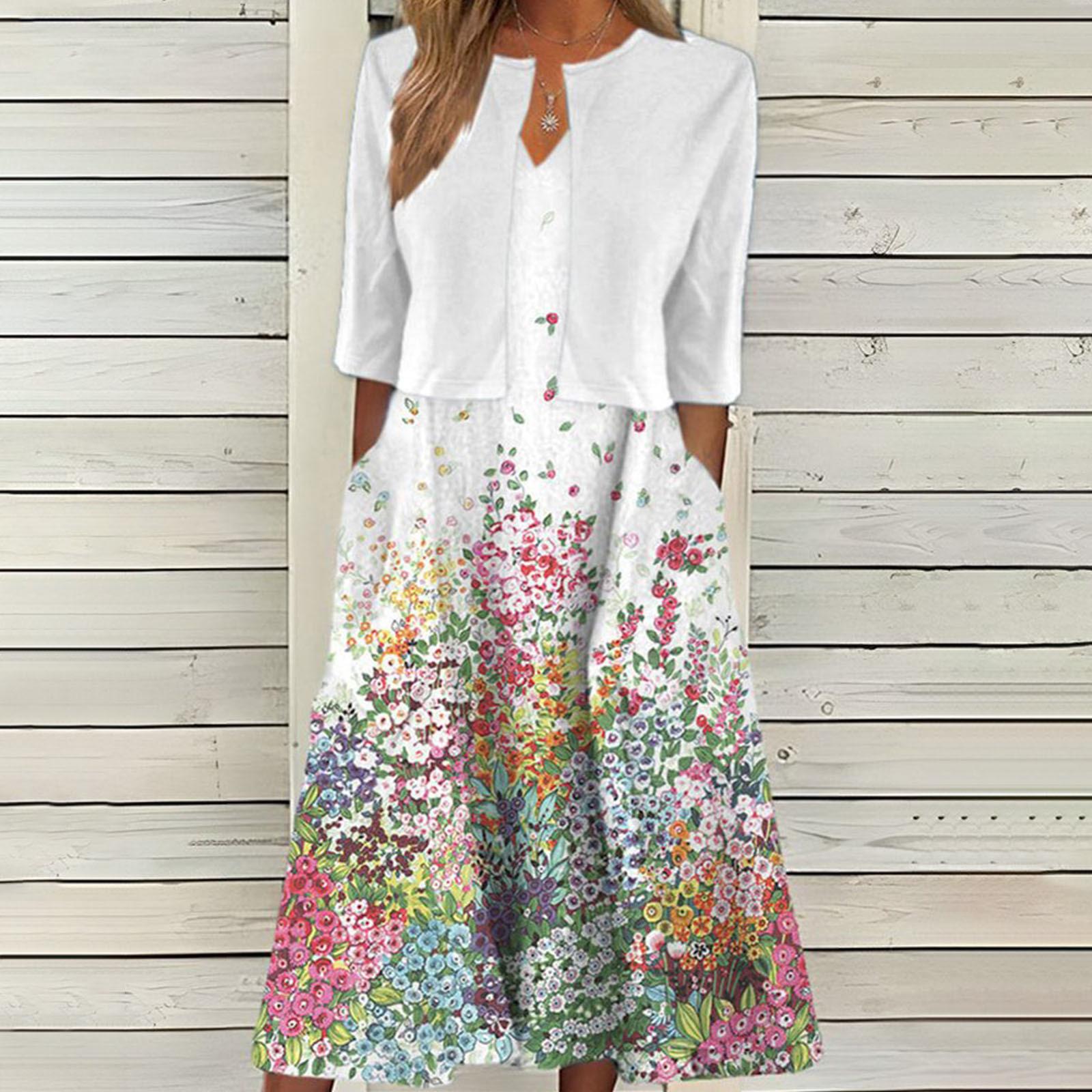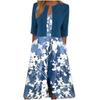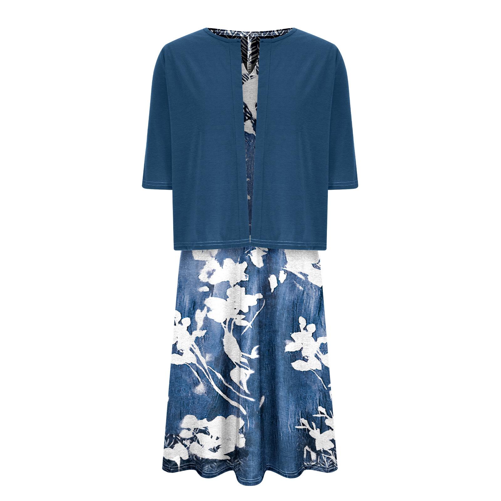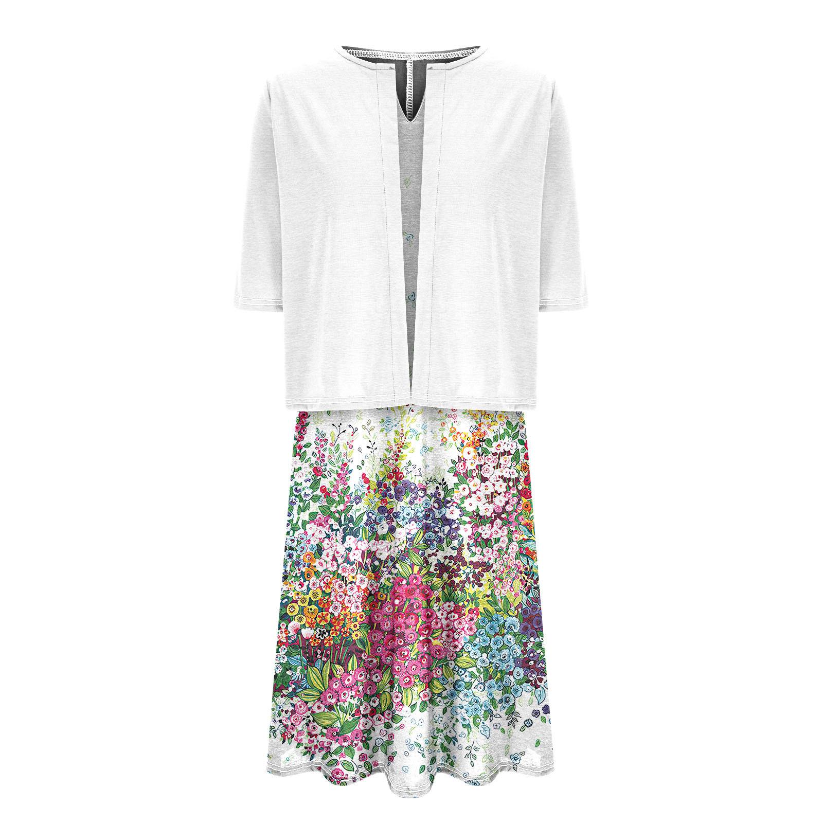 [Talla Grande] Vestido Chaleco Elegante Estilo Étnico con Estampado Floral y Chaqueta Cárdigan de Manga Media Conjunto de Dos Piezas