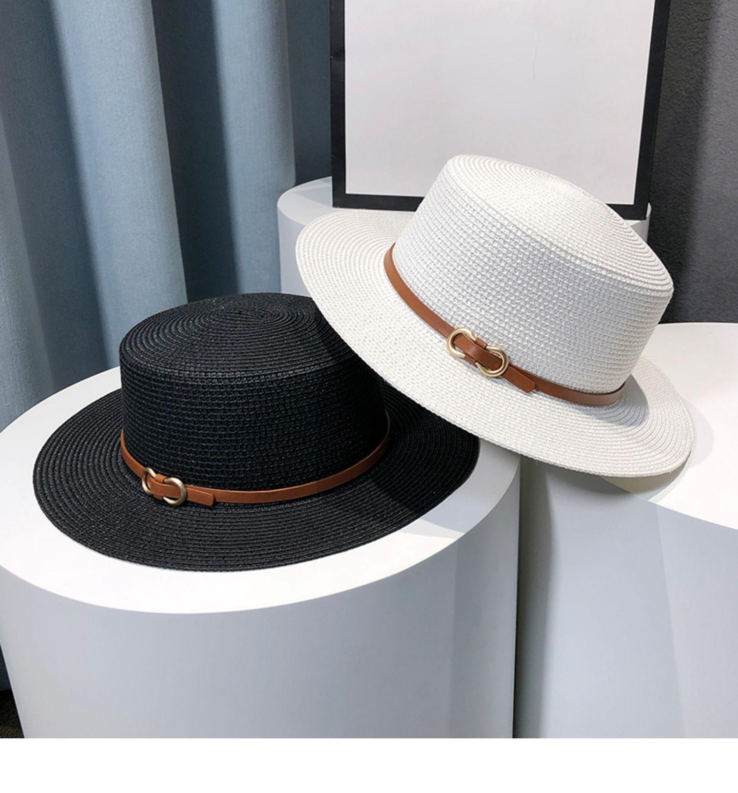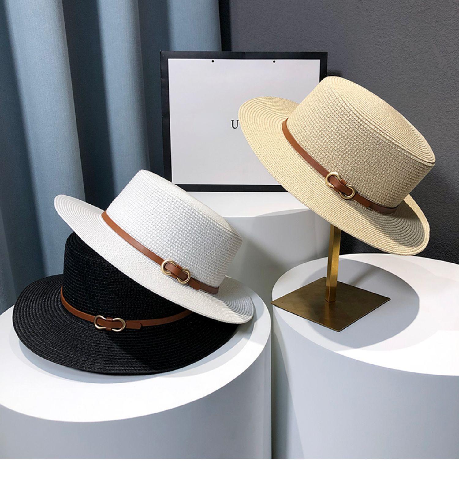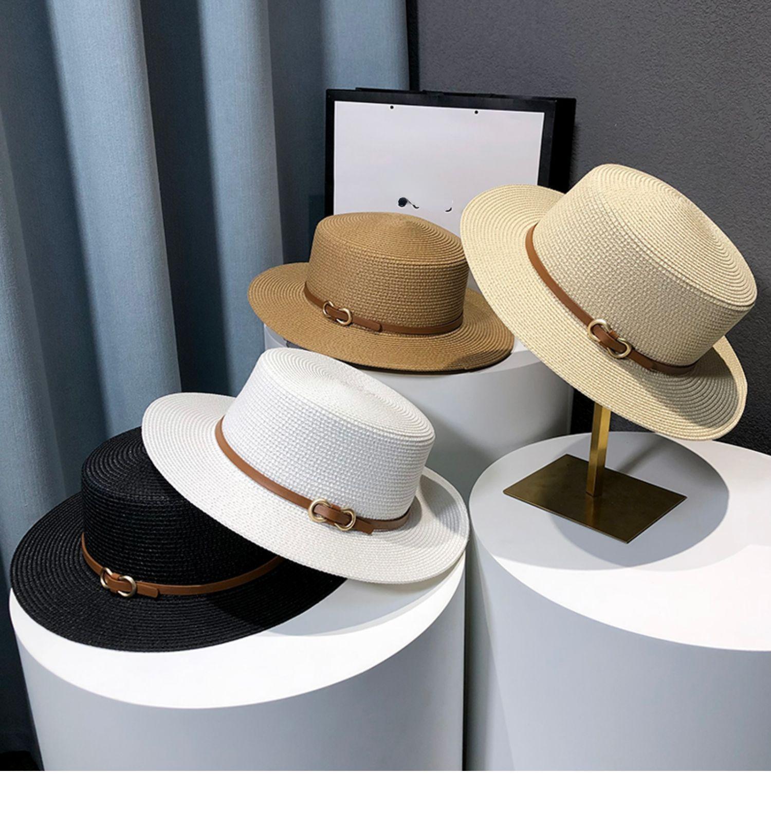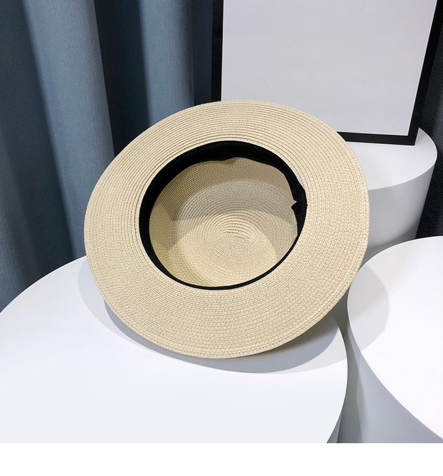 Sombrero de Paja de Copa Plana Estilo Francés para Mujer Sombrilla Verano Tejido de Paja Sombrero de Copa Plana Lateral Vacaciones de Viaje Playa Mar Protector Solar Sombrero de Sol