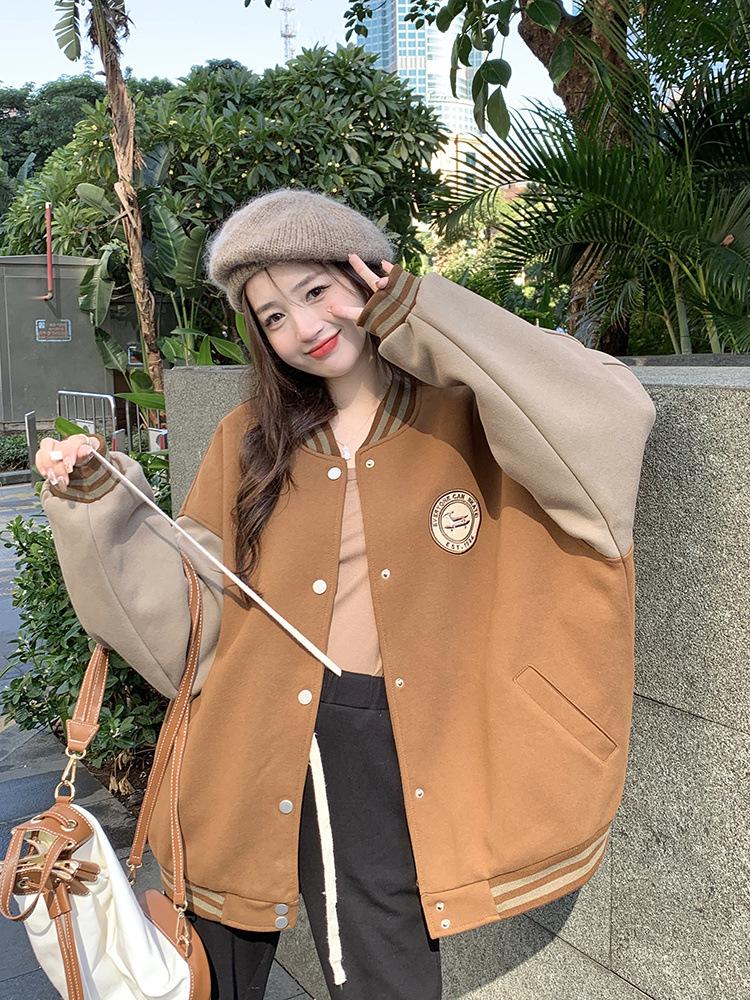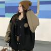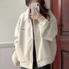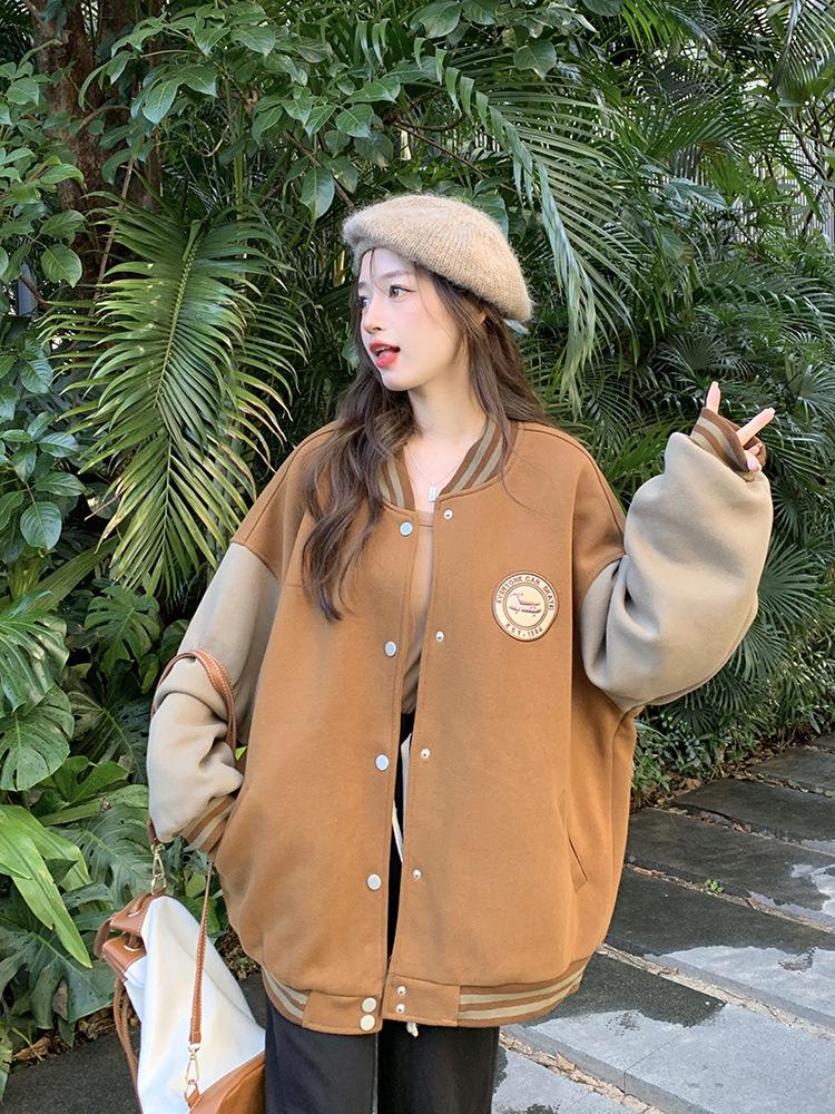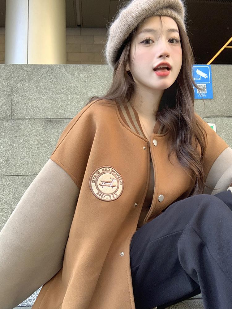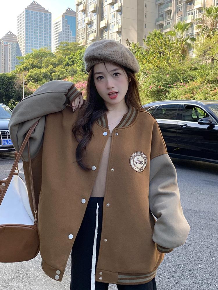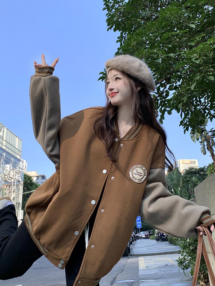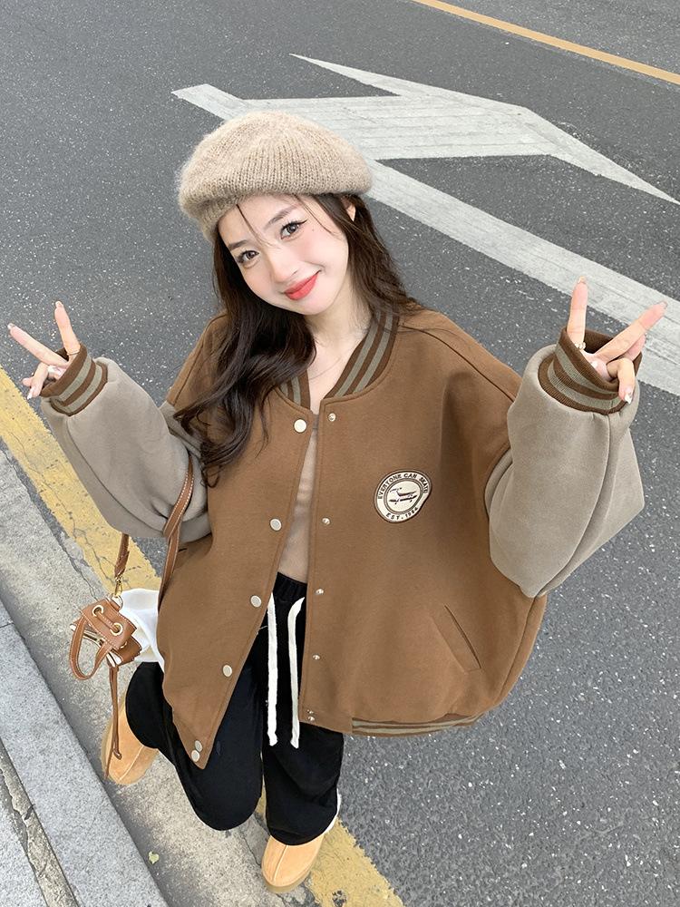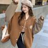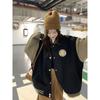Chamarra de béisbol de estilo holgado para mujer, otoño e invierno, con forro polar grueso, retro, cárdigan suelto, suéter casual, moda estudiantil ins