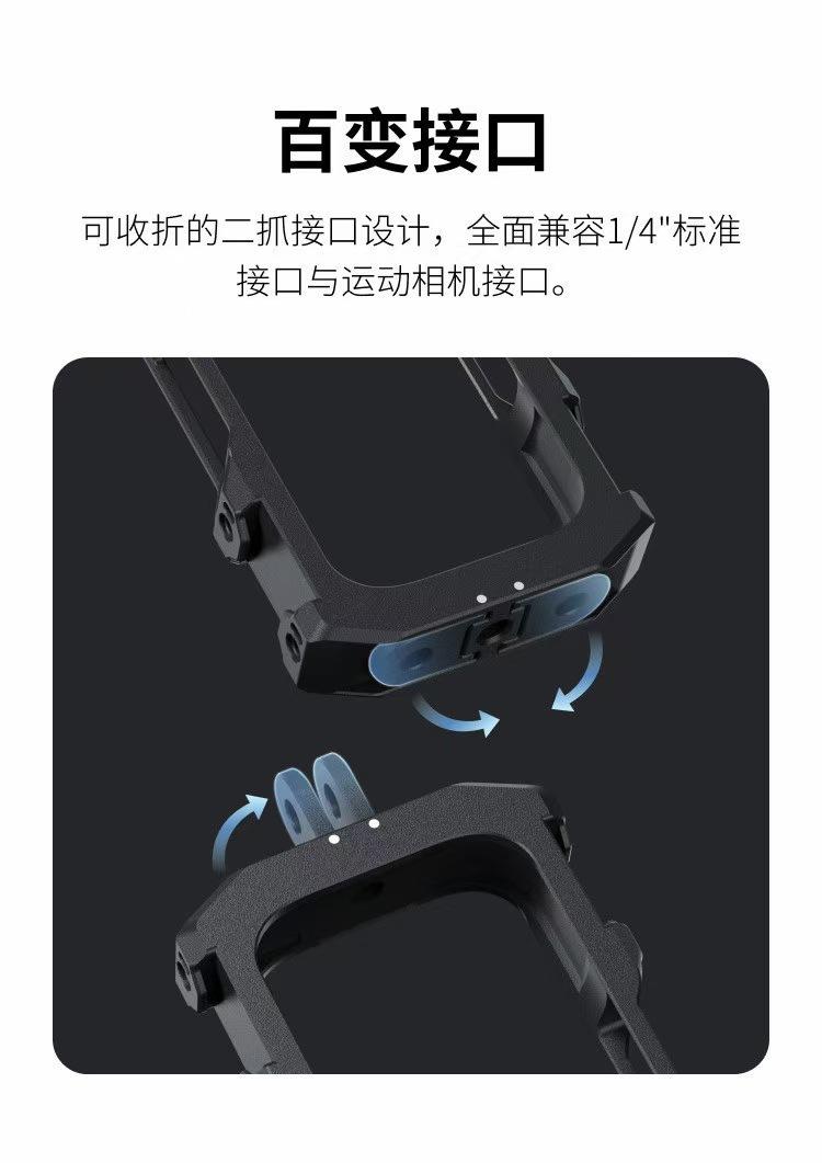 El diseño de la ventana es práctico y conveniente, con puerto de carga USB rápido, fácil desmontaje y operación, interfaz de zapata fría de expansión dual en el marco, admite disparo horizontal y vertical, compatible con interfaz estándar de 1/4 e interfaz de cámara deportiva, puede instalar luces de relleno duales y micrófonos al mismo tiempo