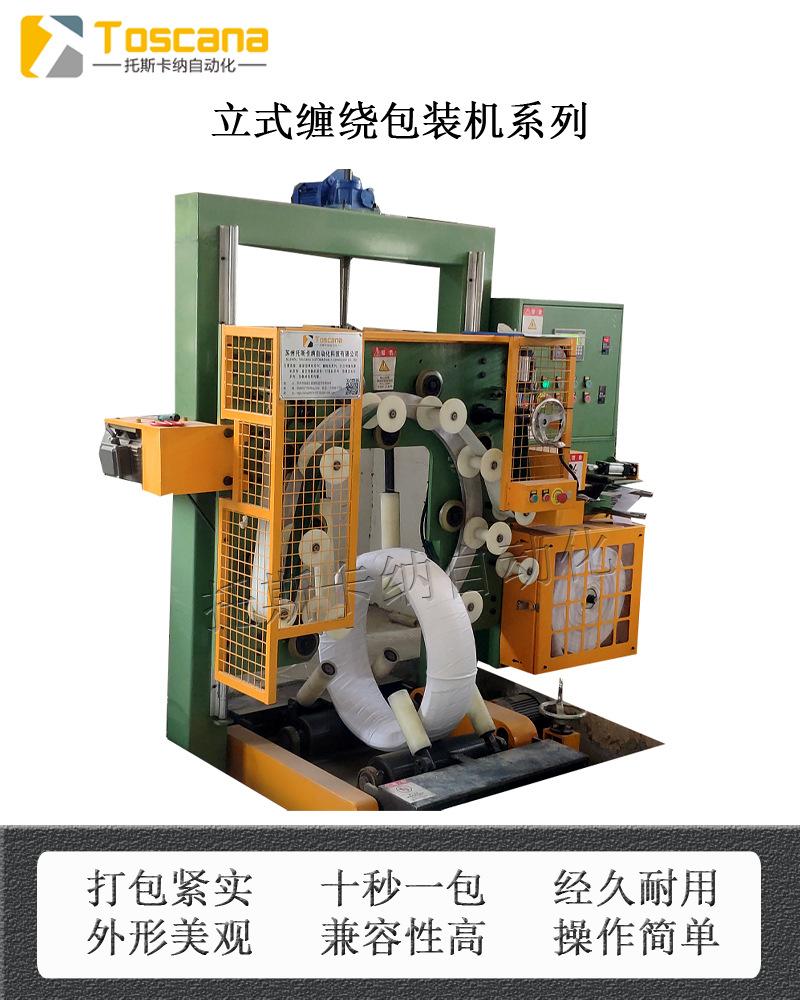 La máquina enfardadora de anillos de la serie TS-GS es una novedosa máquina enfardadora especialmente investigada, diseñada y fabricada por nuestra empresa para las industrias metalúrgica y del caucho. Tiene un buen efecto protector contra el óxido, la corrosión y el polvo de objetos en forma de anillo como flejes de acero. Se puede utilizar para el embalaje exterior de flejes de acero, flejes de cobre, flejes de aluminio, alambres de acero, mangueras, neumáticos, cables y otros objetos en forma de anillo. Esta máquina tiene las ventajas de una entrada y salida convenientes de los objetos embalados, un amplio rango de embalaje por bobinado, operación simple y ajuste conveniente. Después del embalaje por bobinado, el producto puede reducir el desgaste superficial del producto, mejorar el sellado y facilitar el almacenamiento y transporte del producto. Después del embalaje por bobinado, el producto no solo tiene una apariencia hermosa, sino que también tiene buenas funciones a prueba de humedad, a prueba de polvo, a prueba de óxido, antienvejecimiento y a prueba de daños accidentales.
