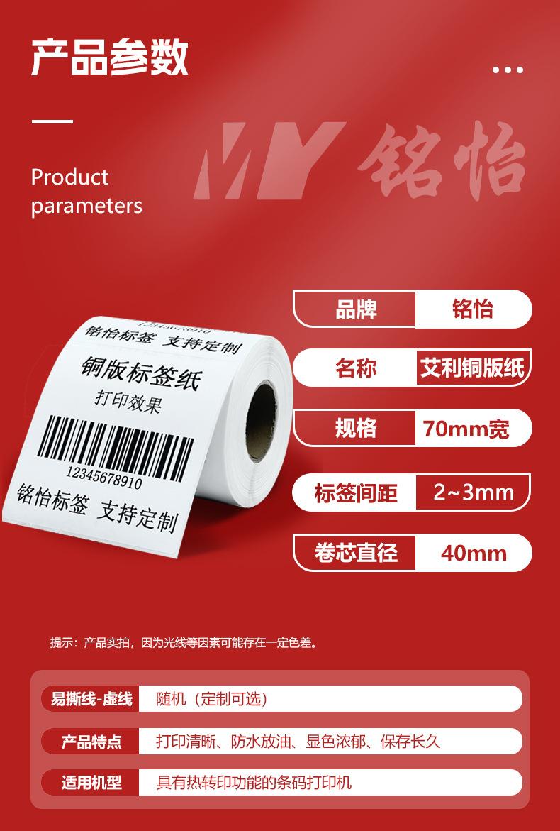 Papel autoadhesivo de placa de cobre Mingyi, papel de impresión, hoja de superficie exprés, impresión de código de barras, etiqueta adhesiva de 70 mm de ancho