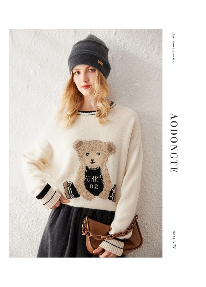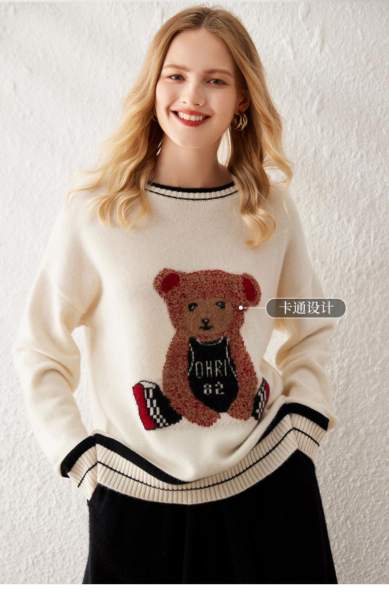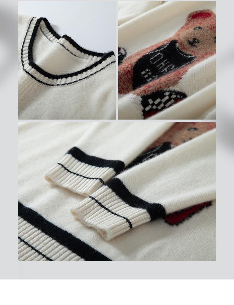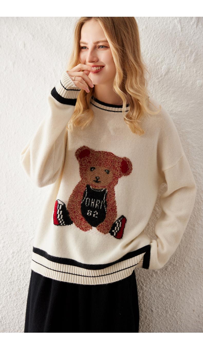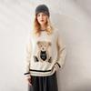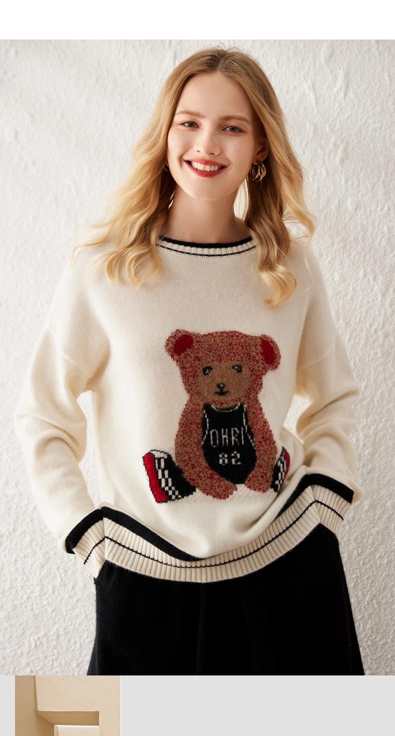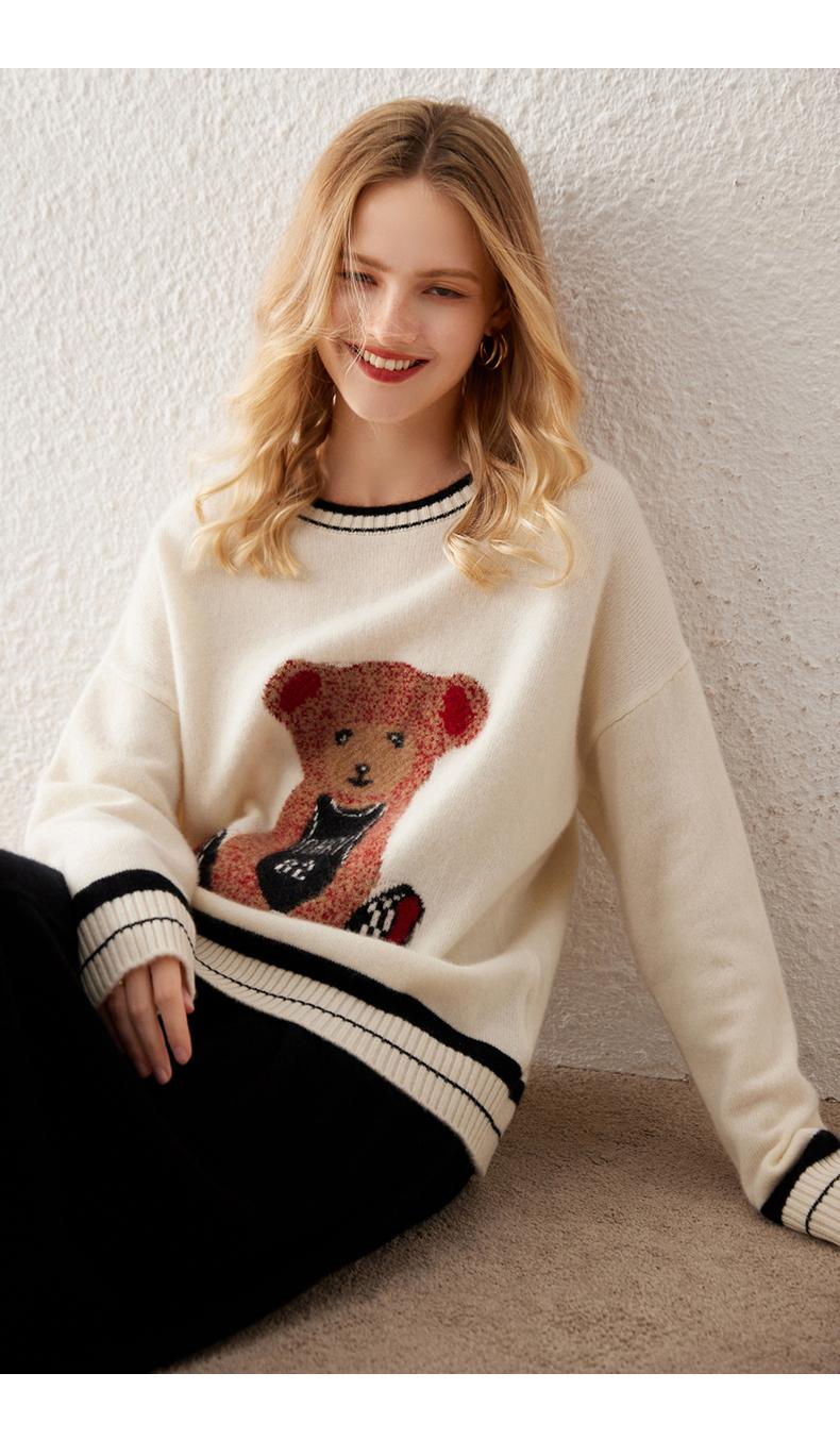 Suéter de cachemira jacquard de oso blanco de cuello redondo para mujer 100% cachemira neta manga de hombro caído suelto suéter tejido grueso