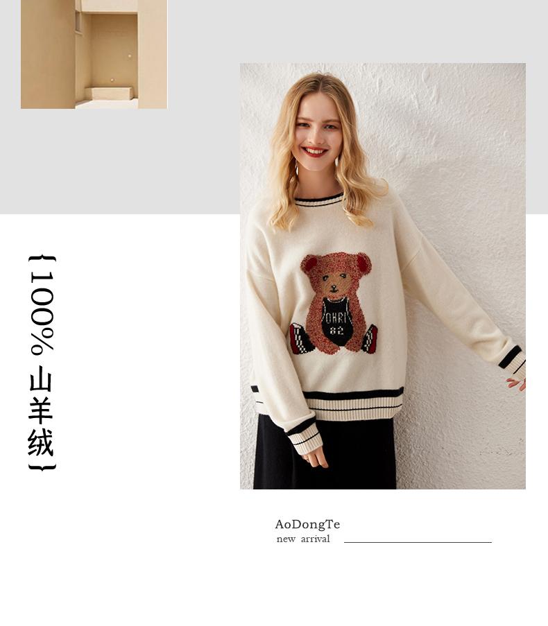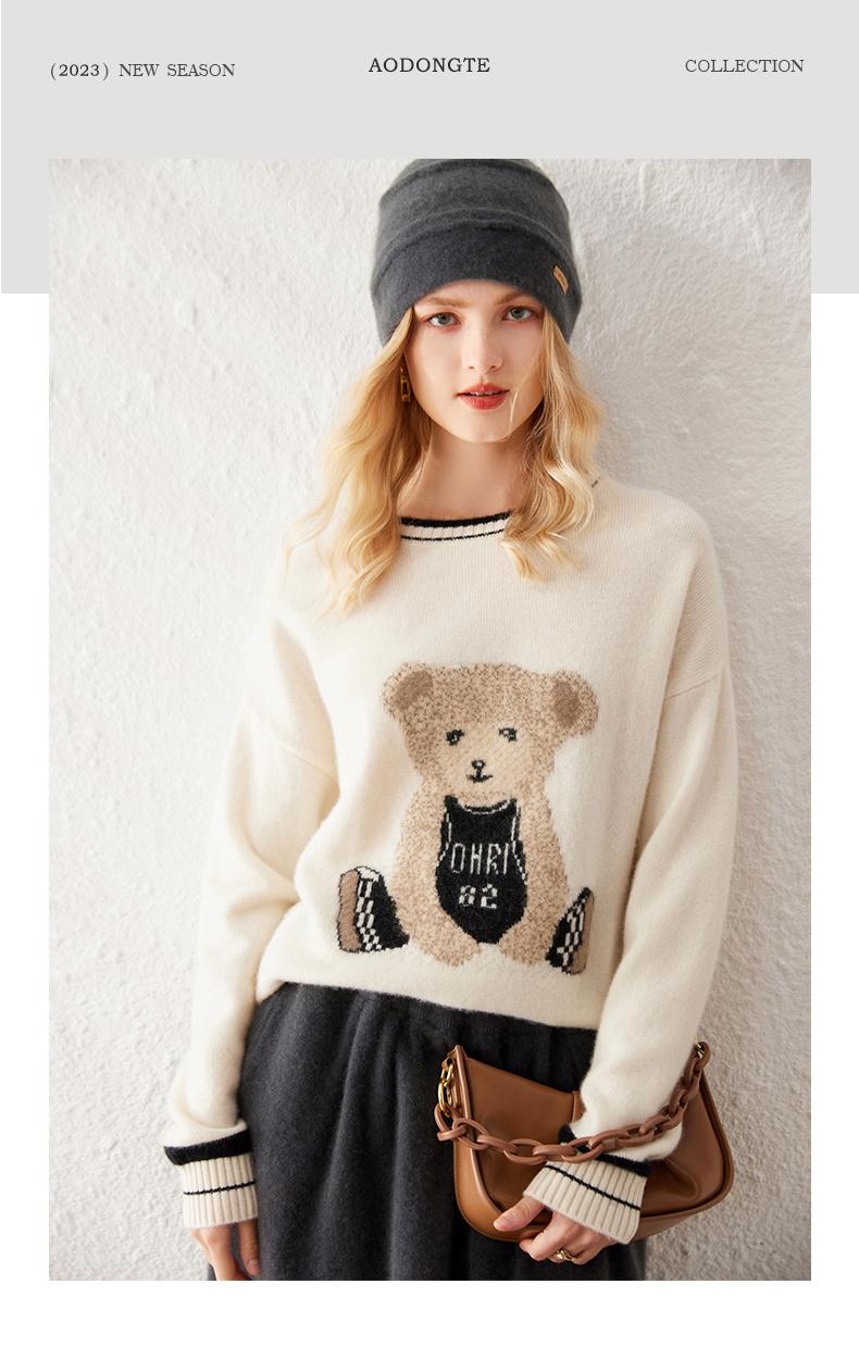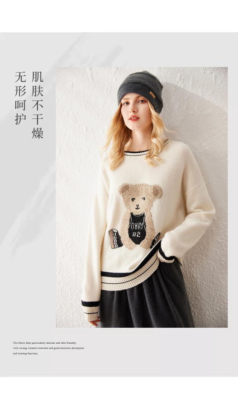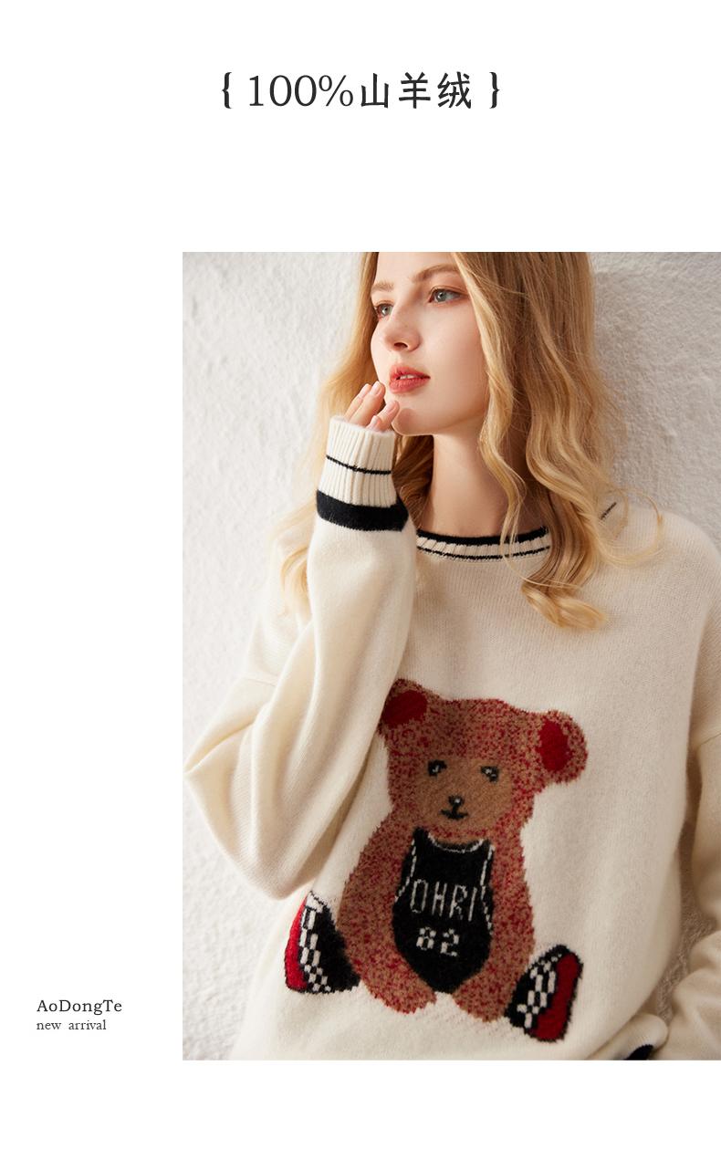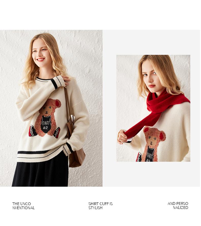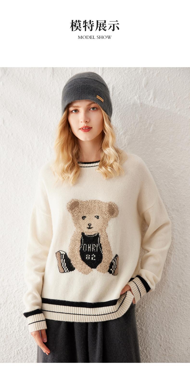 Suéter de cachemira jacquard de oso blanco de cuello redondo para mujer 100% cachemira neta manga de hombro caído suelto suéter tejido grueso