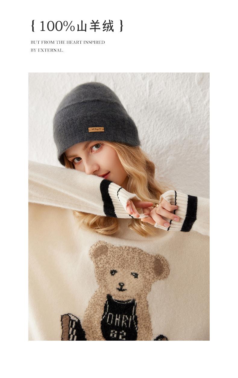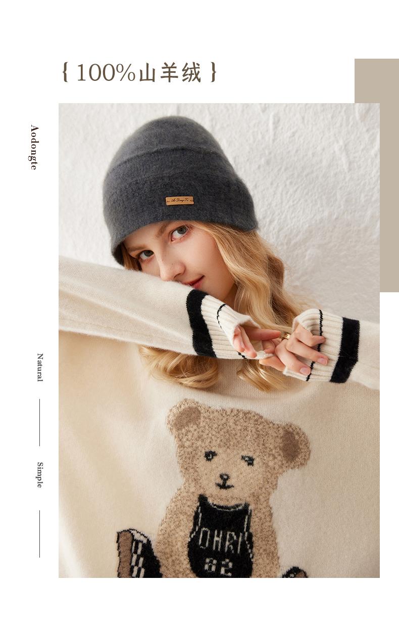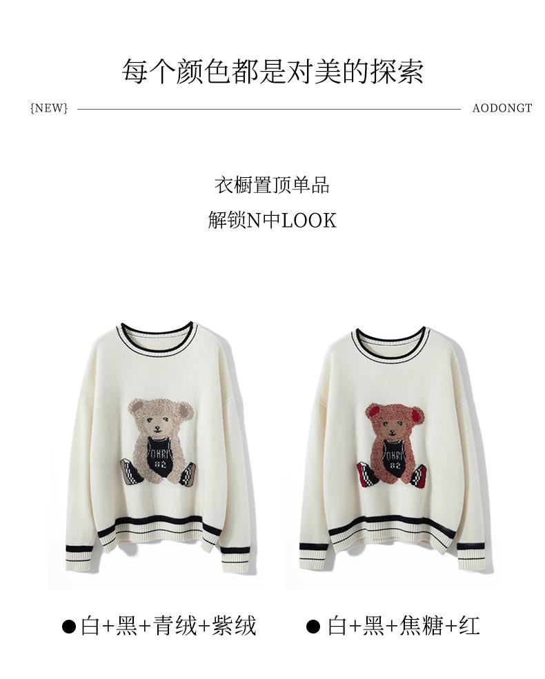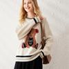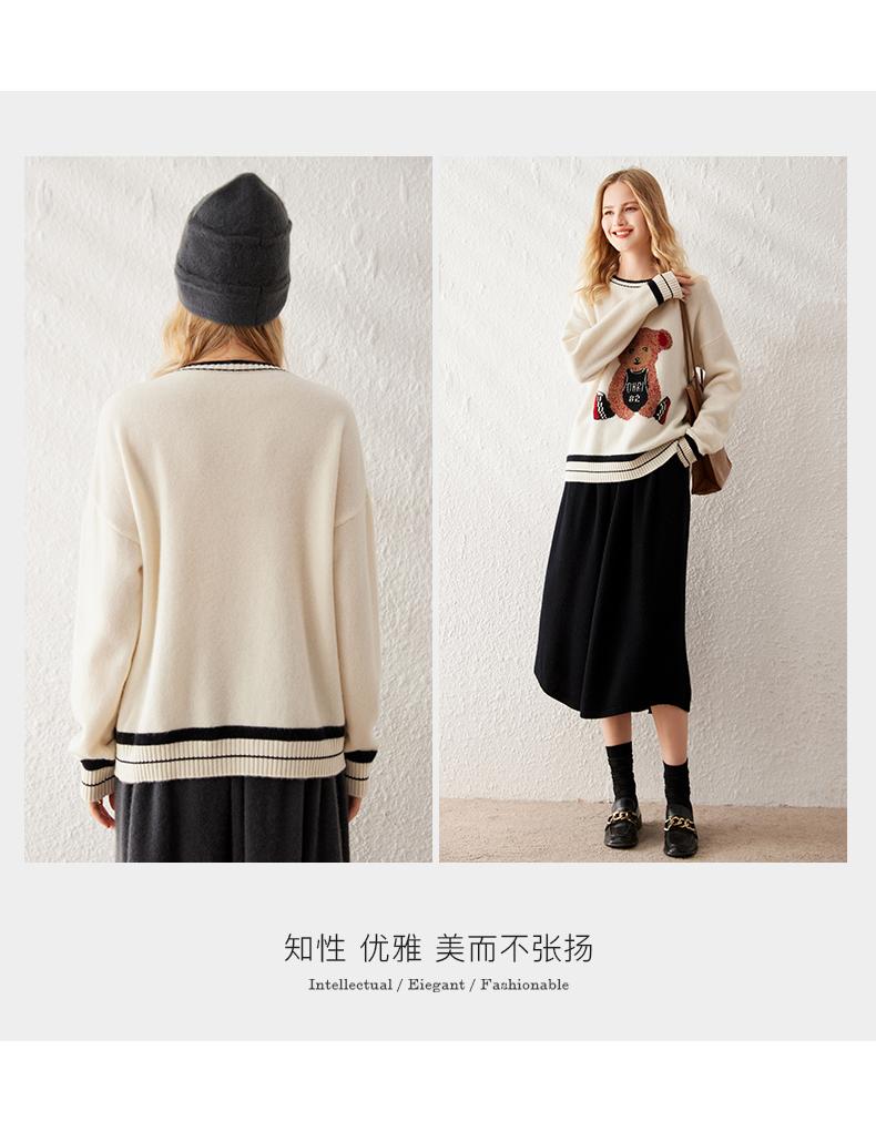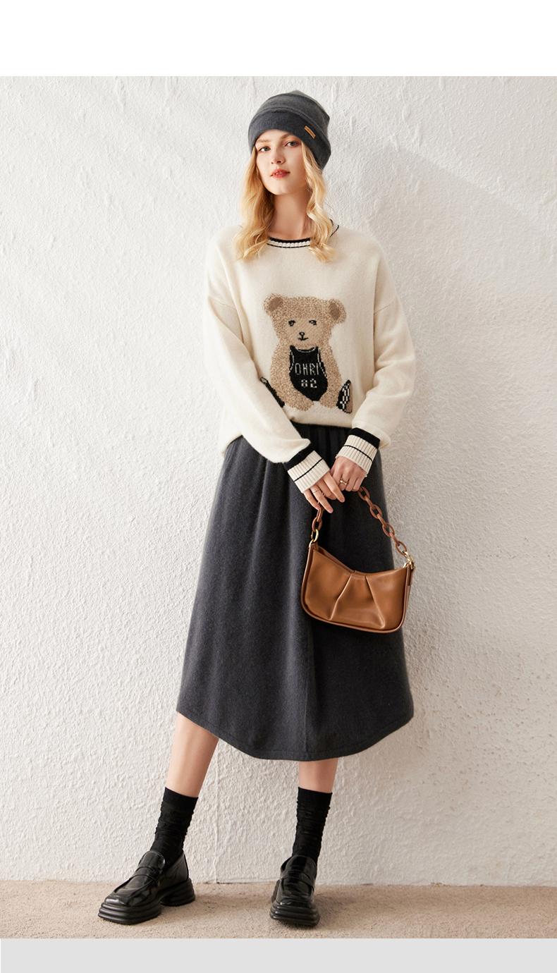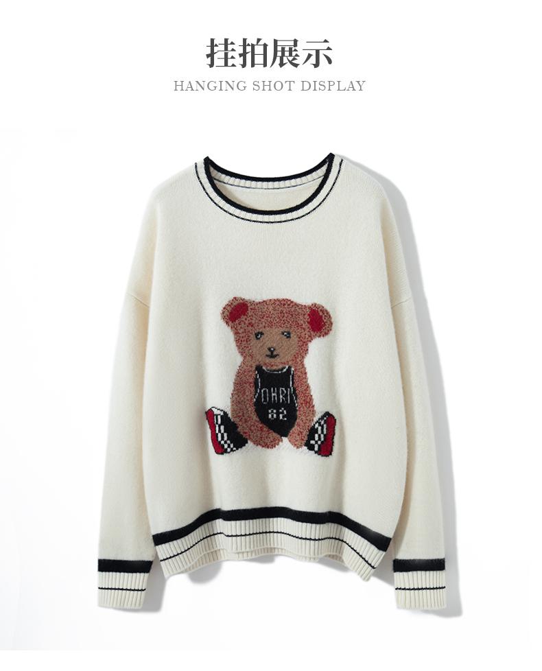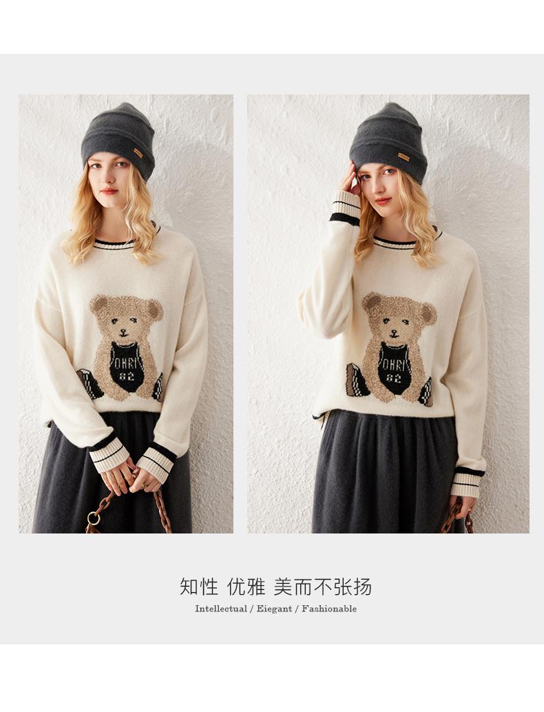Suéter de cachemira jacquard de oso blanco de cuello redondo para mujer 100% cachemira neta manga de hombro caído suelto suéter tejido grueso