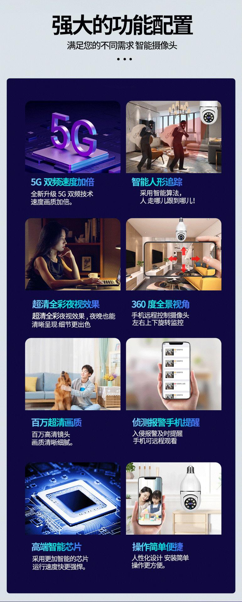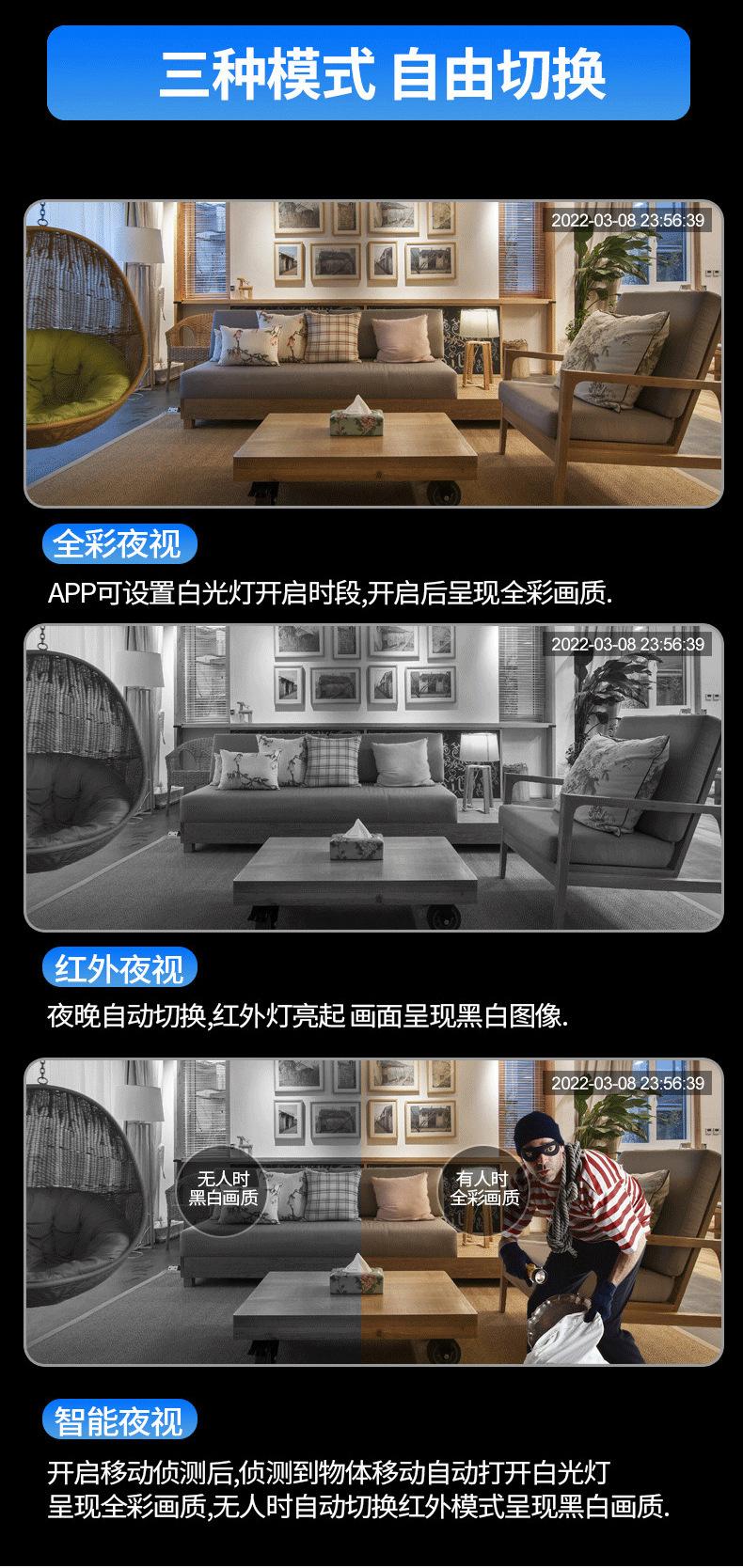 Admite intercomunicación de voz bidireccional, cancelación de eco, seguimiento móvil, admite conmutación automática IR-CUT triple para exterior/50 Hz/60 Hz, doble frecuencia: 2.4G/5.8G frecuencia única: 2.4G