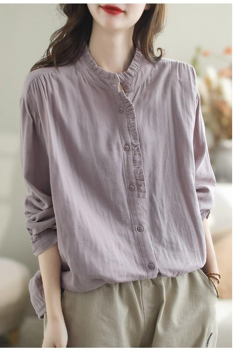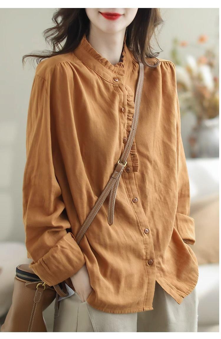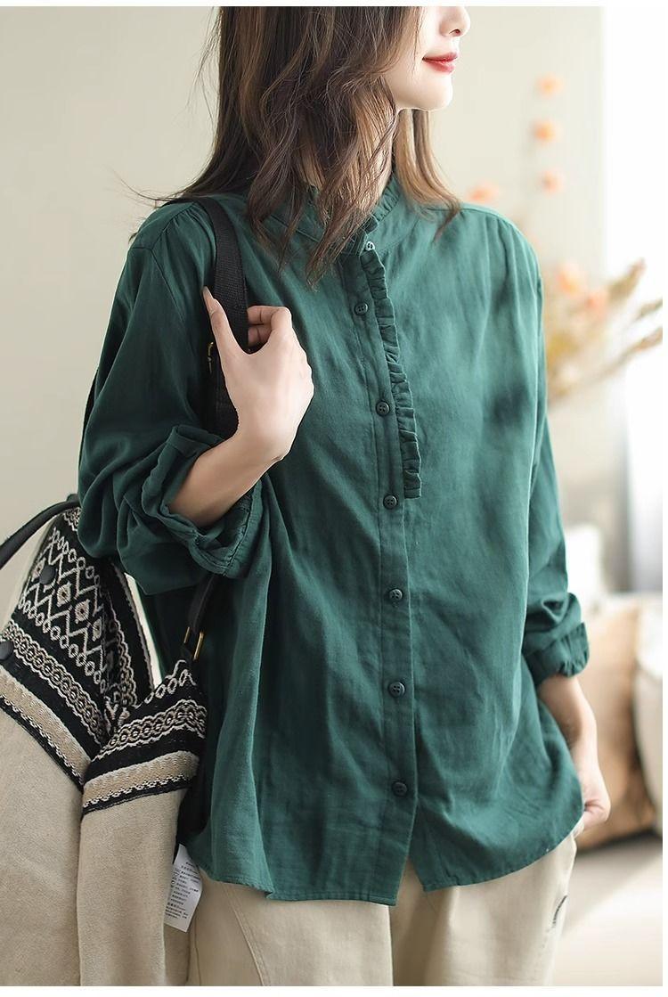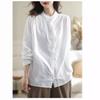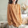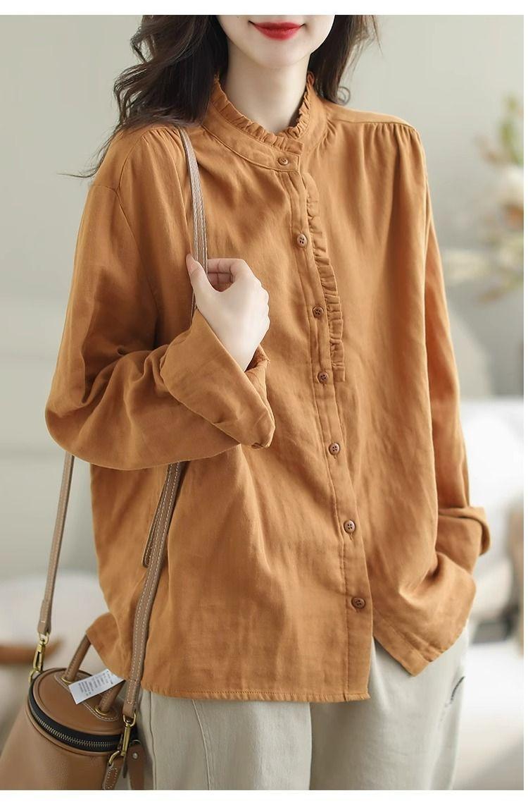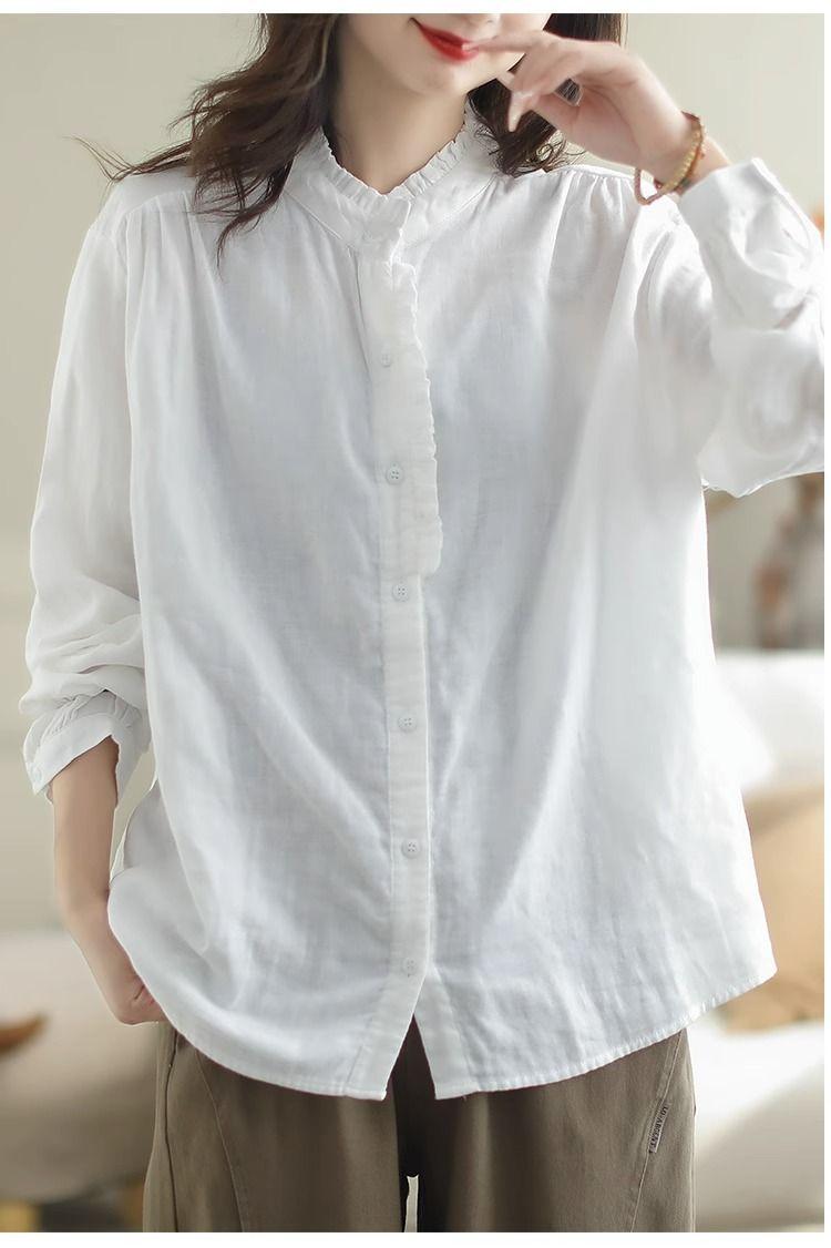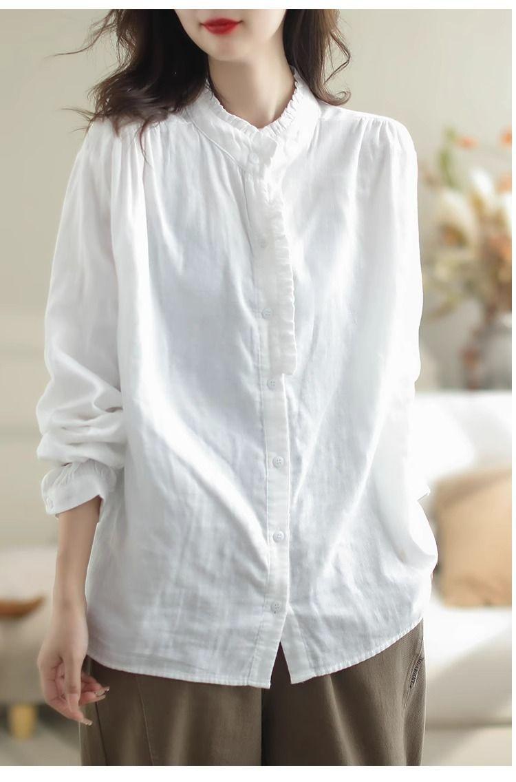 Camisa de manga larga de lino y algodón para mujer, estilo retro, holgada, de color liso, con costuras a la moda, combina con todo, para primavera y otoño.