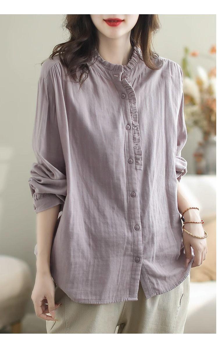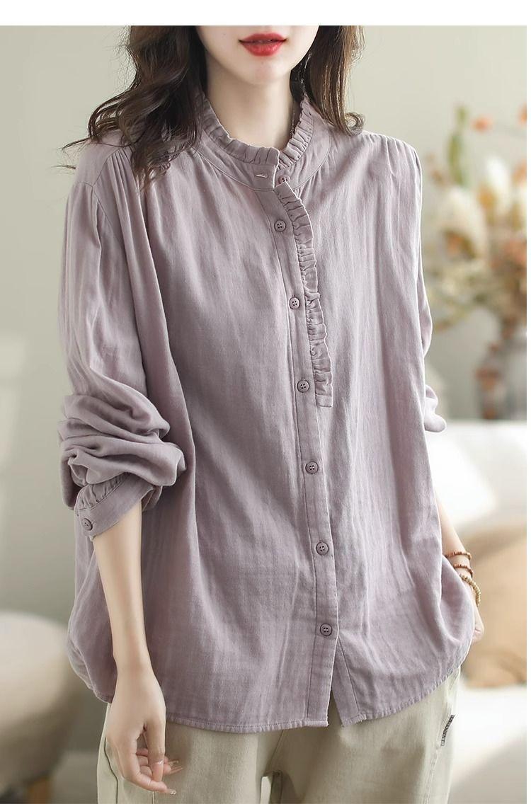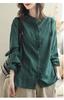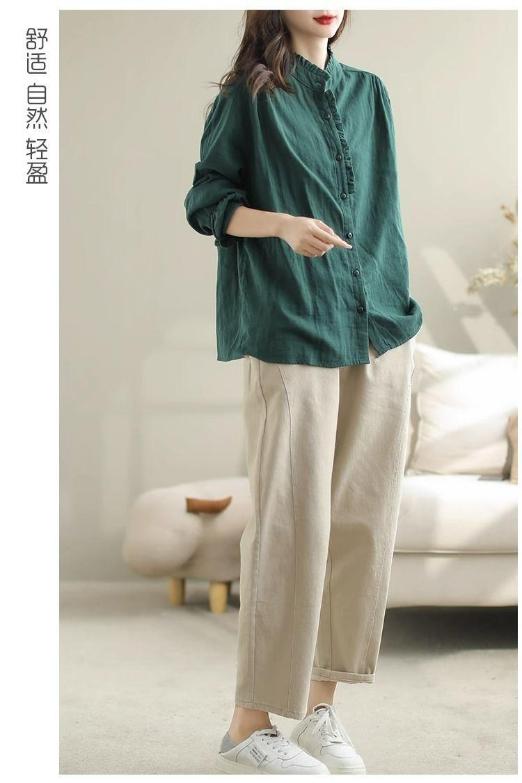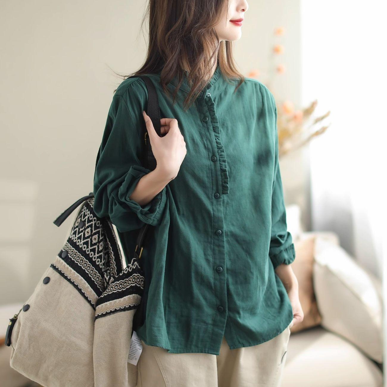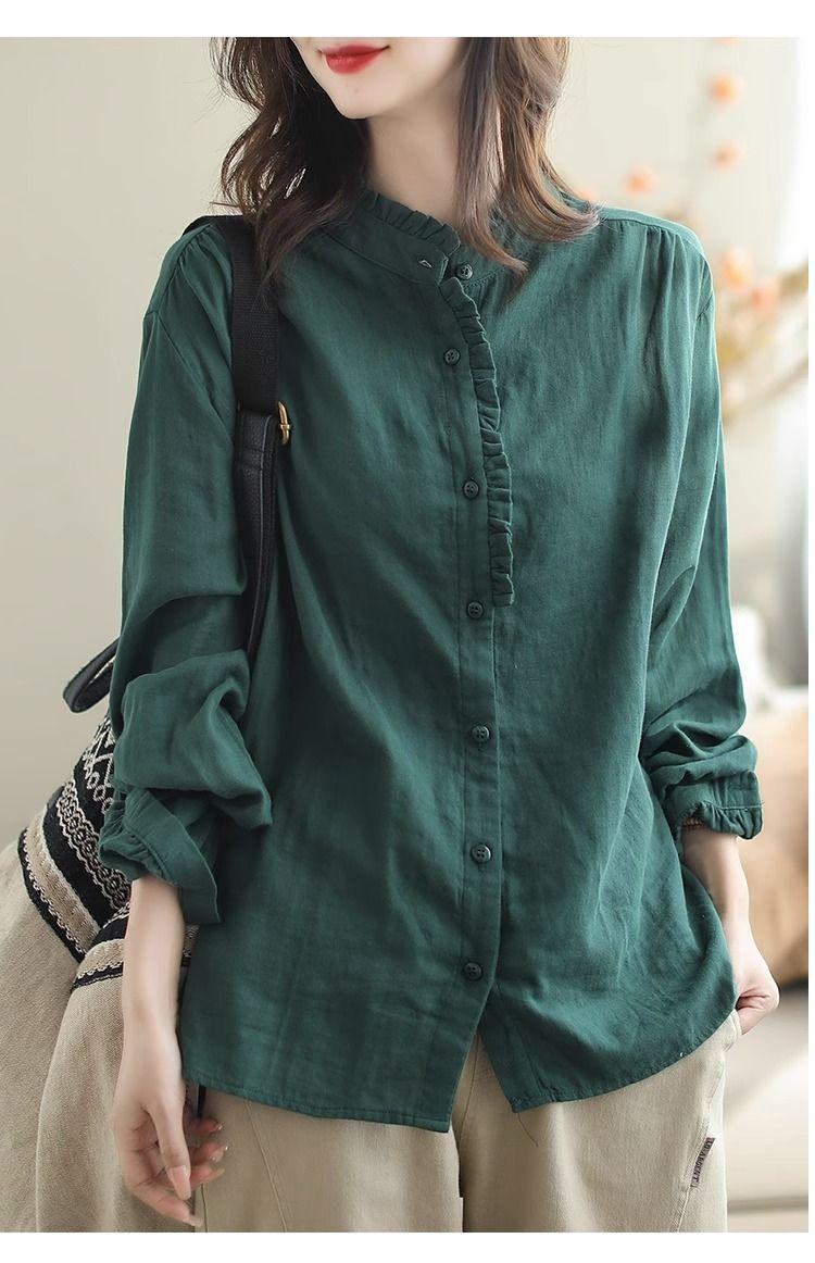 Camisa de manga larga de lino y algodón para mujer, estilo retro, holgada, de color liso, con costuras a la moda, combina con todo, para primavera y otoño.