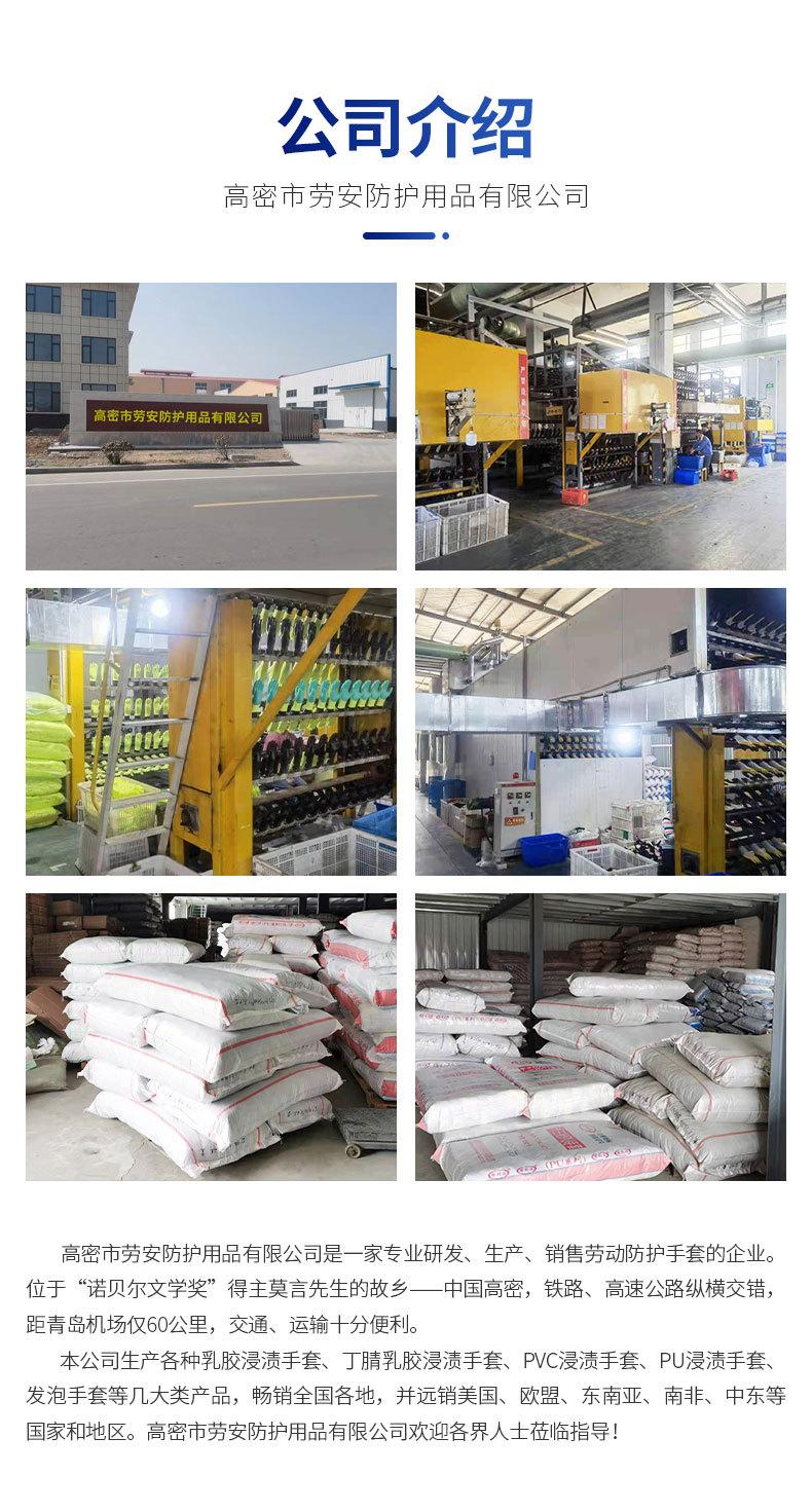 Gaomi Laoan Protective Products Co., Ltd. es una empresa especializada en la producción y procesamiento de guantes de látex antiarrugas, guantes de espuma de látex, guantes de PVC con revestimiento de nailon, guantes con revestimiento de hilo, guantes de protección laboral, guantes de soldadura, guantes de nitrilo, guantes de látex y otros productos. Cuenta con un sistema de gestión de calidad completo y científico. La integridad, la solidez y la calidad de sus productos son reconocidas por la industria. Invitamos a amigos de todos los ámbitos a visitarnos, guiarnos y negociar.