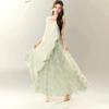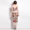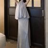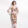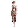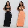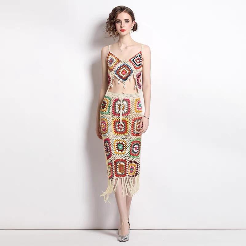 Traje de moda de vacaciones junto al mar, estilo vintage de crochet, cuello halter hueco, chaleco expuesto, falda de borlas de cintura alta de dos piezas
