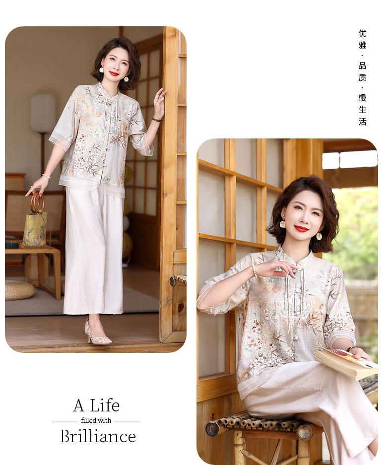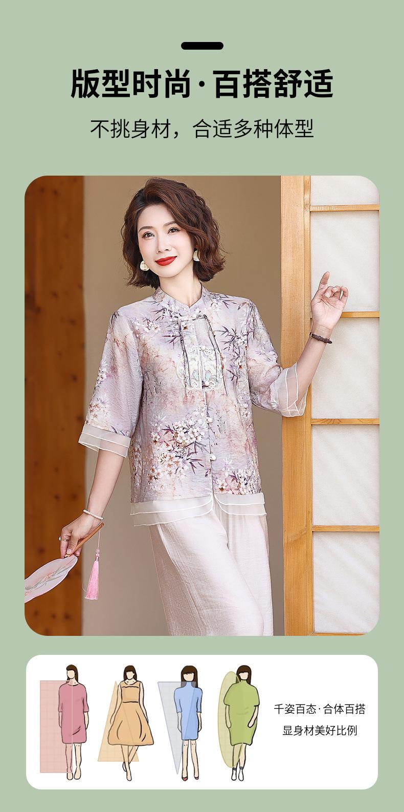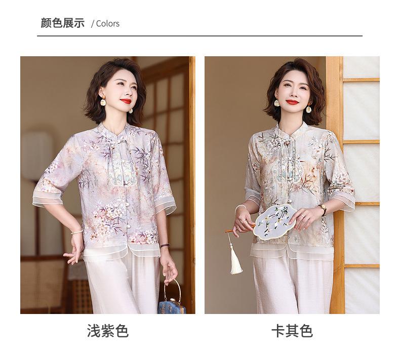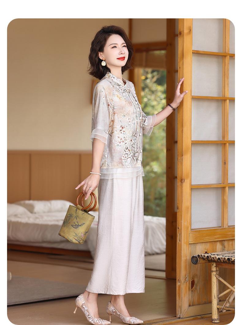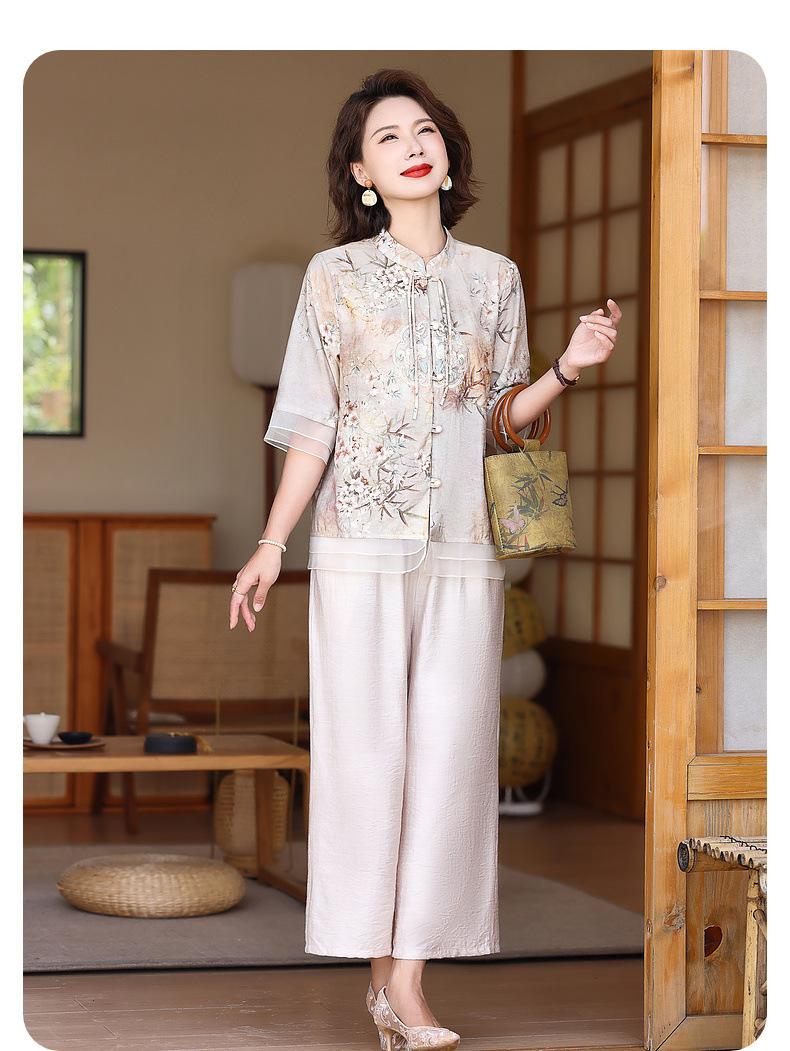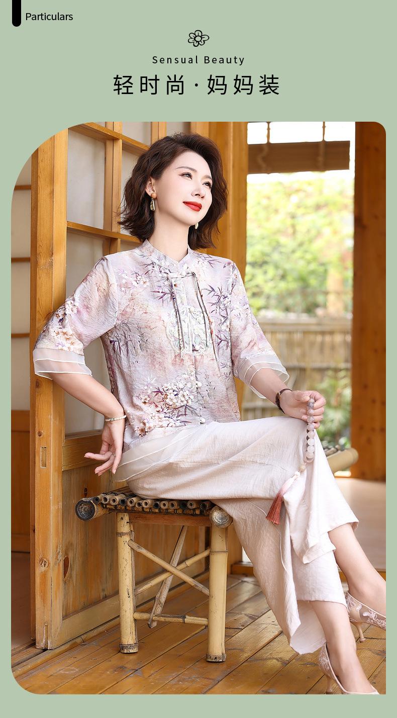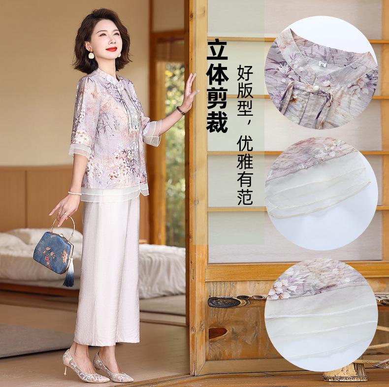 Vestido de madre 2024, nuevo traje, estilo occidental, moda, camisa de manga corta, para mujeres de mediana edad y mayores, verano, estilo chino, estilo nacional, conjunto de dos piezas.