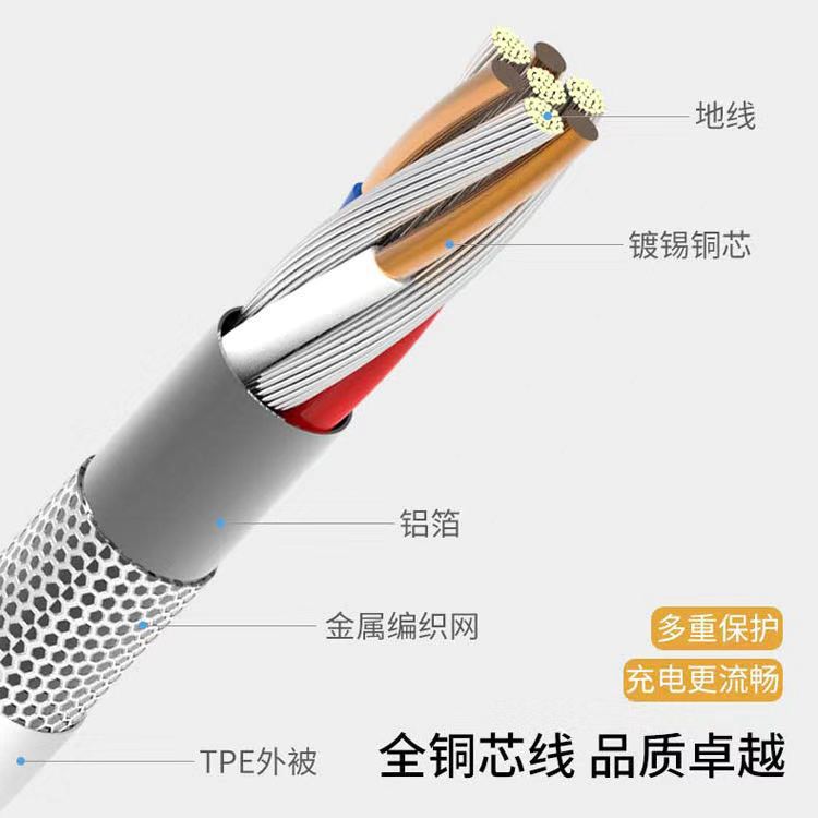 Función: Núcleo de cobre puro, diámetro del núcleo de cobre estándar 0.08, carga estable, el cable de carga solo se utiliza para cargar la fuente de alimentación del producto o el teléfono móvil, y el cable de datos admite carga y transferencia