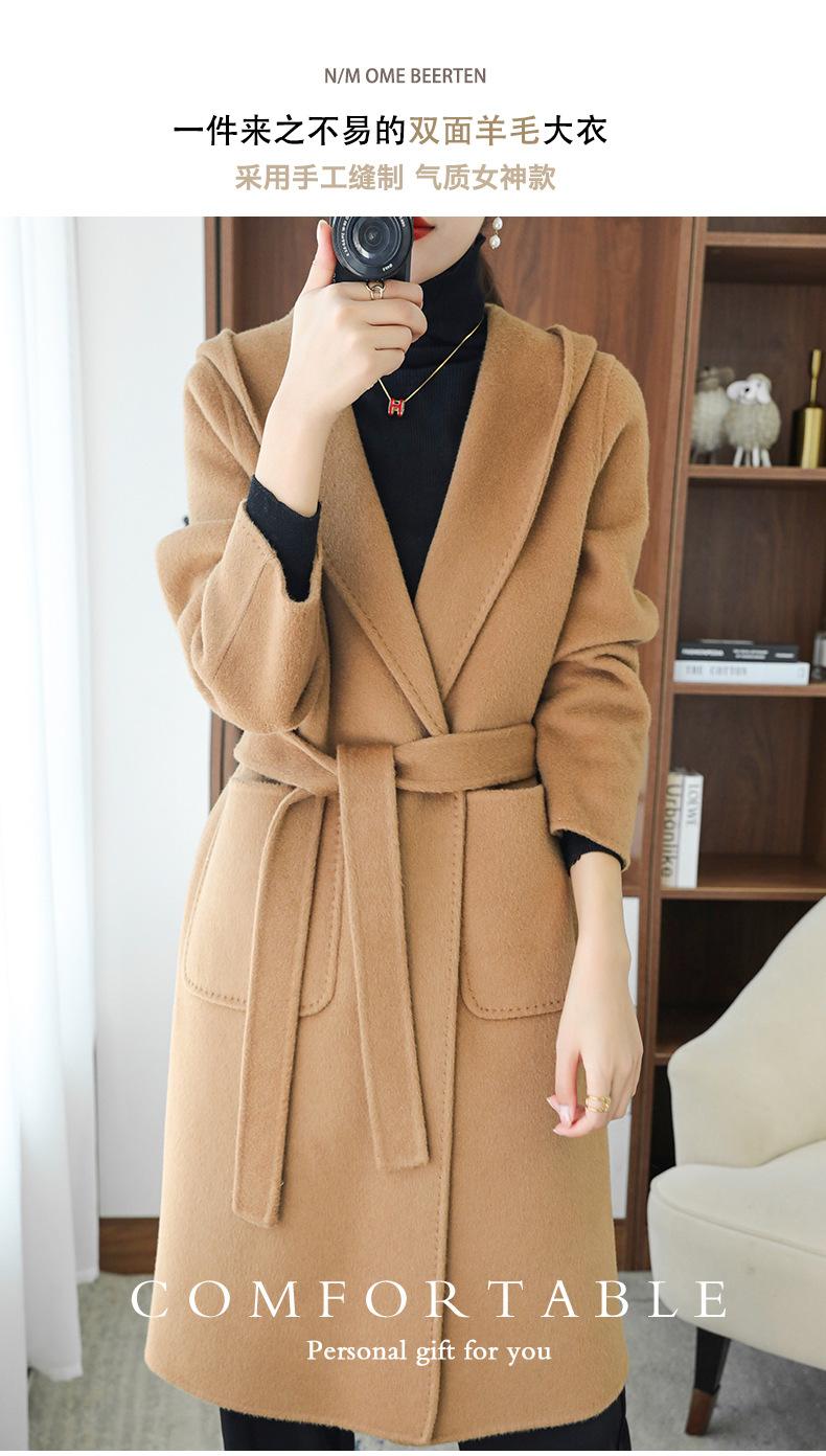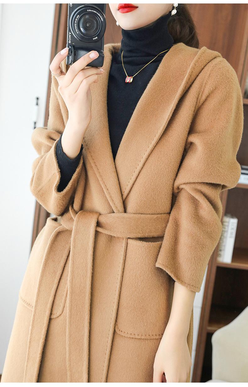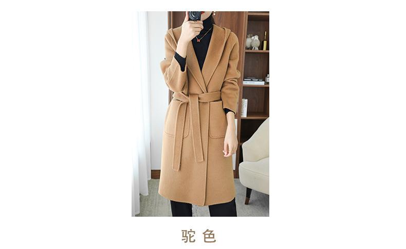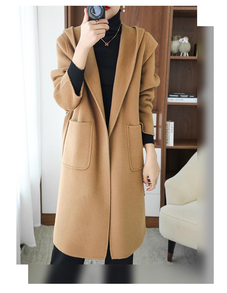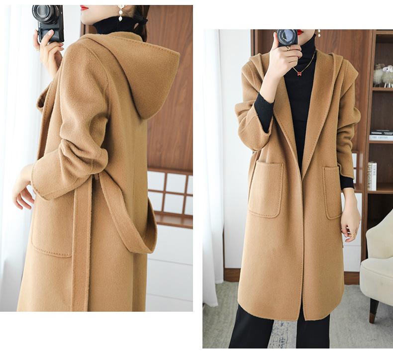 Abrigo de lana polar de doble cara para otoño e invierno, nuevo, de longitud media, con capucha, con cordones, por encima de la rodilla, elegante abrigo informal de alta gama para mujer.