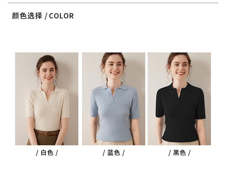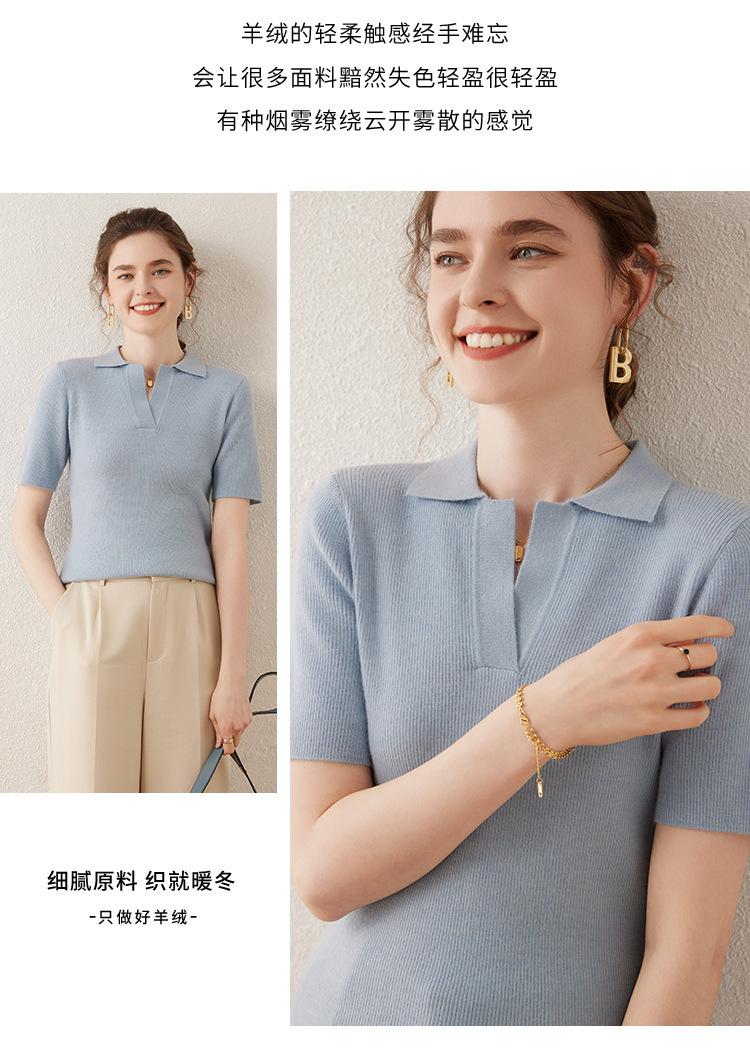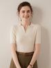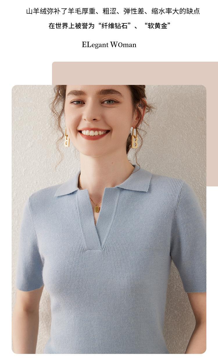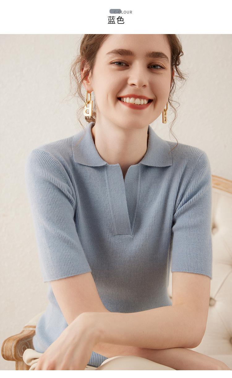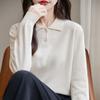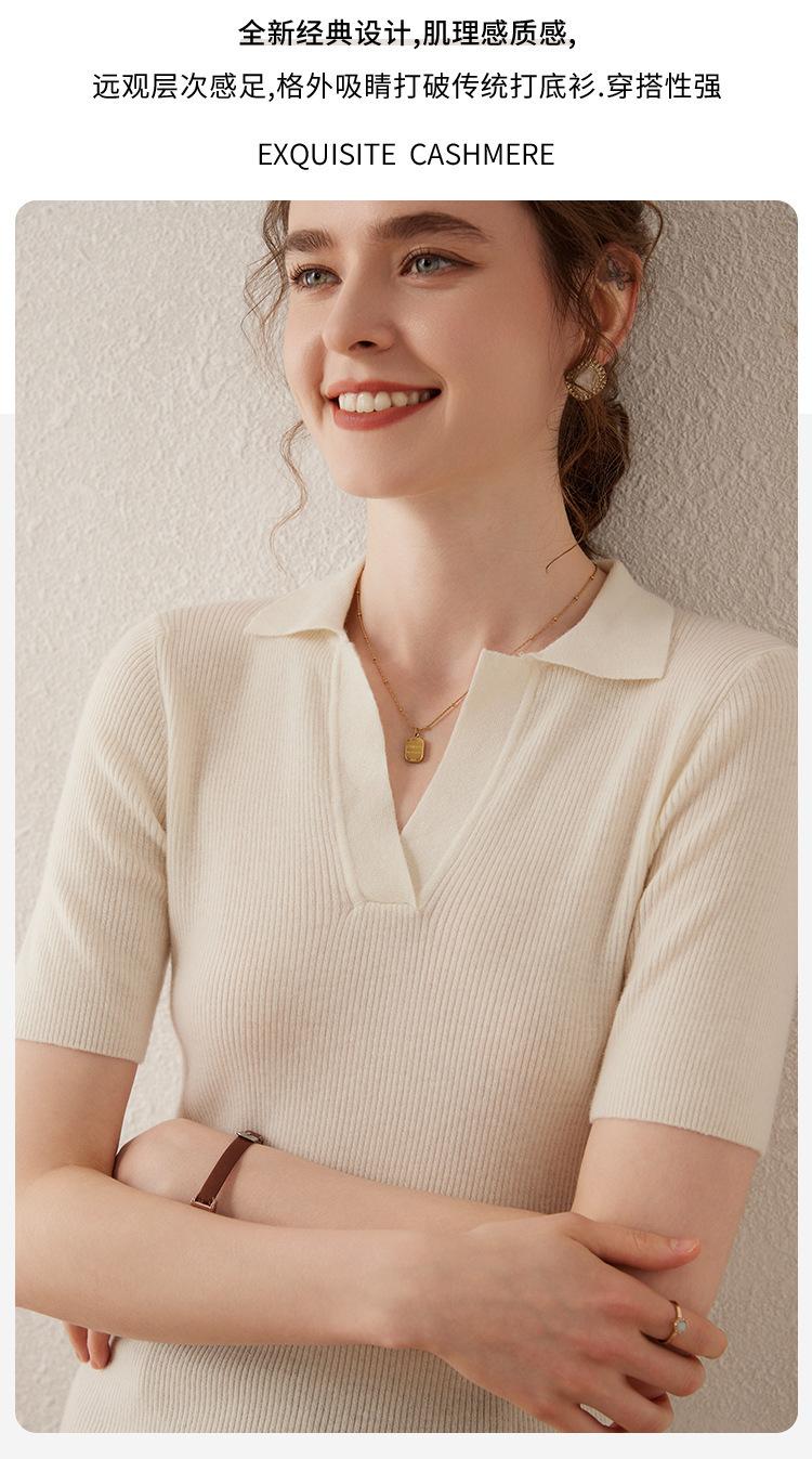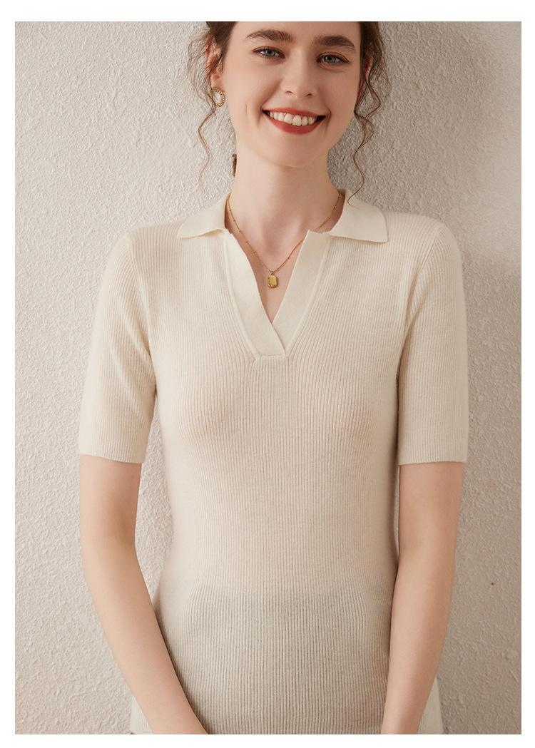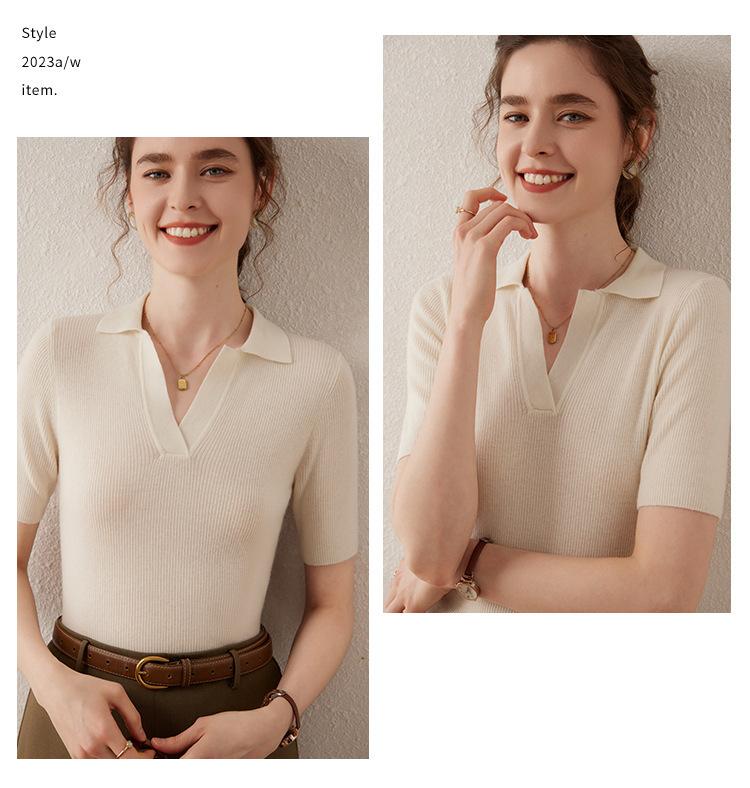 Suéter de cachemira con cuello polo, primavera y otoño de 24 años, nueva camisa de base de lana de media manga para mujer, suéter corto ajustado de estilo suave.