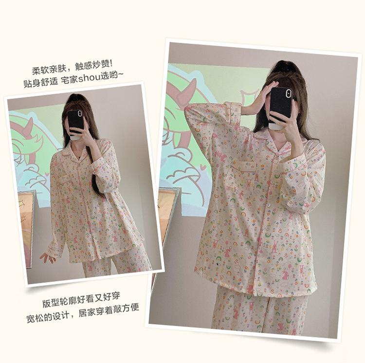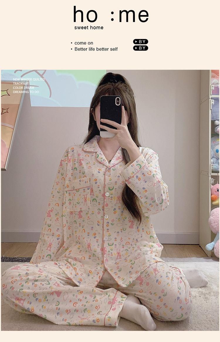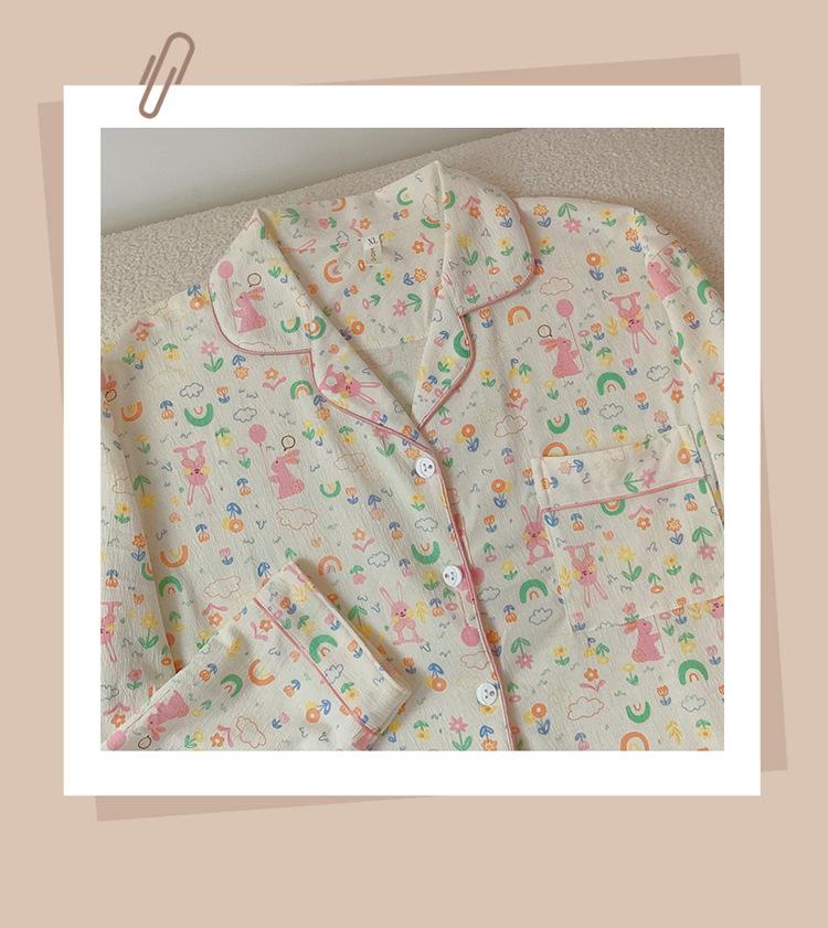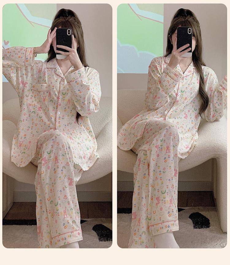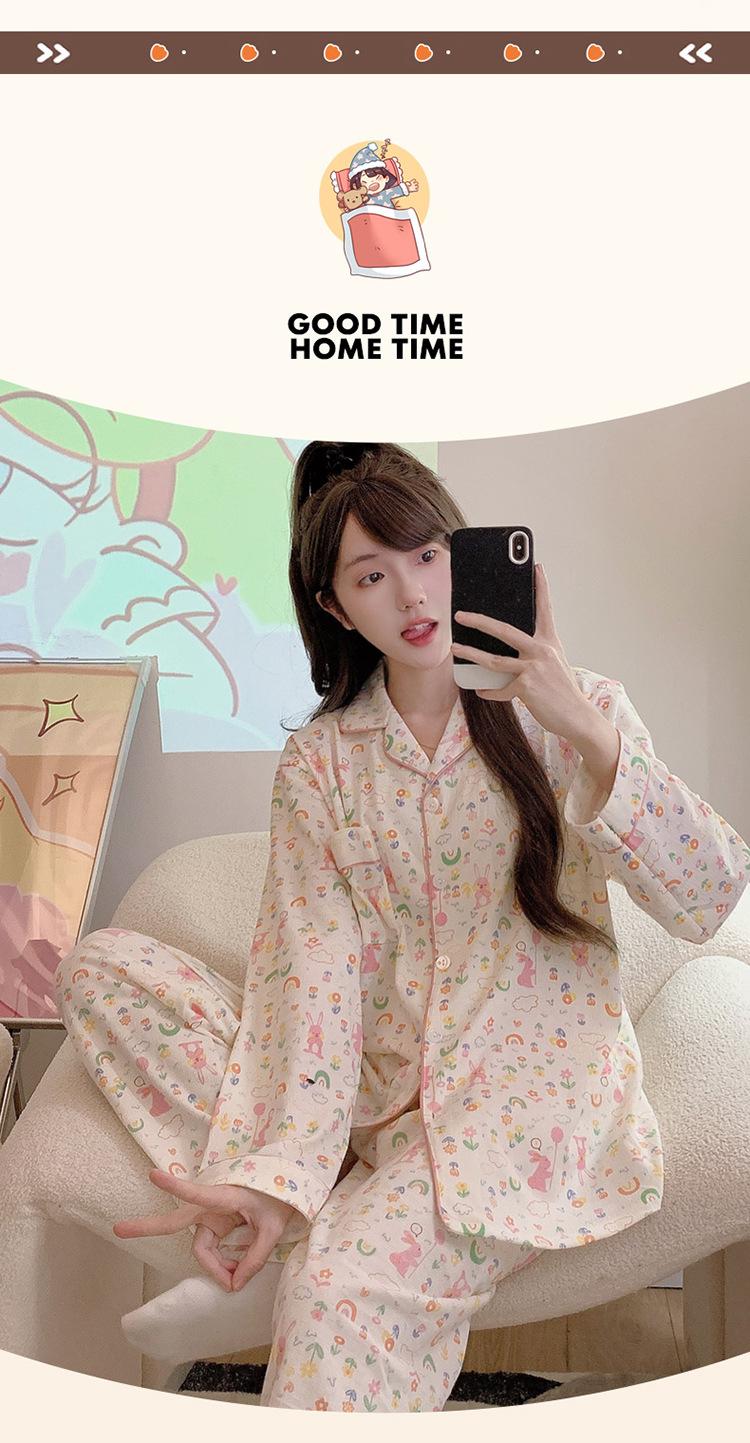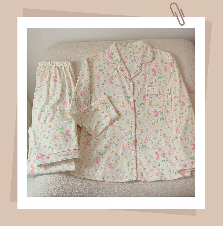 Pijamas de algodón puro con volantes de dibujos animados para mujer, primavera y otoño 2024, nuevos pantalones de manga larga con solapa de conejo, ropa de casa