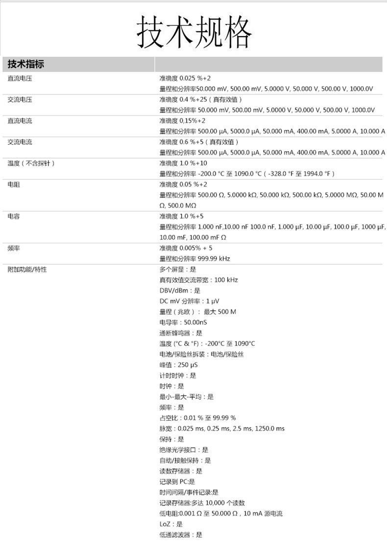 Capacitance, Resistance, DC current, AC current, AC voltage, DC voltage
