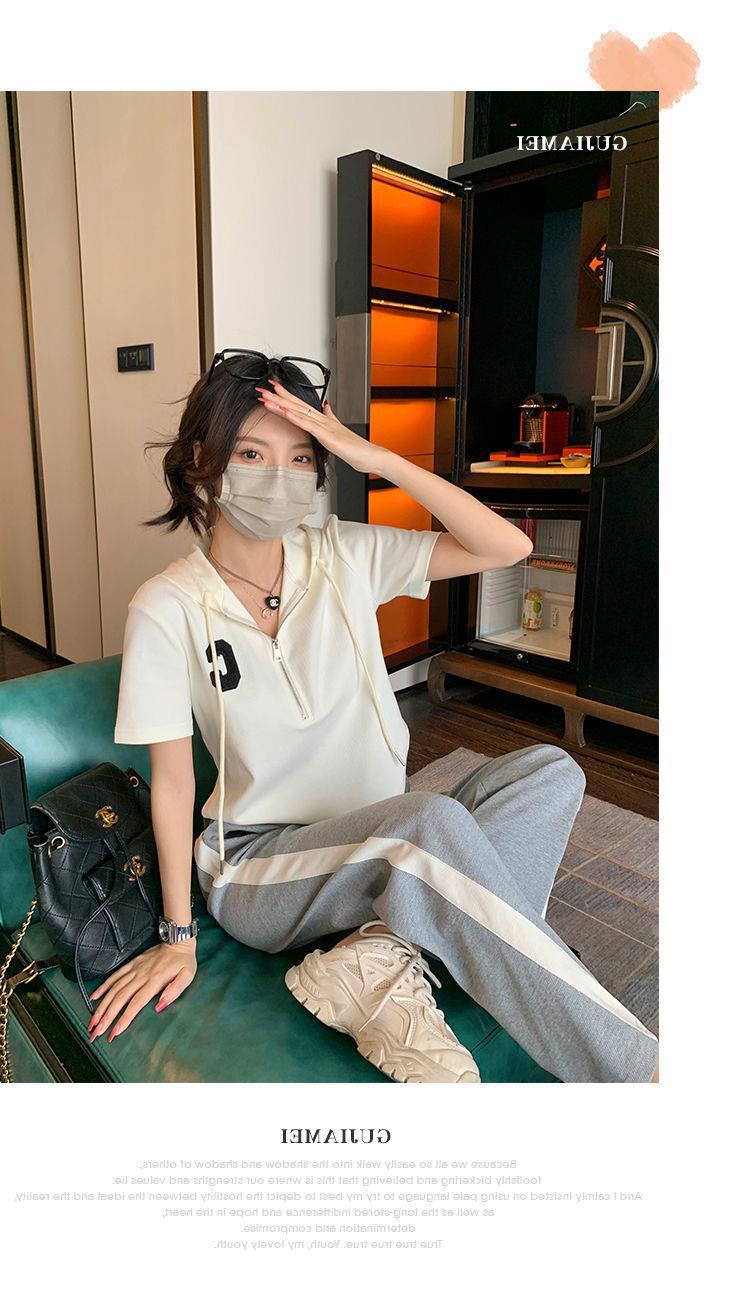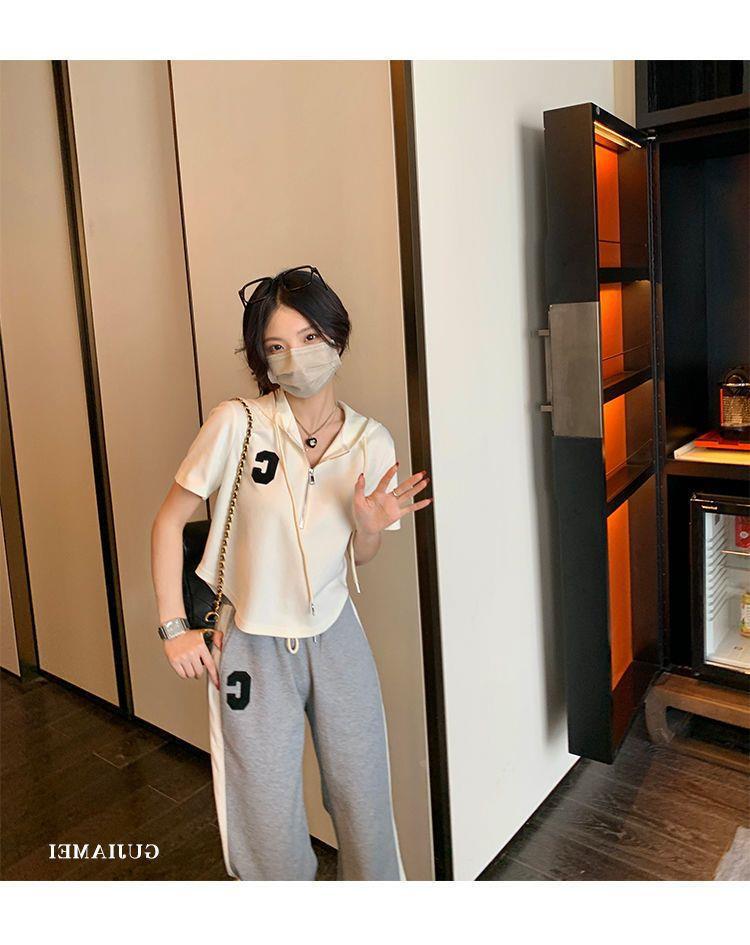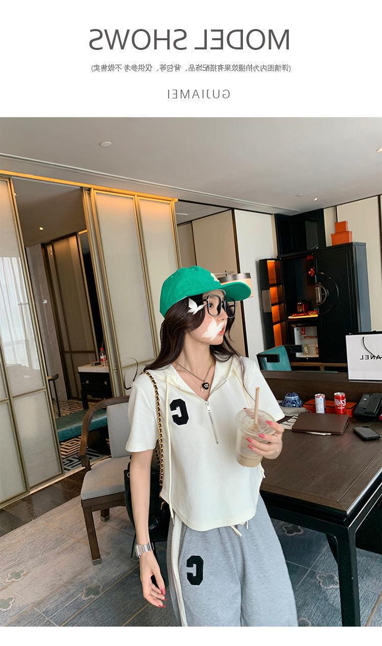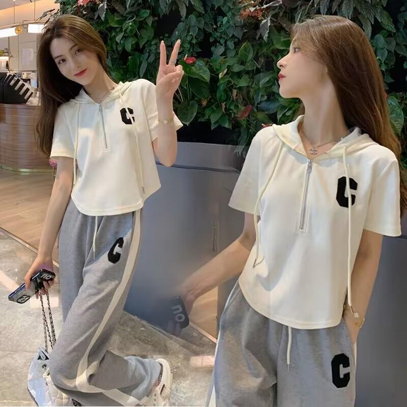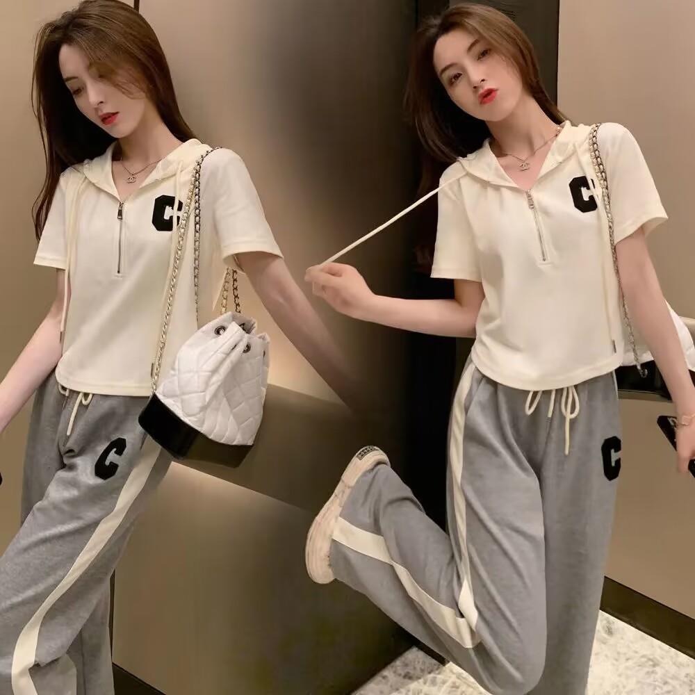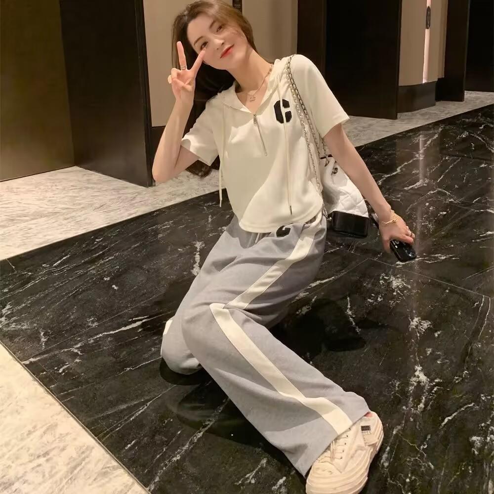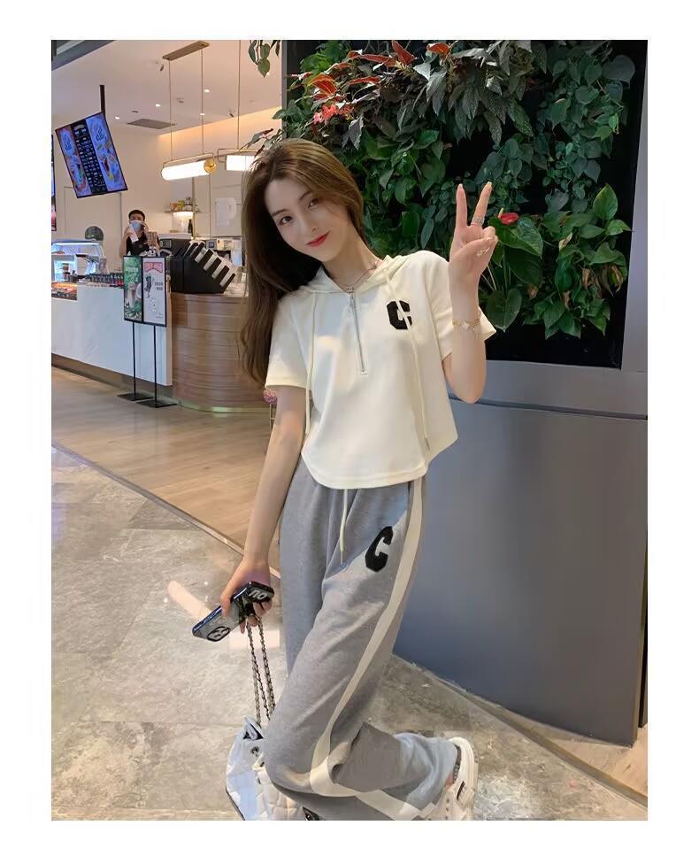 Traje deportivo informal para mujer, verano 2023, estilo coreano, nueva moda, talla grande, holgado, con capucha, manga corta, conjunto de dos piezas