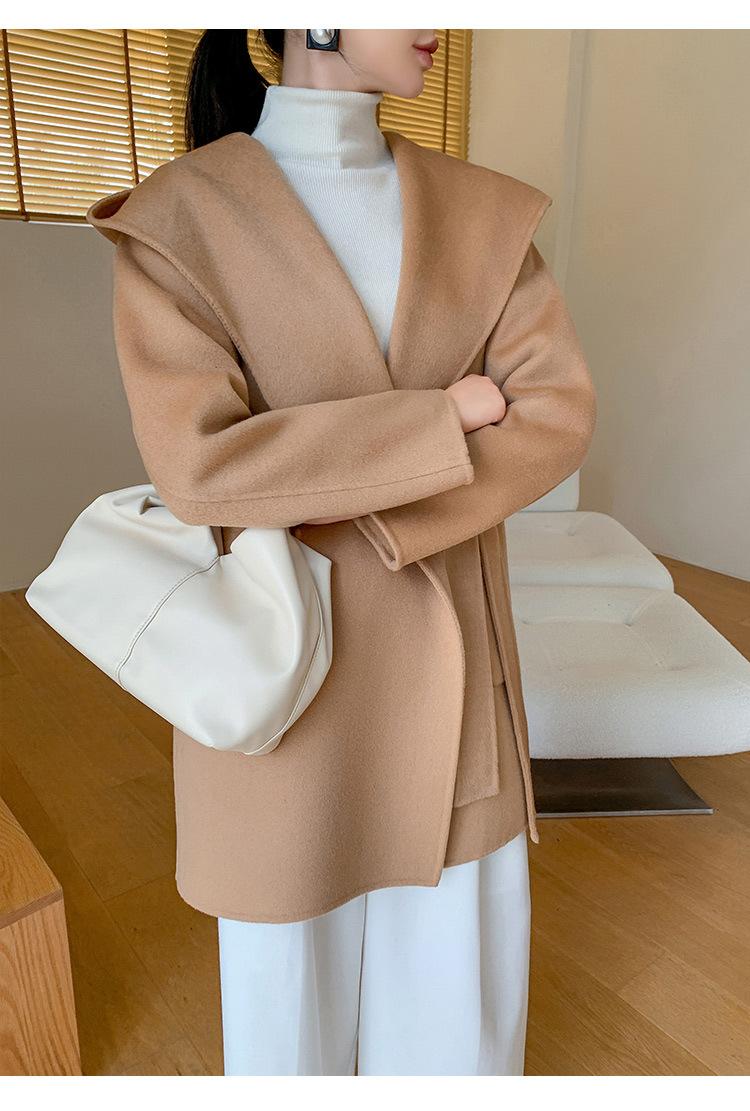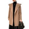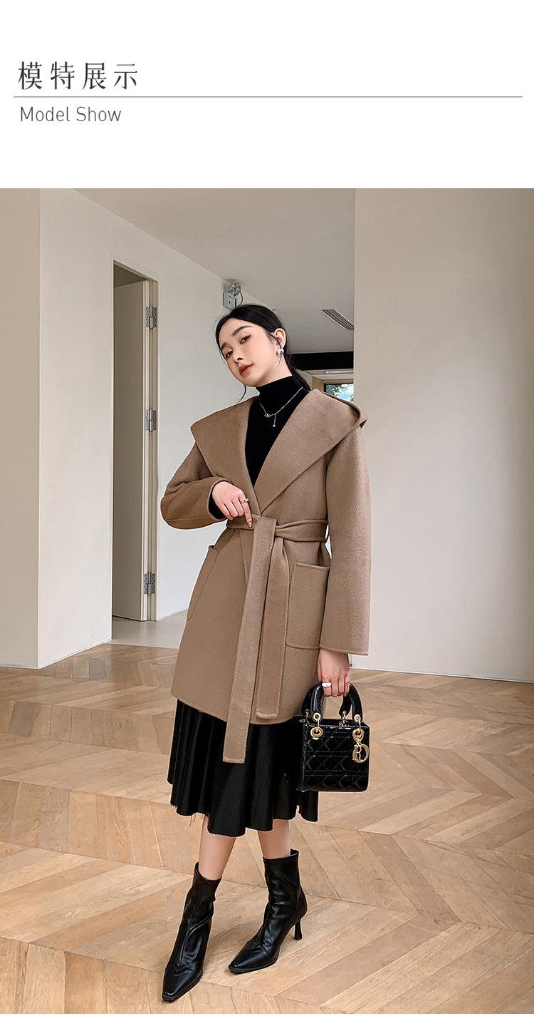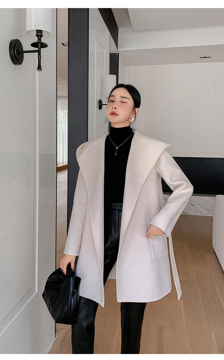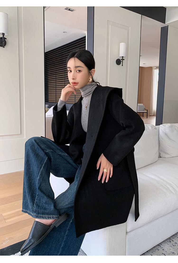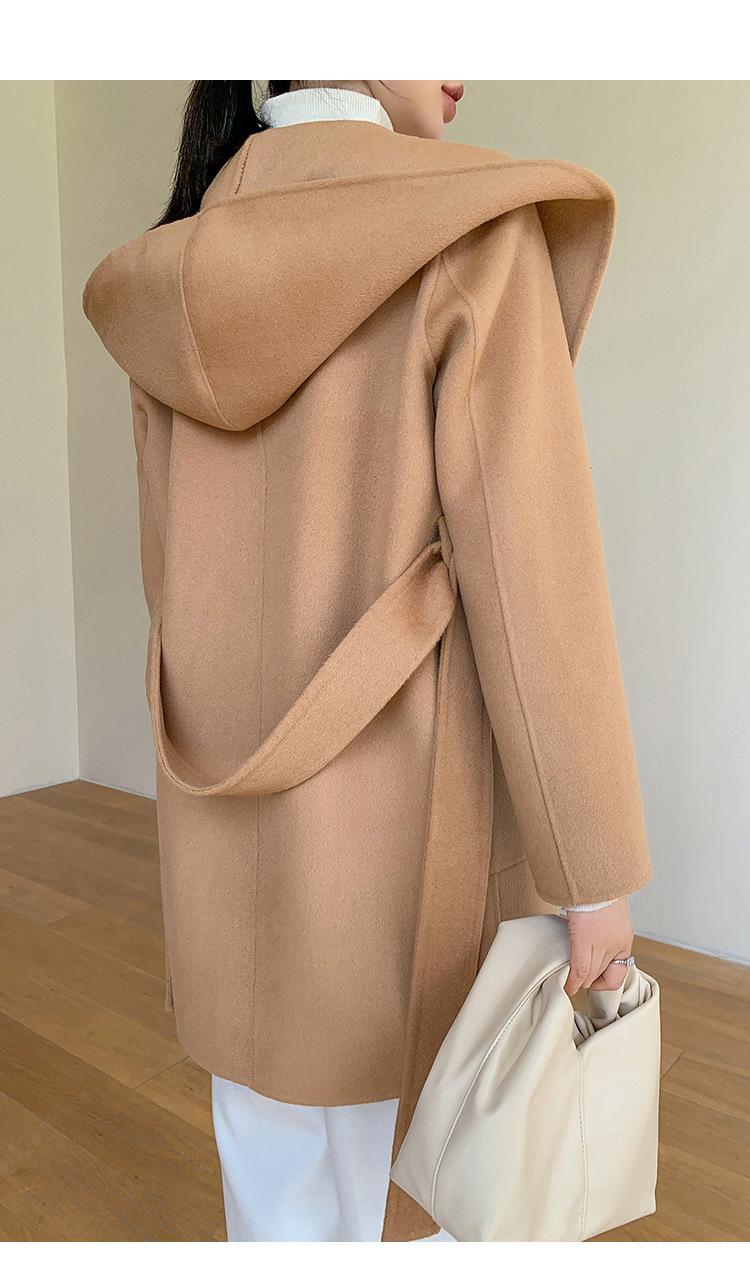 Abrigo de Lana de Otoño e Invierno de Lana de Doble Cara con Capucha para Mujer de Largo Medio para Desplazamiento Holgado Versátil Abrigo de Lana con Cinturón