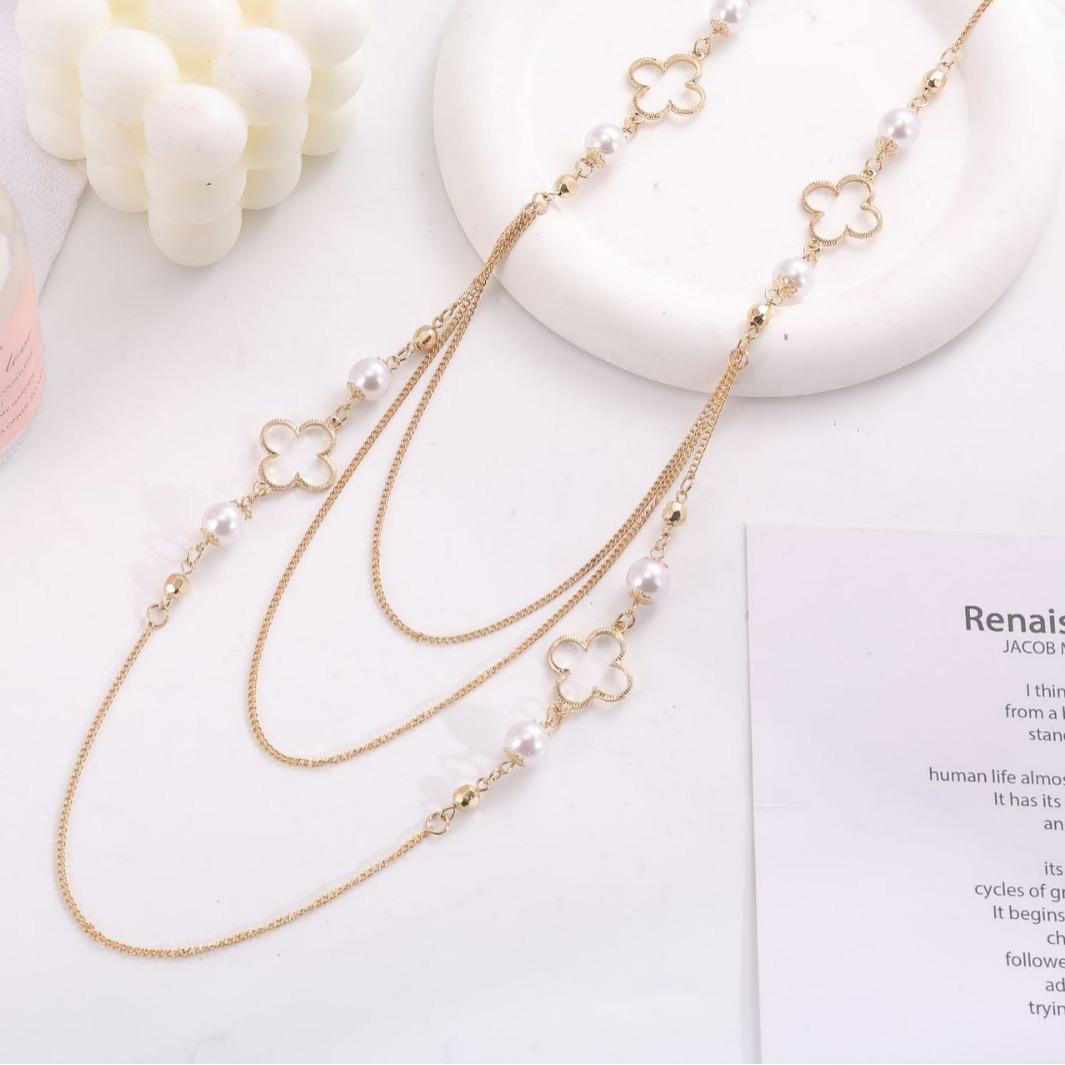 Cadena de suéter larga, collar transfronterizo europeo y americano, trébol de cuatro hojas hueco de alta calidad, cadena de perlas de celebridades de Internet, accesorios, colgante al por mayor