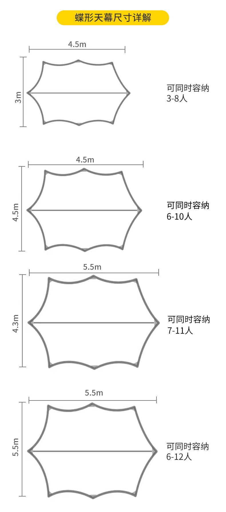 3 m x 3 m, 3 m x 4 m, 3 m x 5 m, 4.5 m × 4.5 m, Hexagon dish 3 m × 4.5 m, Hexagon dish 4.3 m × 5.5 m