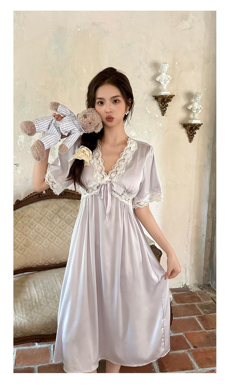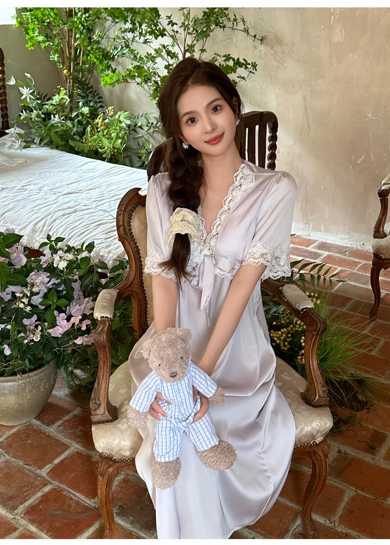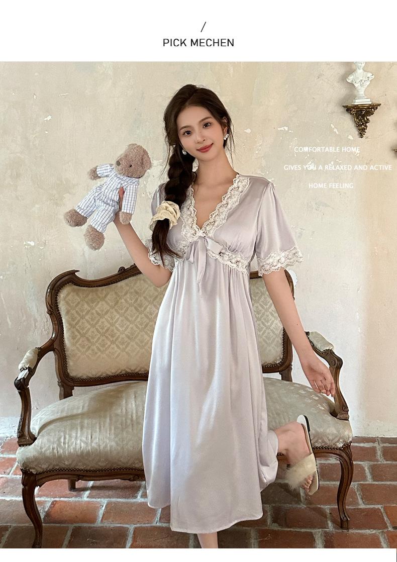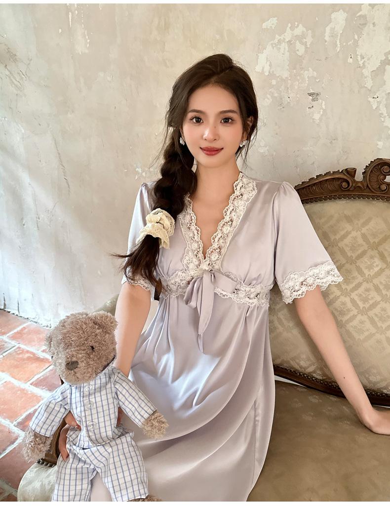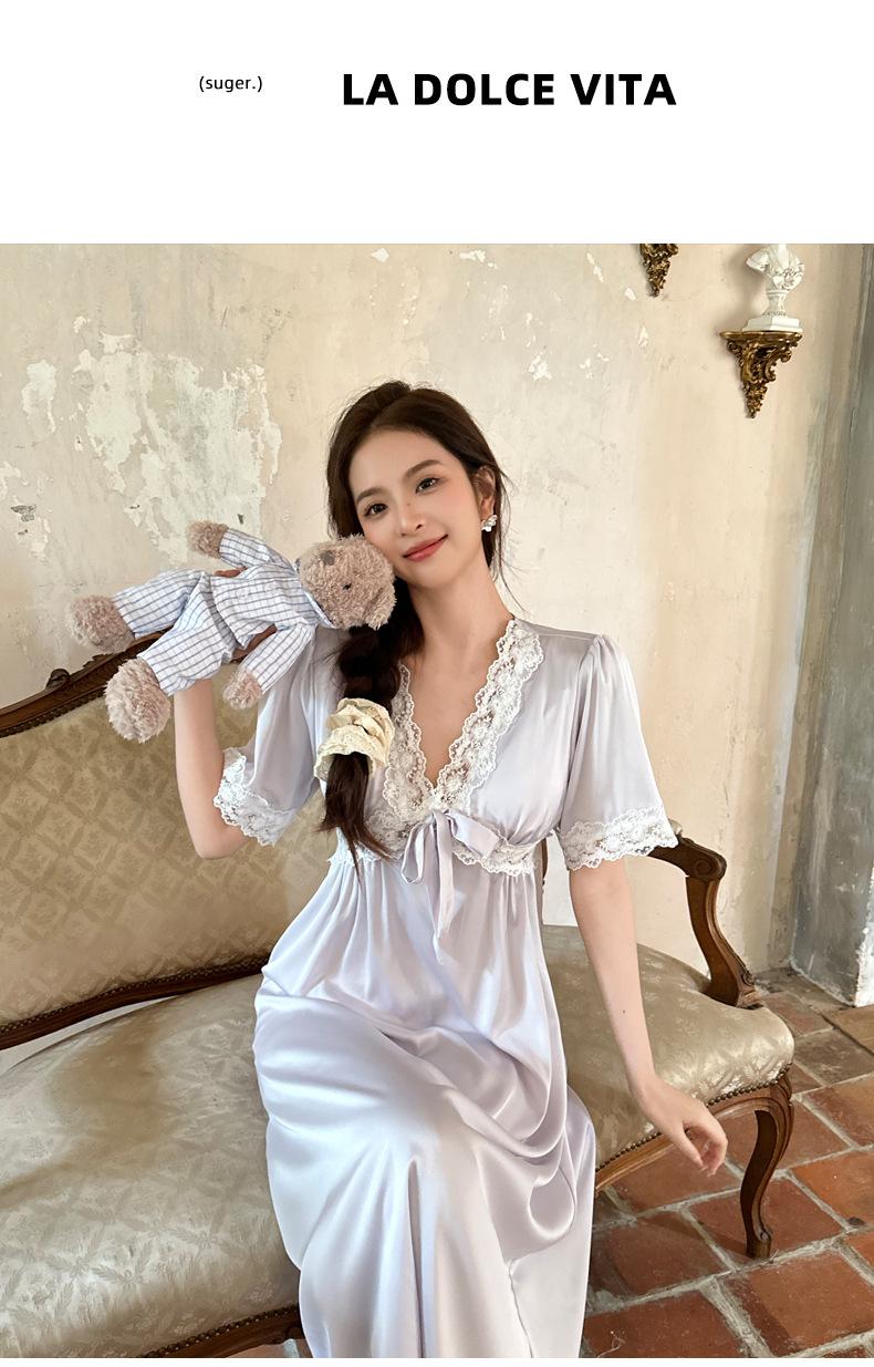 Camisón de verano para mujer, de manga corta, estilo palacio, con encaje puro, color liso, sexy, de seda helada, falda, ropa de casa
