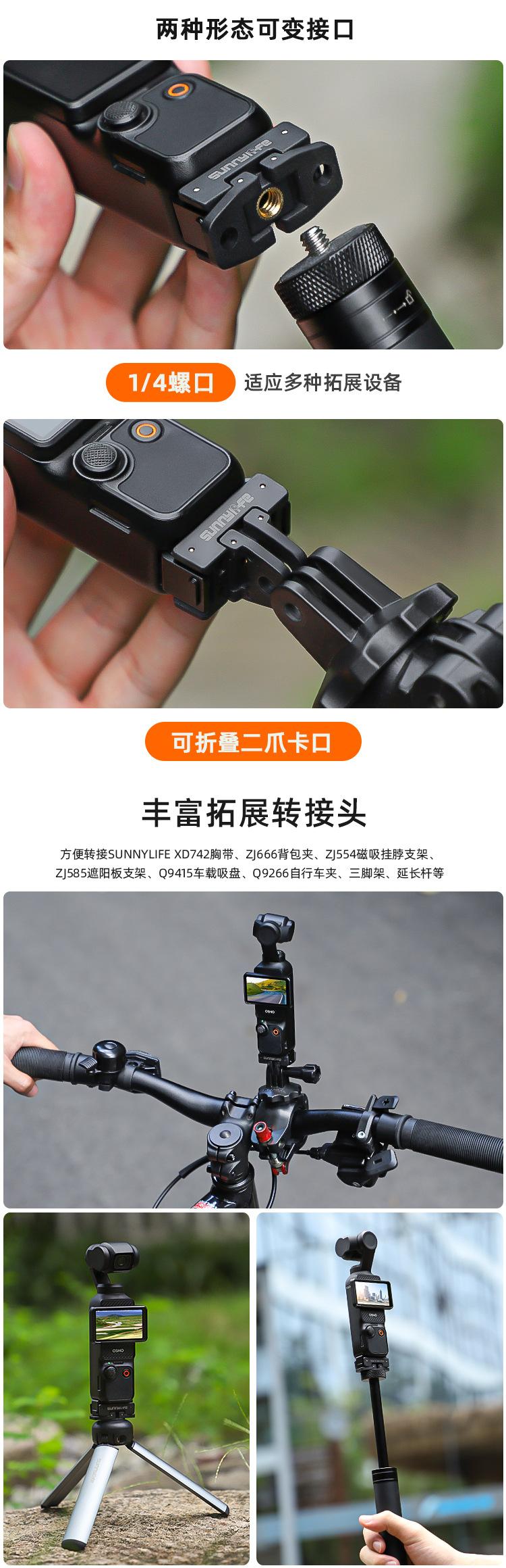 Adaptadores de expansión ricos. Conéctese convenientemente a la correa de pecho Sunnylife XD742, el clip para mochila ZJ666, el colgador magnético para cuello ZJ554, el soporte para visera solar ZJ585, la ventosa para coche Q9415, el clip para bicicleta Q9266, el trípode, la barra de extensión, etc.