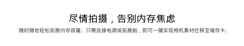Admite la carga de una sola cámara directamente a través de un puerto de alimentación o un banco de energía, sin depender de un compartimento de expansión. Compatible con interfaces Tipo-C y Lightning.
