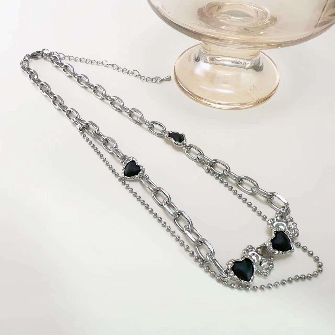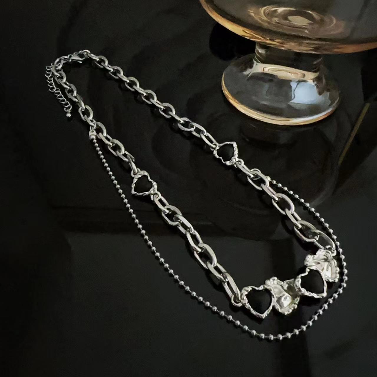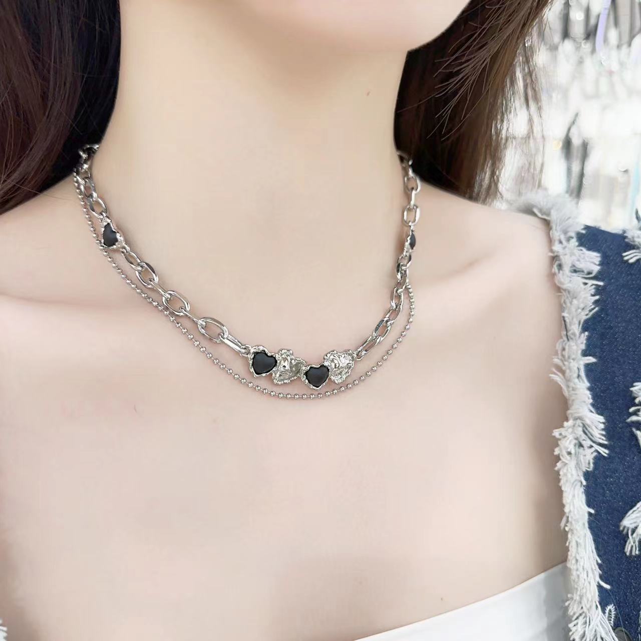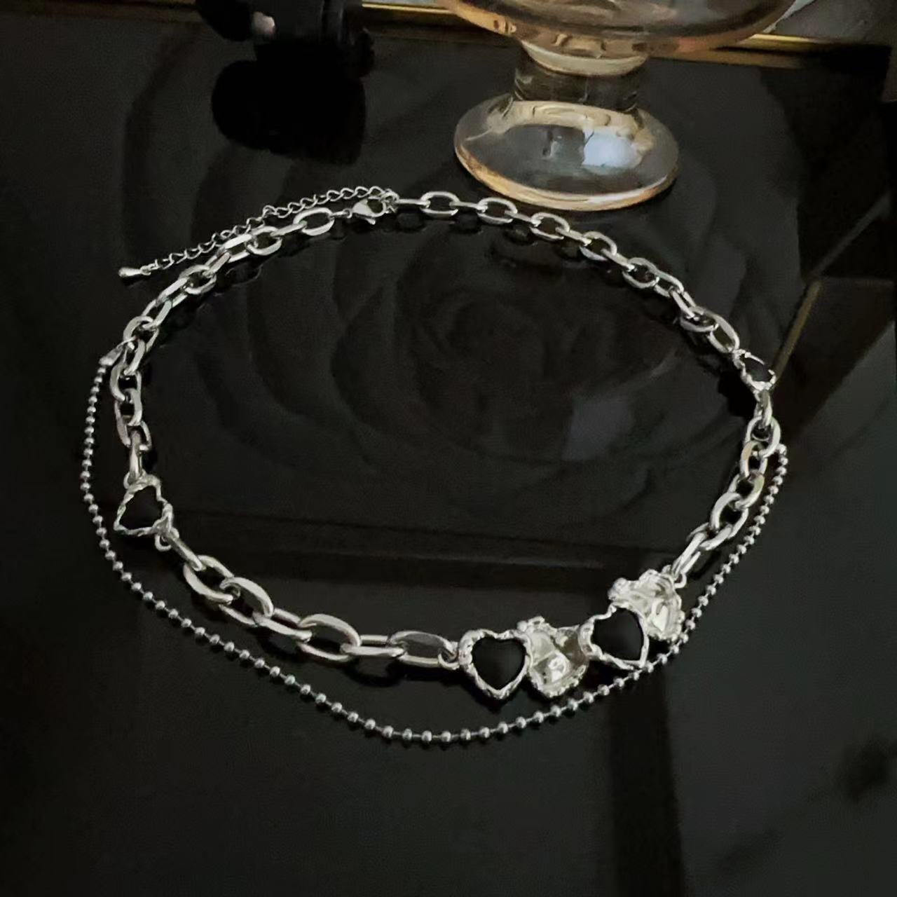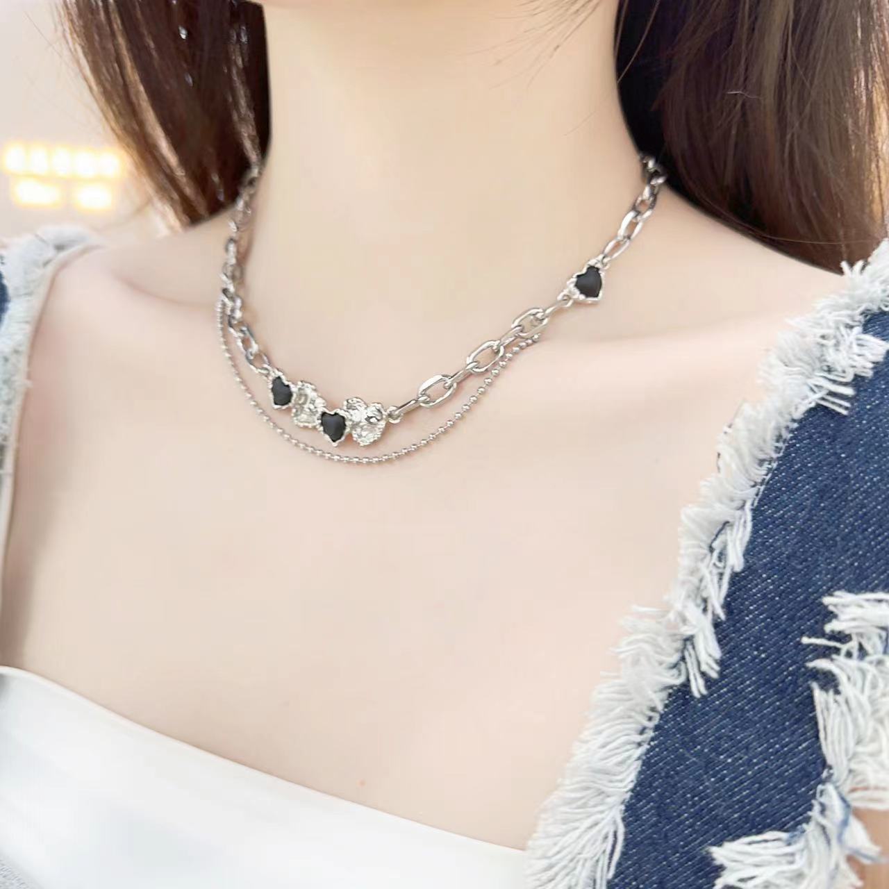 Cadena de clavícula de doble capa con circonita negra Love para mujer, diseño de nicho, elegante, de alta calidad, a la moda, de lujo, ligera, combinable con todo.