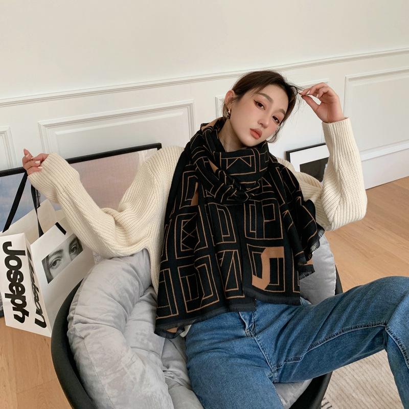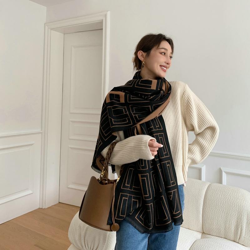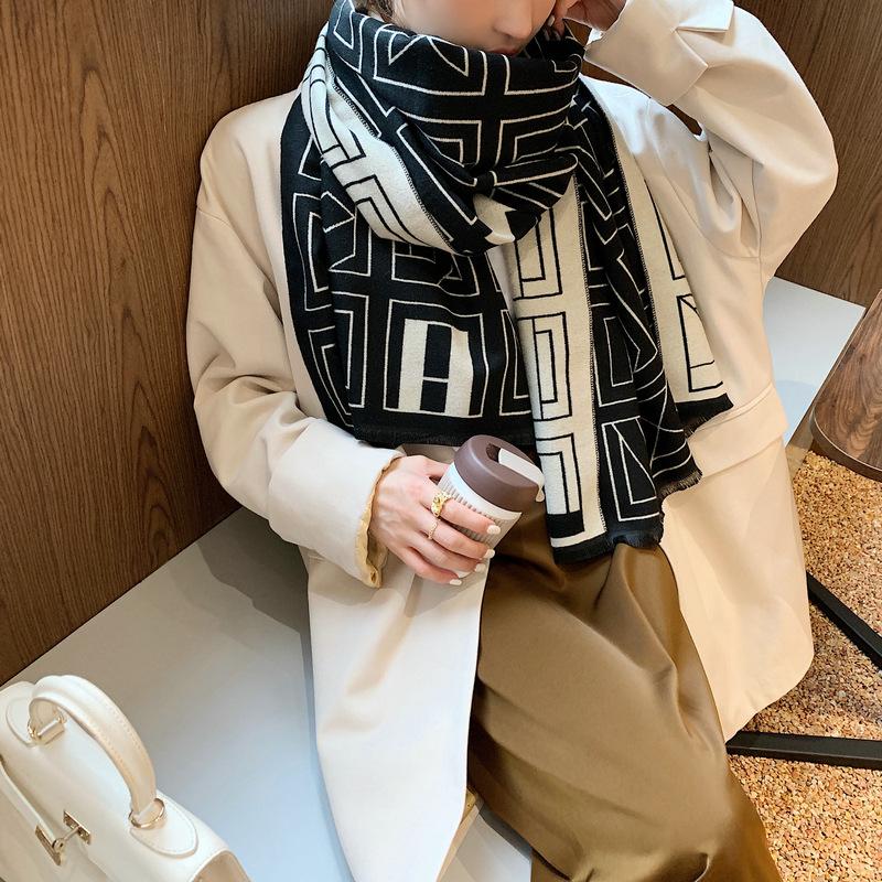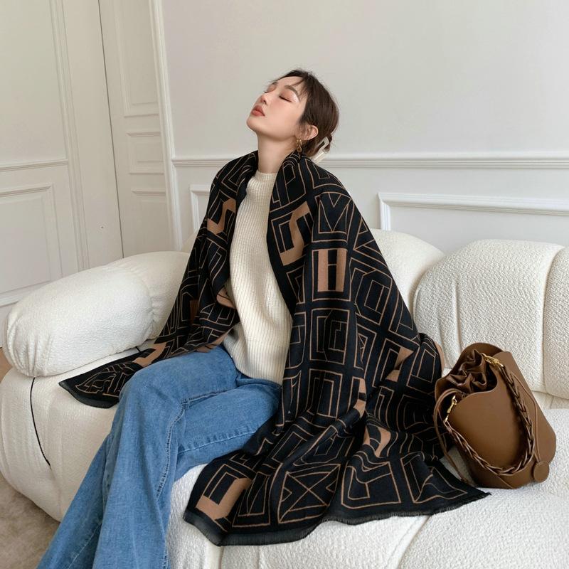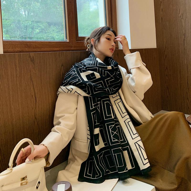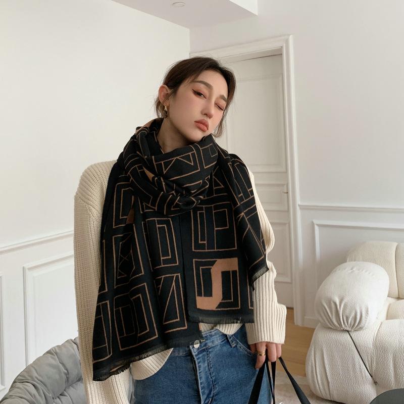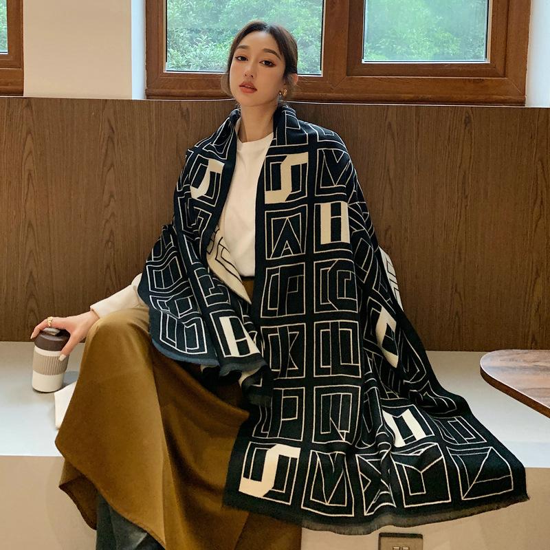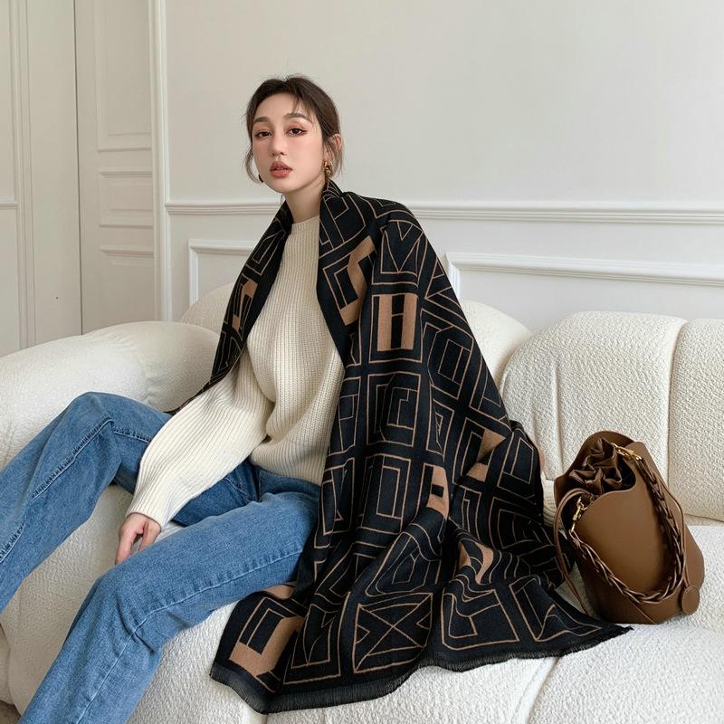Bufanda cálida de cachemir con letras geométricas para mujer, chal a cuadros de doble cara grueso y aire acondicionado, estilo vintage, para otoño e invierno