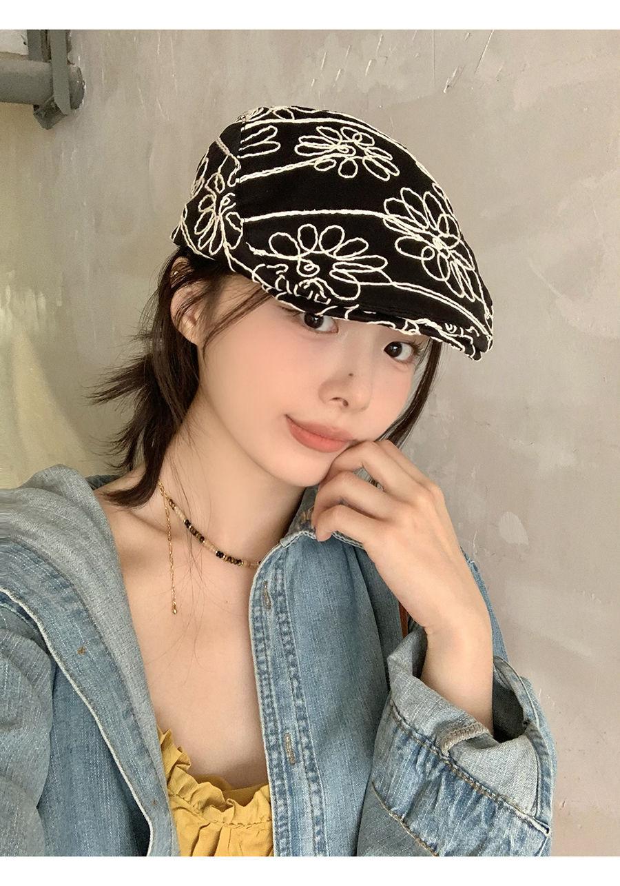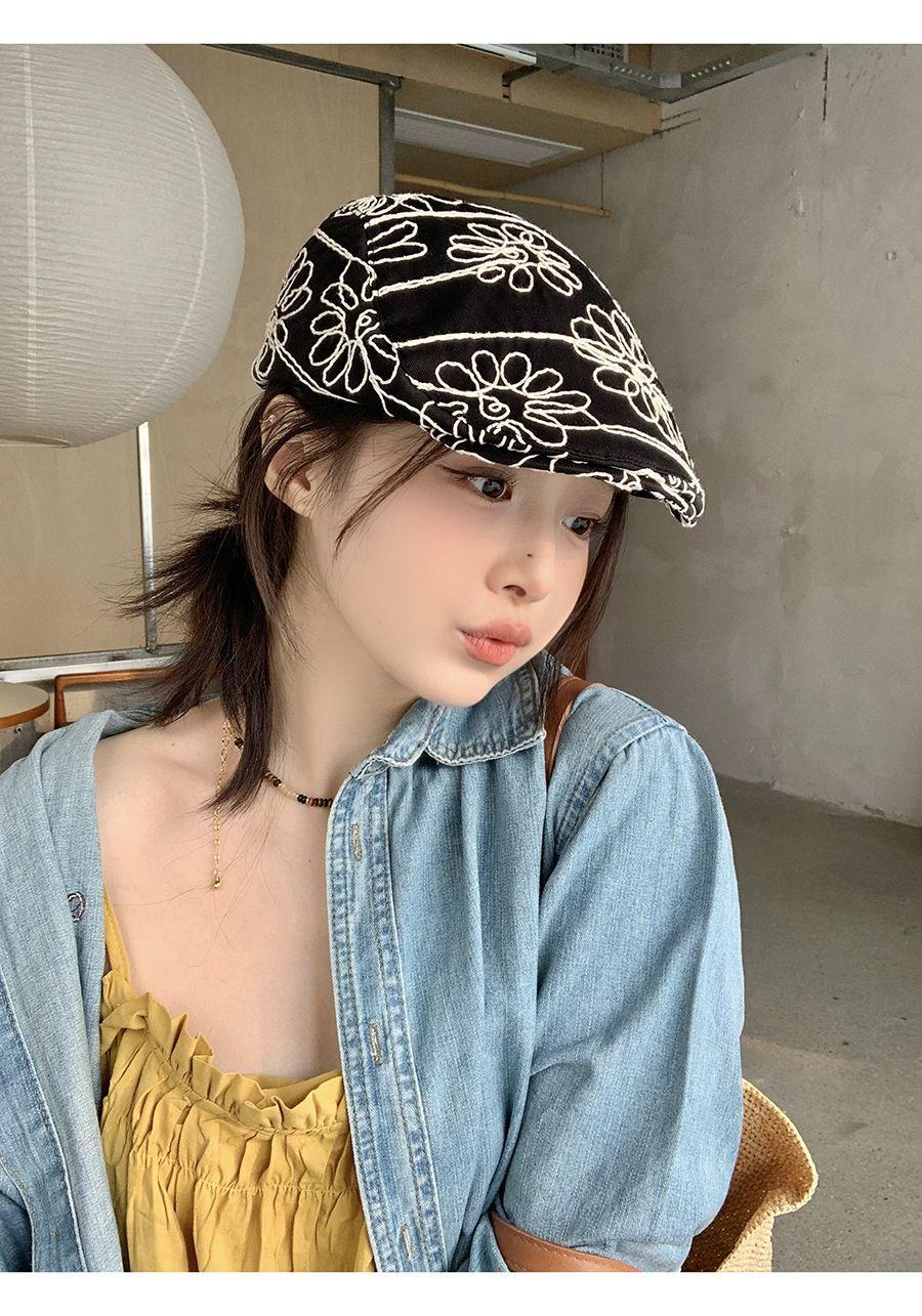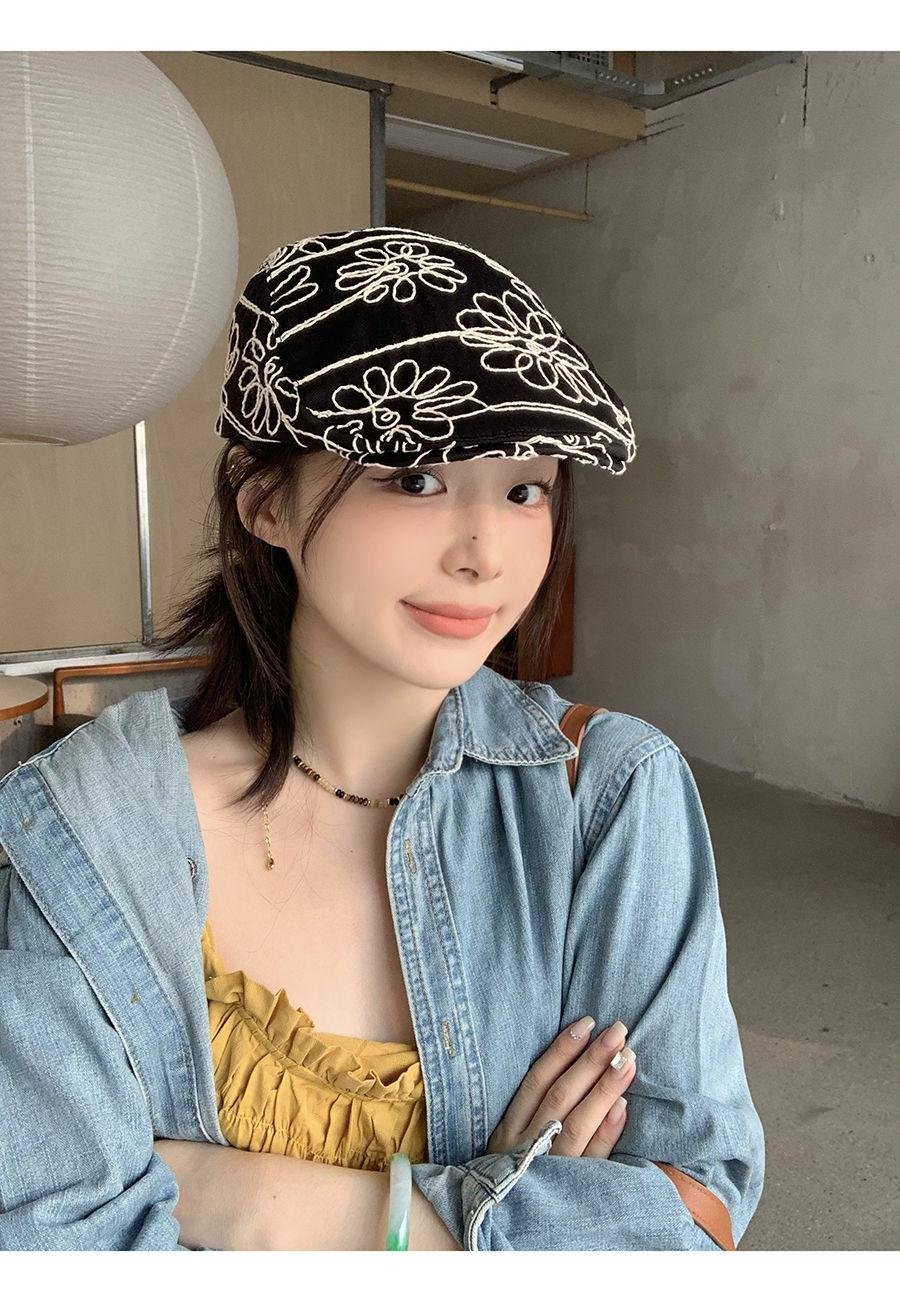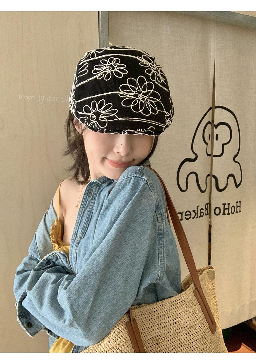 Bloguera surcoreana con gorra avanzada con bordado de flores retro, boina urbana de verano para mujer con rostro visible, pequeña y artística.