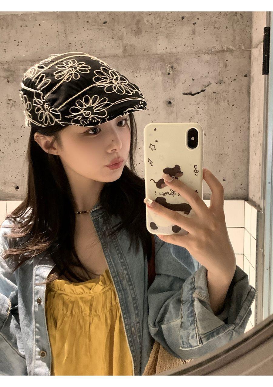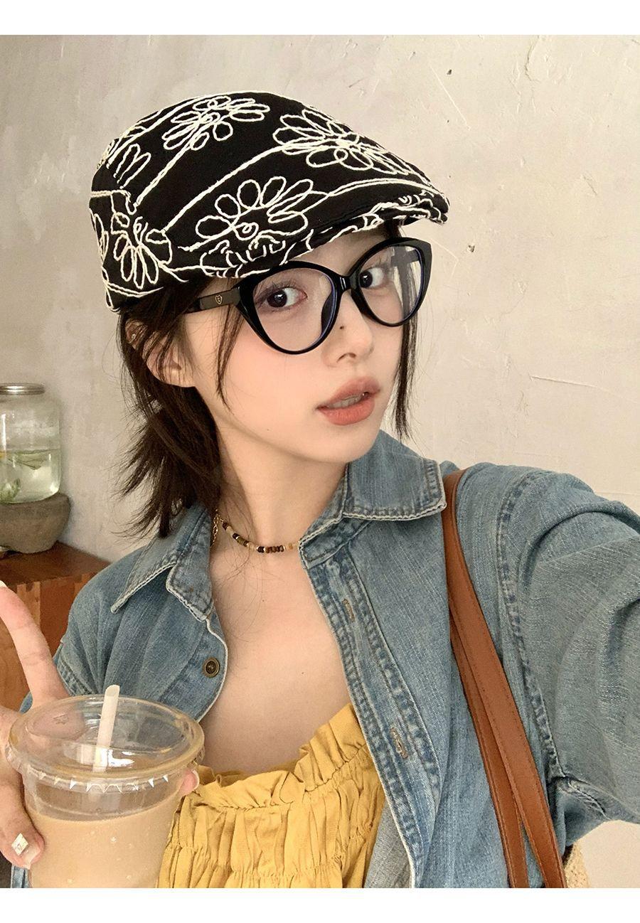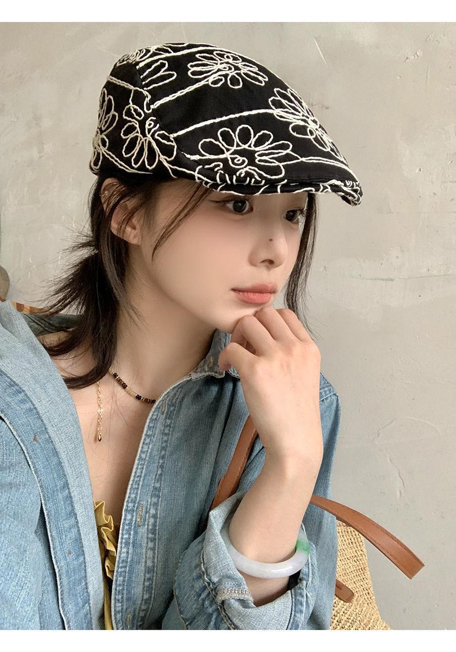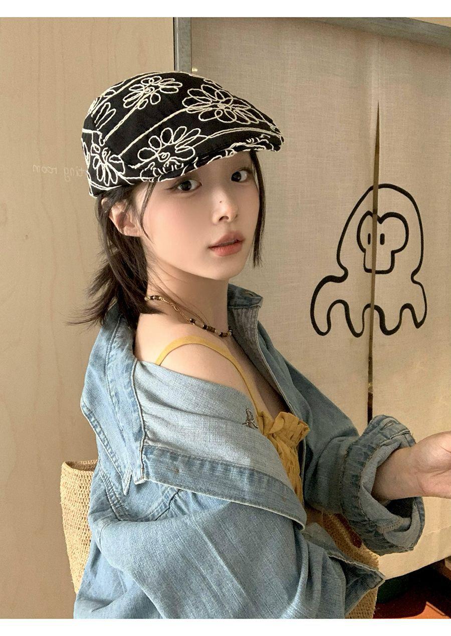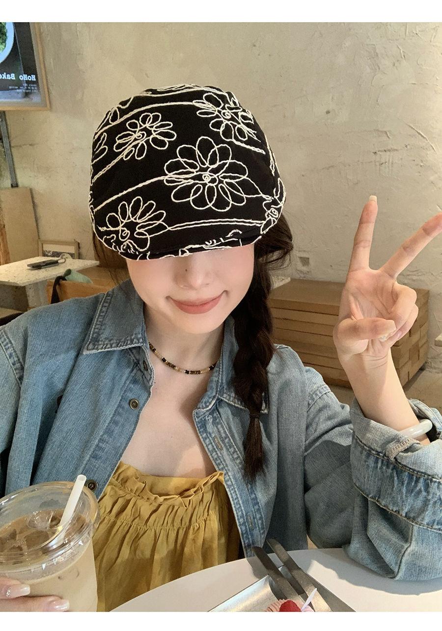 Bloguera surcoreana con gorra avanzada con bordado de flores retro, boina urbana de verano para mujer con rostro visible, pequeña y artística.