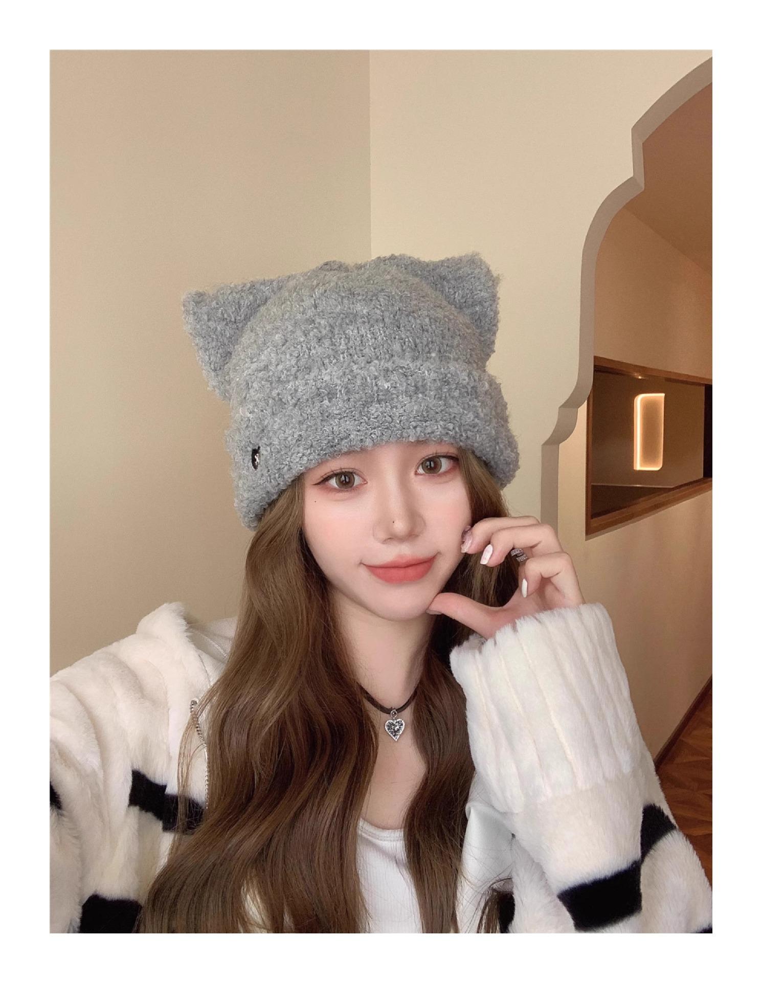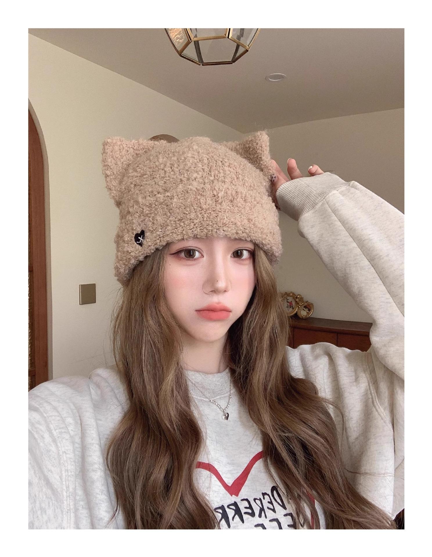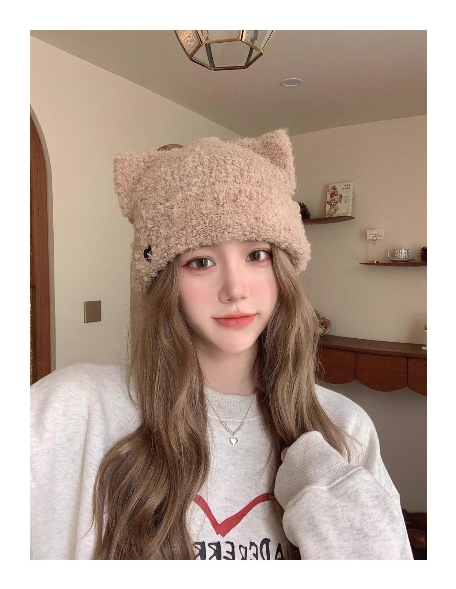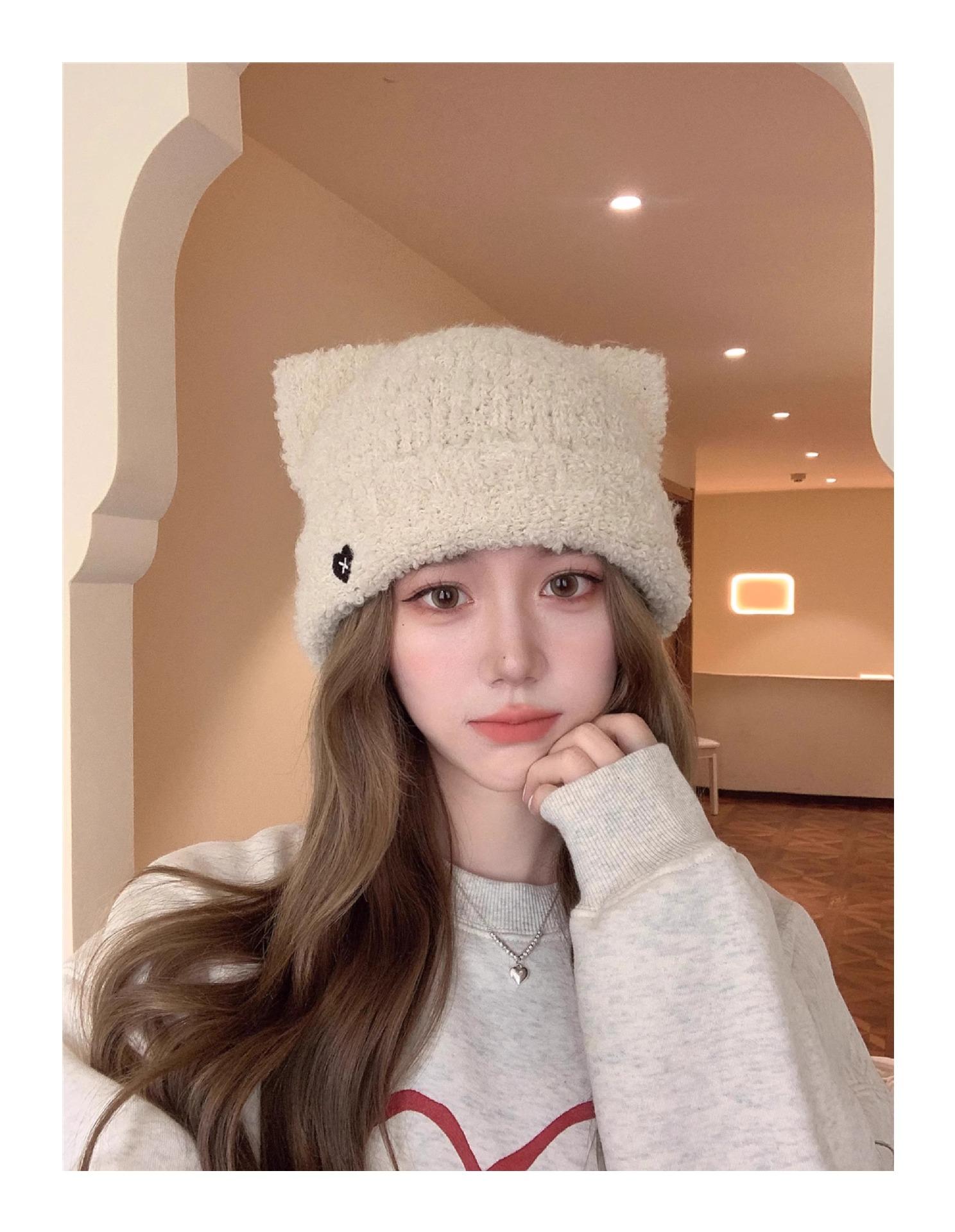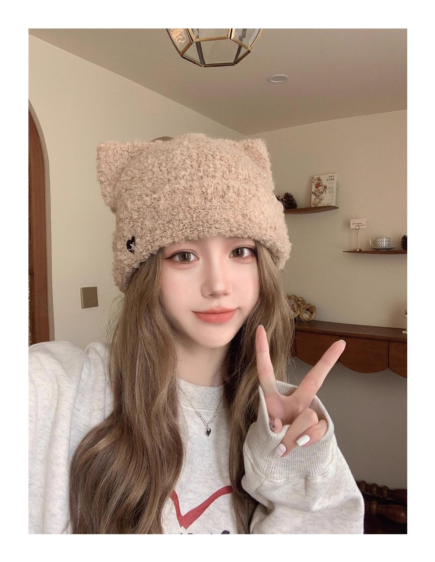 Sombrero de lana bordado encantador de orejas de gato dulce japonés para mujer, otoño e invierno, cálido, con protección para las orejas, de punto afelpado