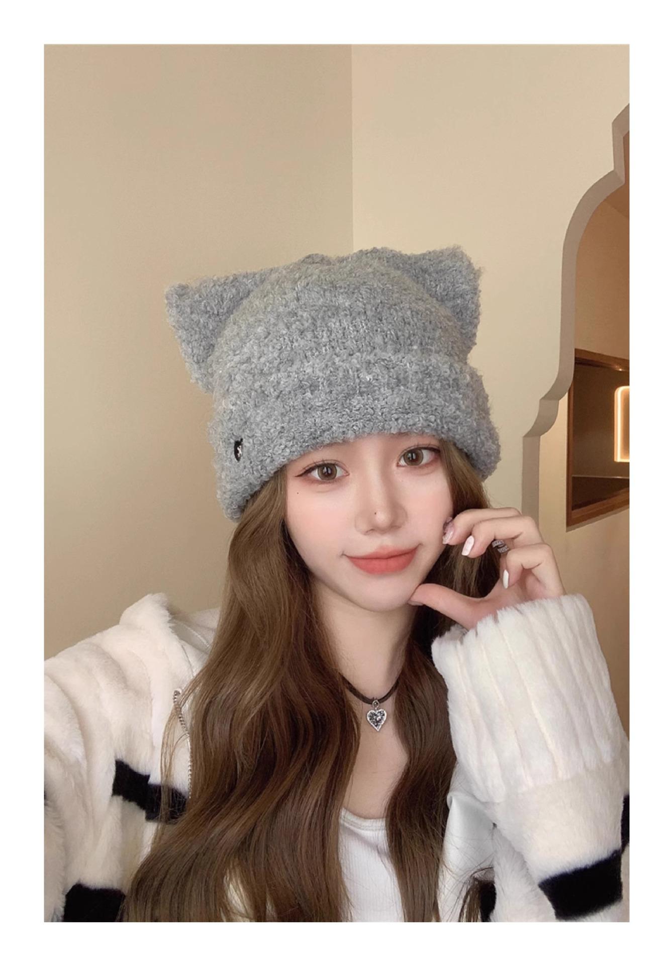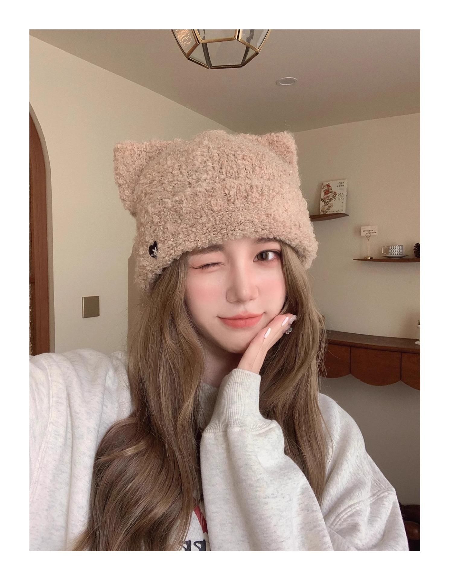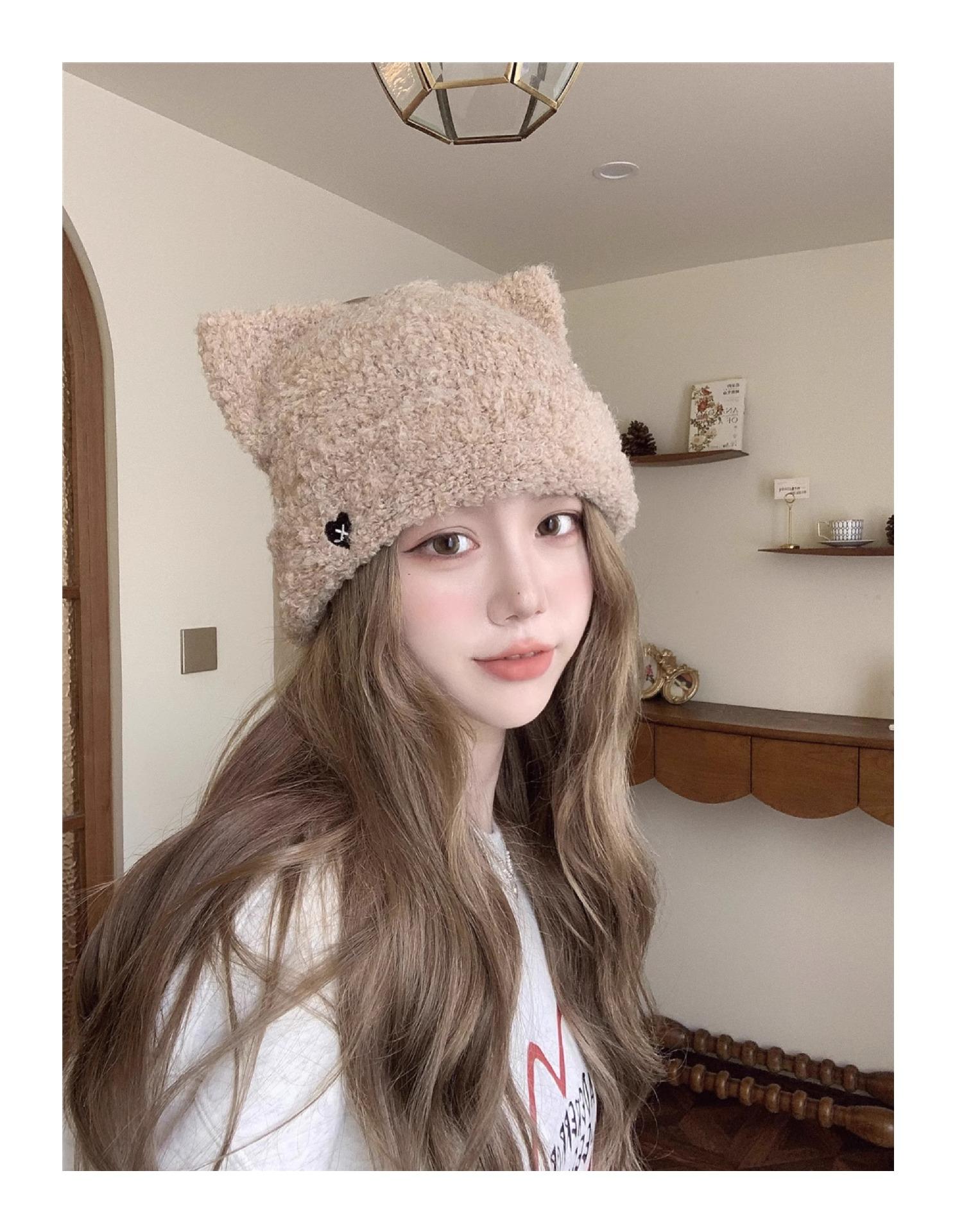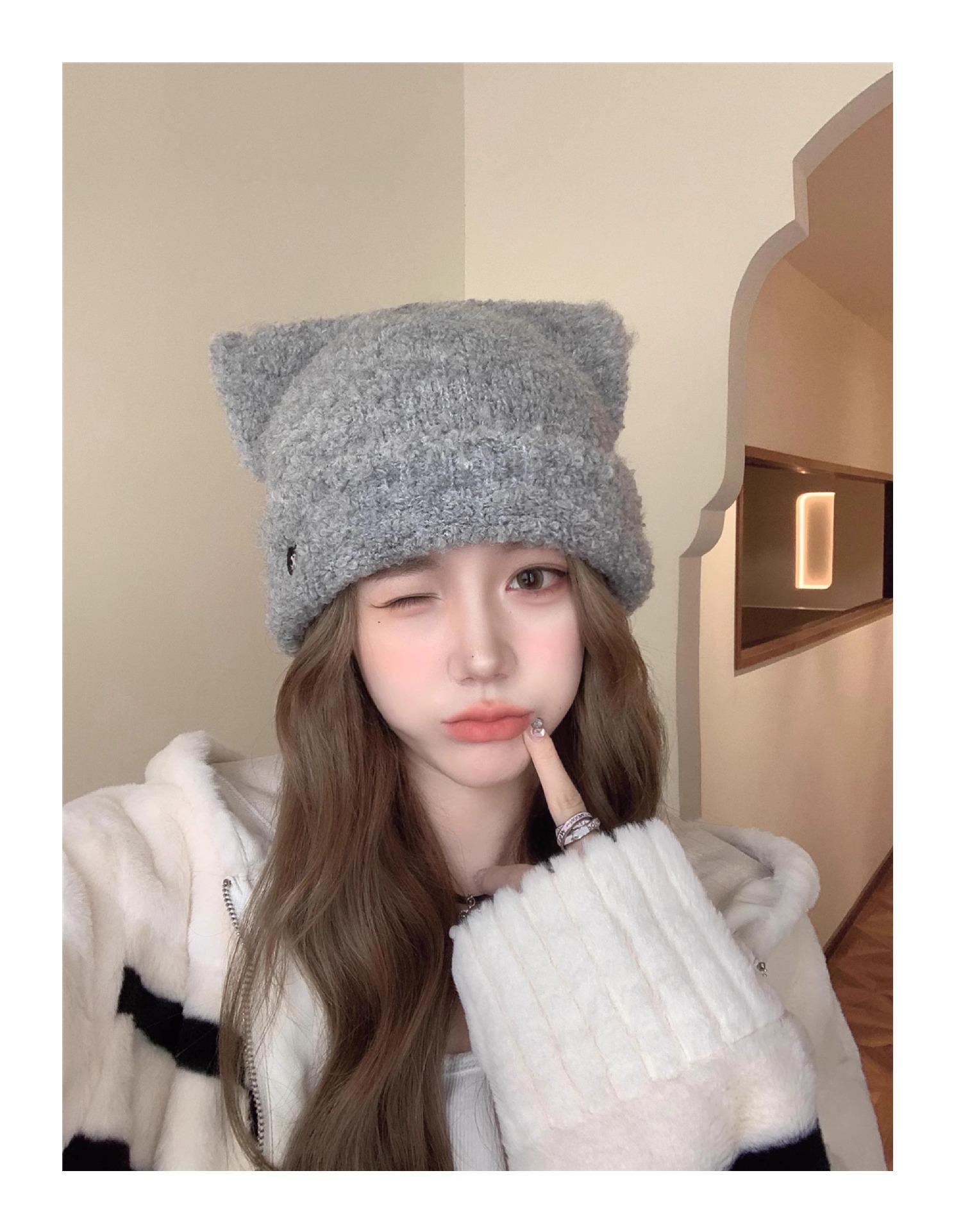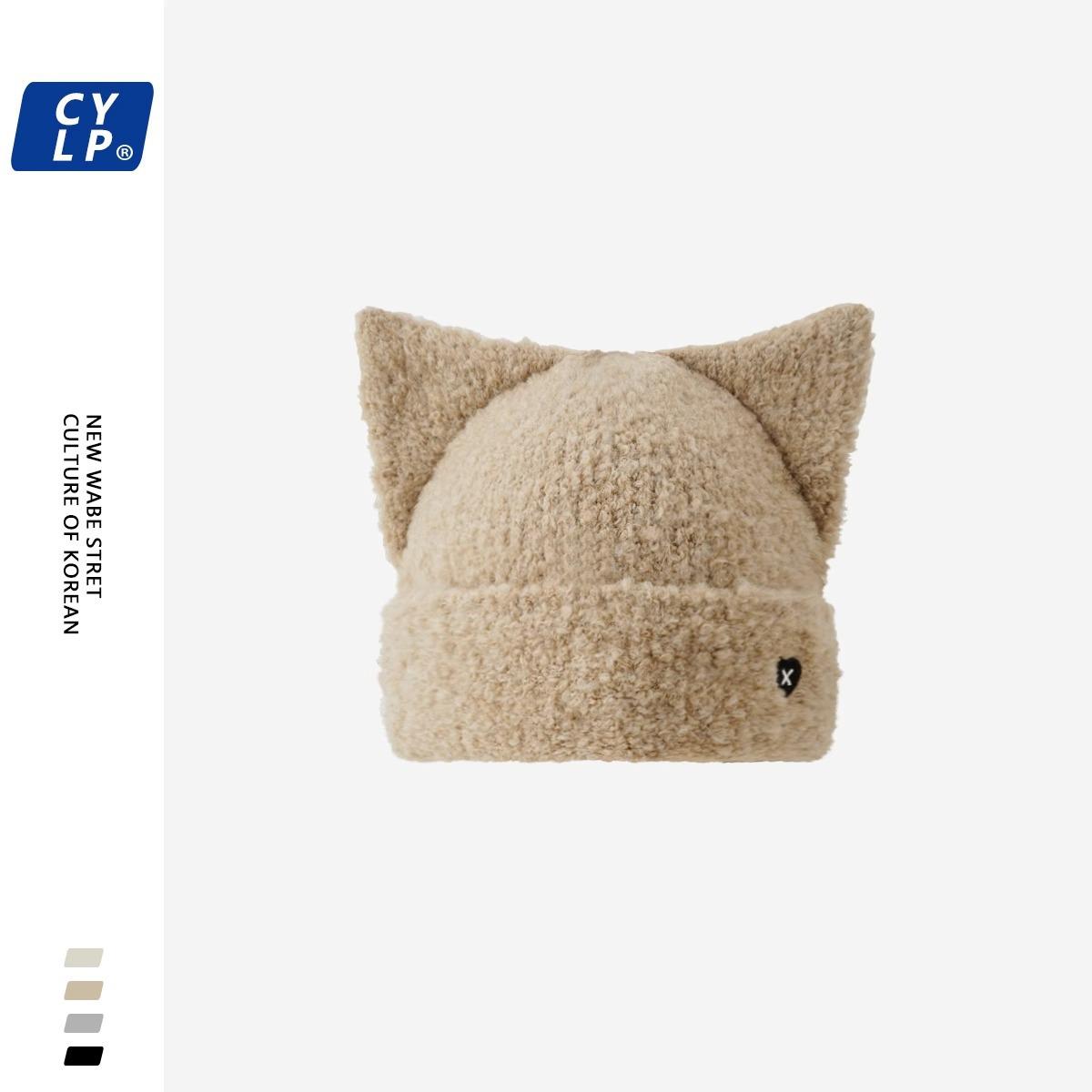 Sombrero de lana bordado encantador de orejas de gato dulce japonés para mujer, otoño e invierno, cálido, con protección para las orejas, de punto afelpado
