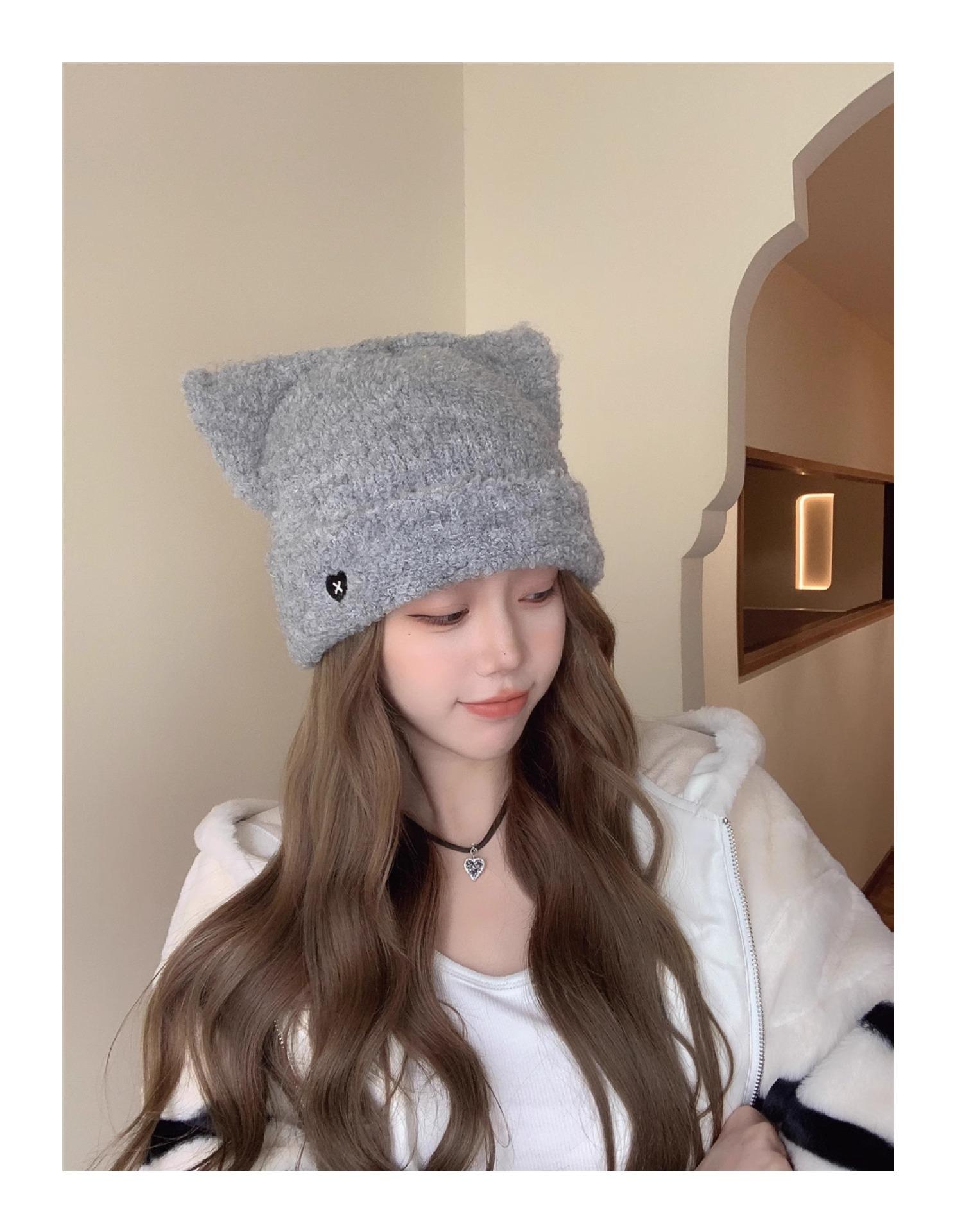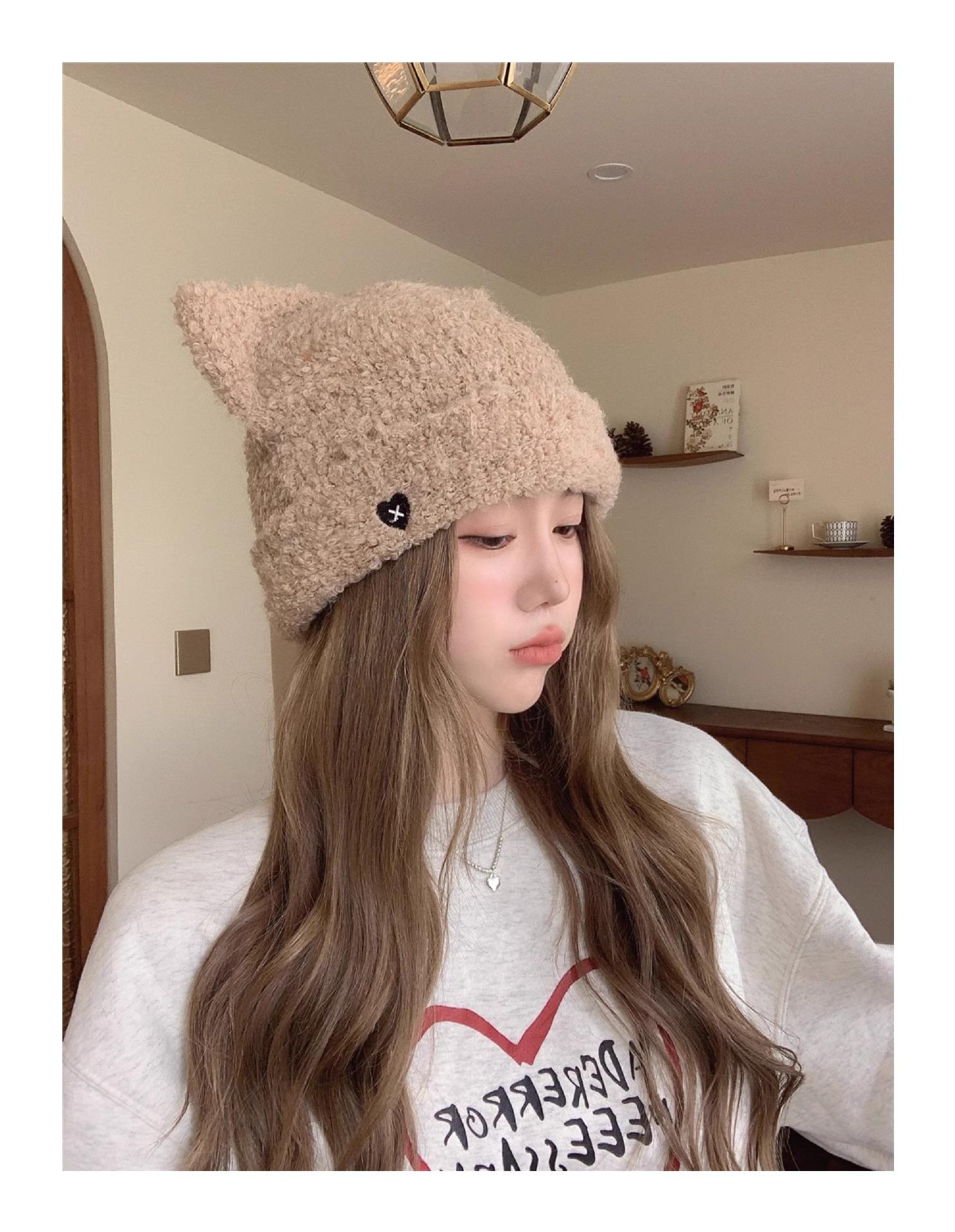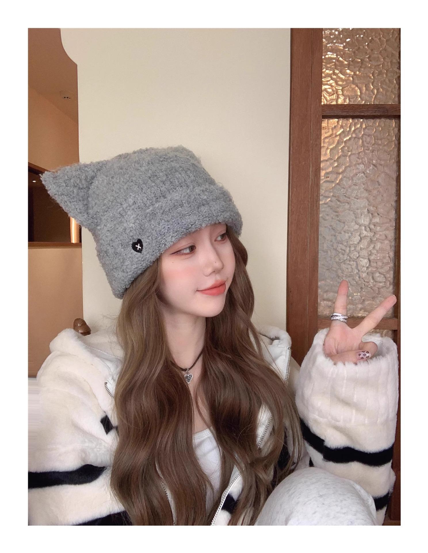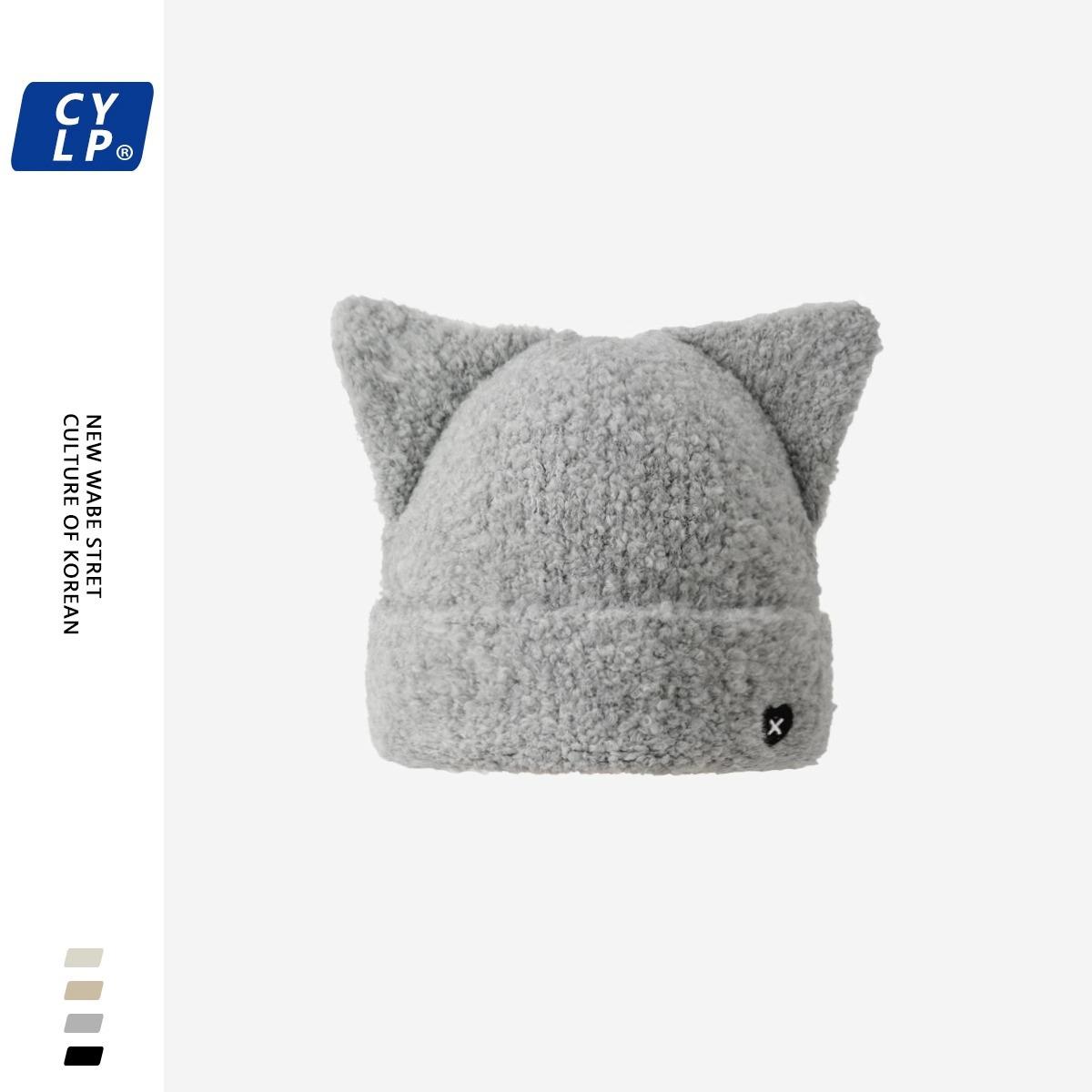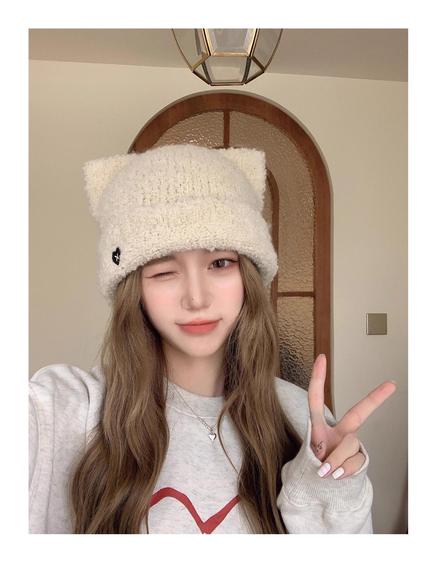 Sombrero de lana bordado encantador de orejas de gato dulce japonés para mujer, otoño e invierno, cálido, con protección para las orejas, de punto afelpado