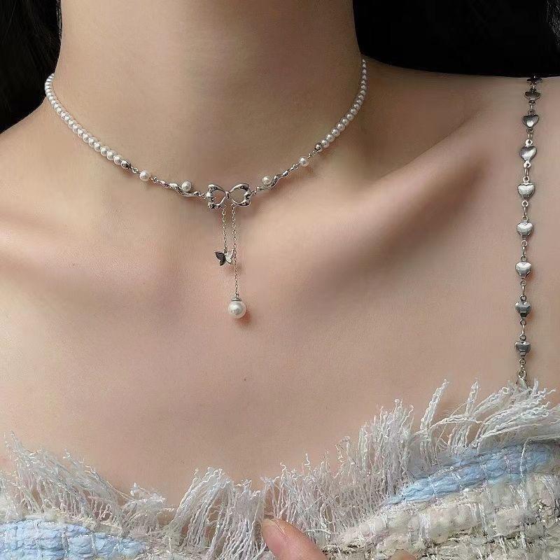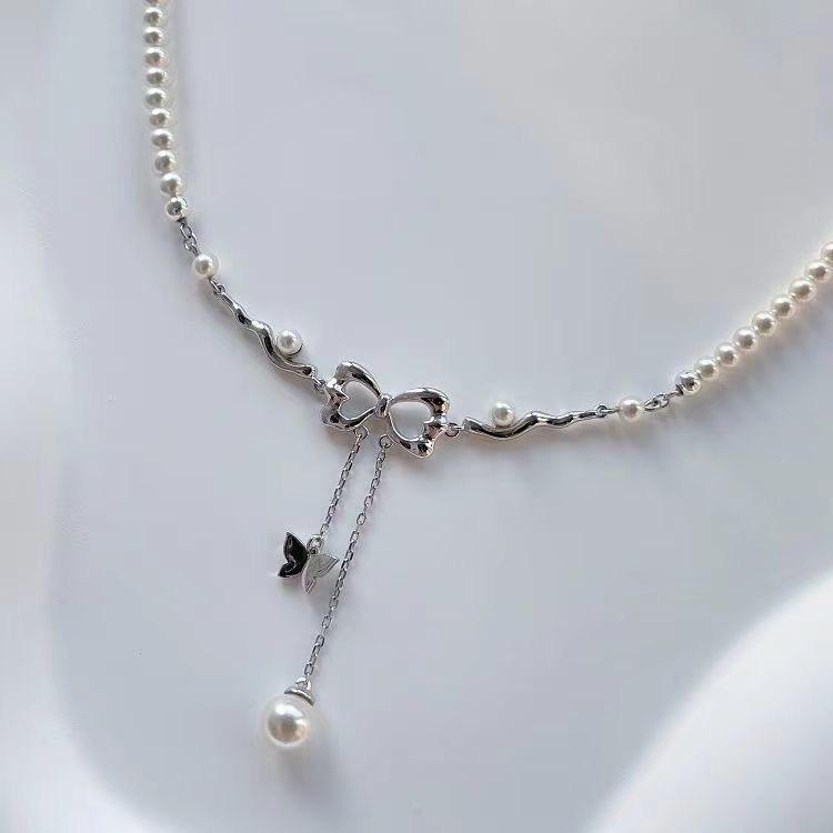 Collar de perlas de mariposa con borlas huecas para mujer, nuevo collar de lujo ligero de nicho para clavícula, collar francés de alta gama.