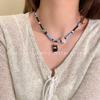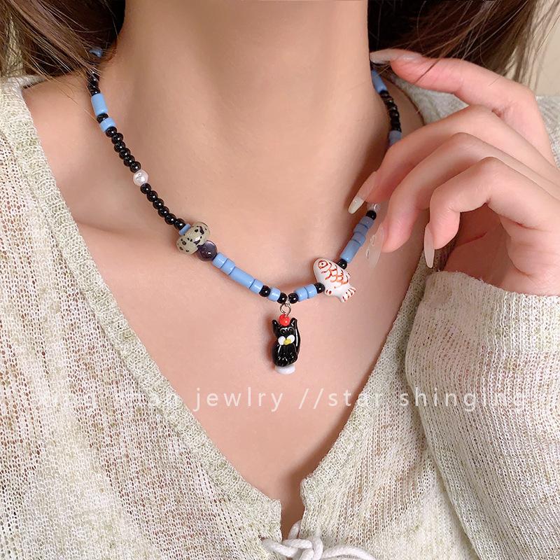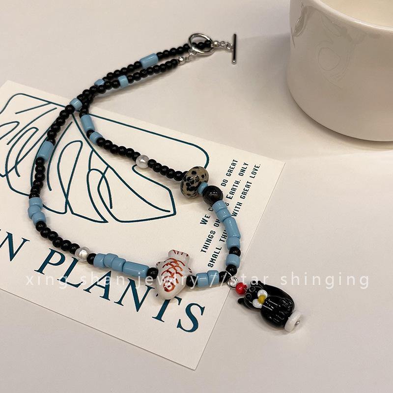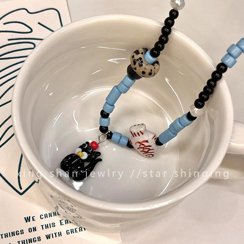 A Xiao Mao le encanta comer pescado ~ collar de novia con diseño de nicho de verano versátil con contraste azul y negro con gato y pez.