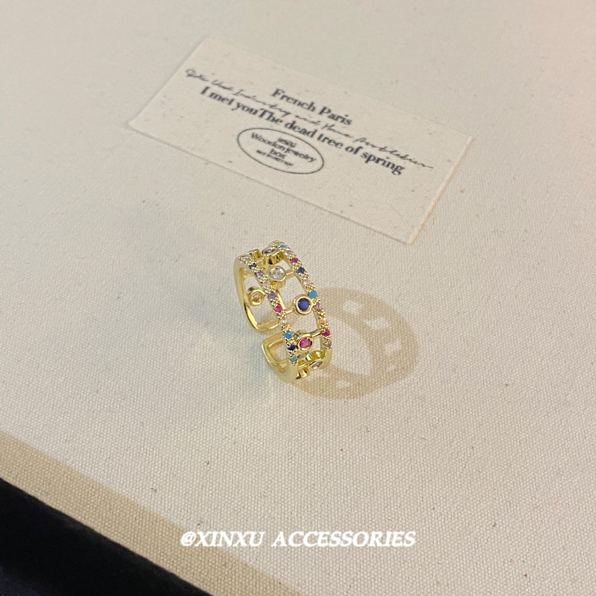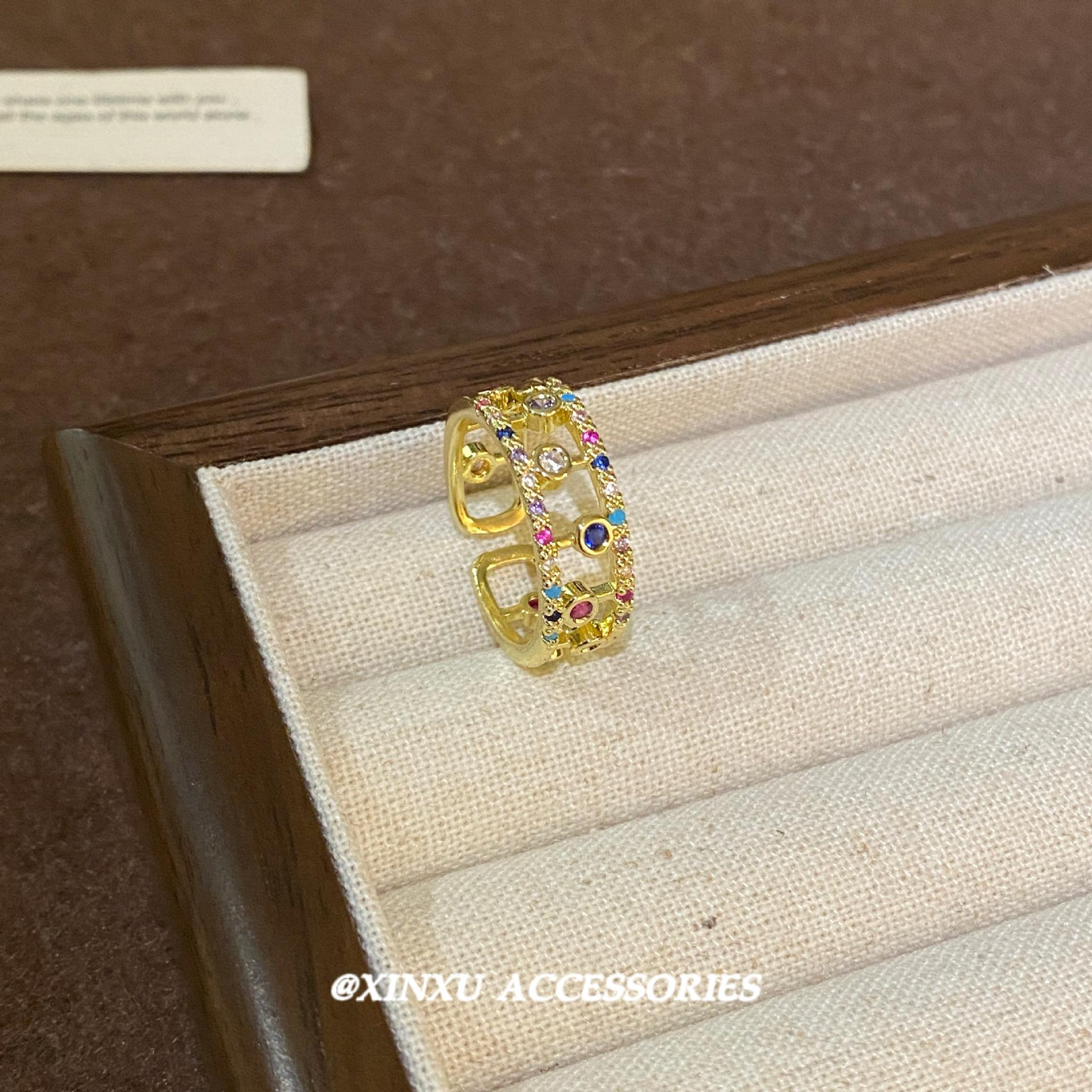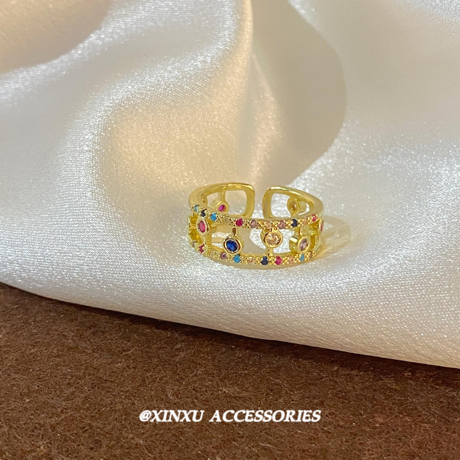 Anillo colorido de estilo cortesano europeo y americano con microincrustaciones de circonita de diamante completo para mujer, diamante flash popular, moda abierta, anillo de alto sentido que combina con todo