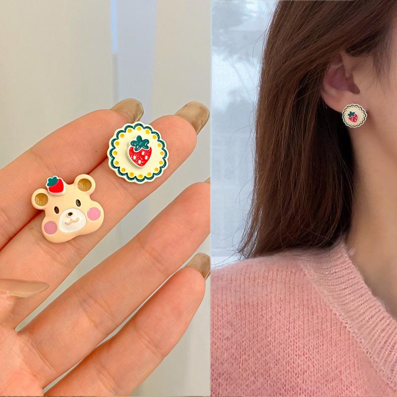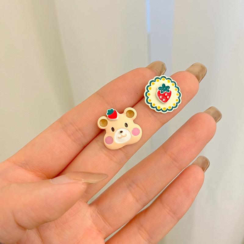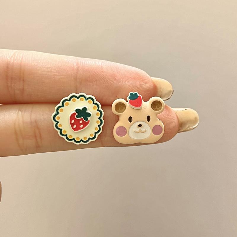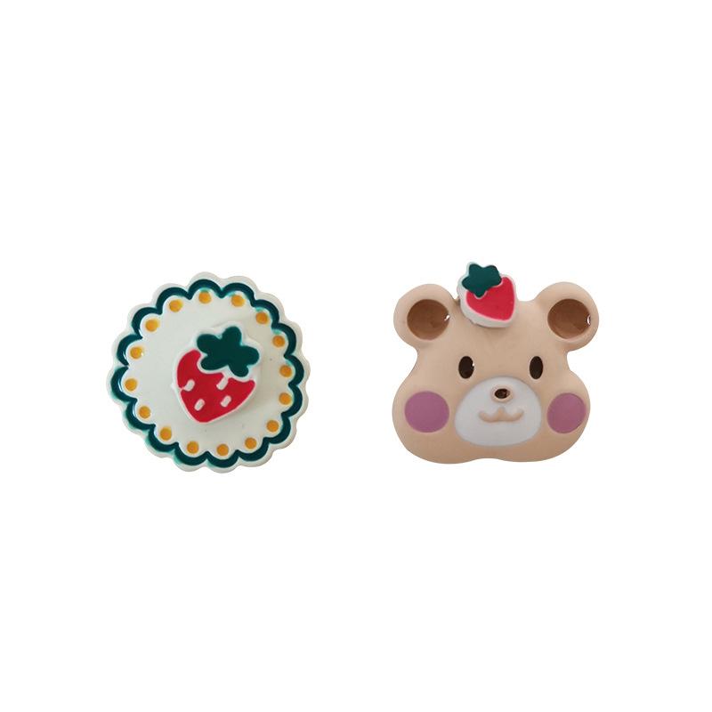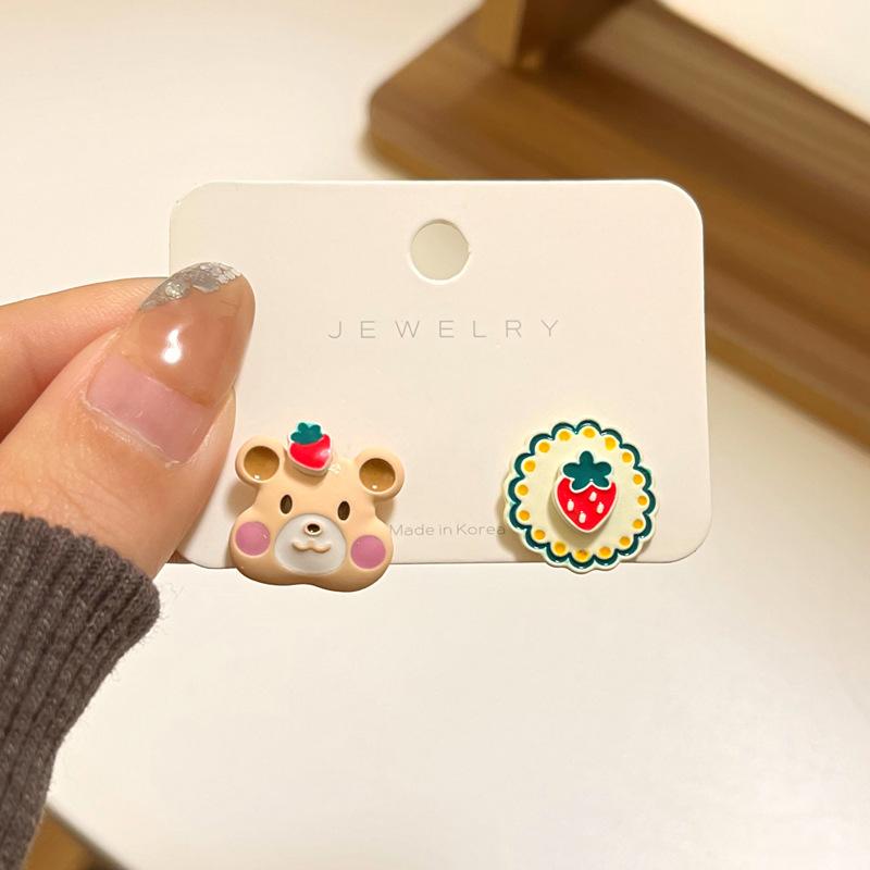 Aretes Japoneses Dulces Asimétricos de Oso Fresa Lindos Femeninos Aretes de Dibujos Animados