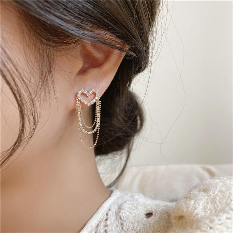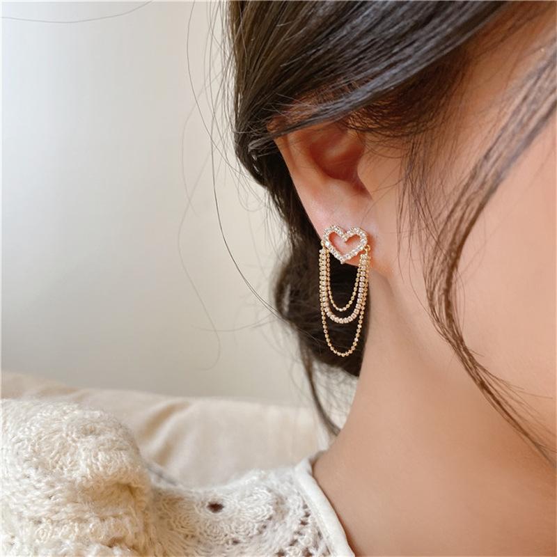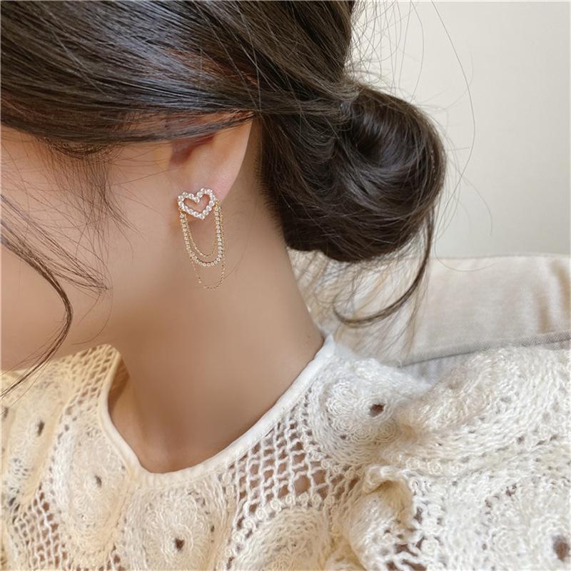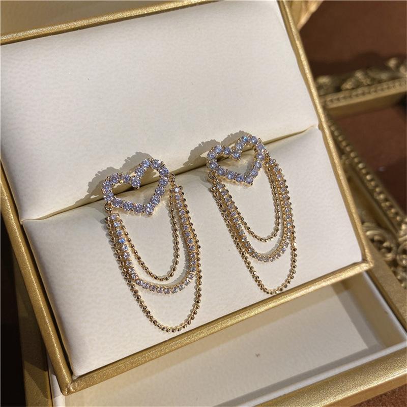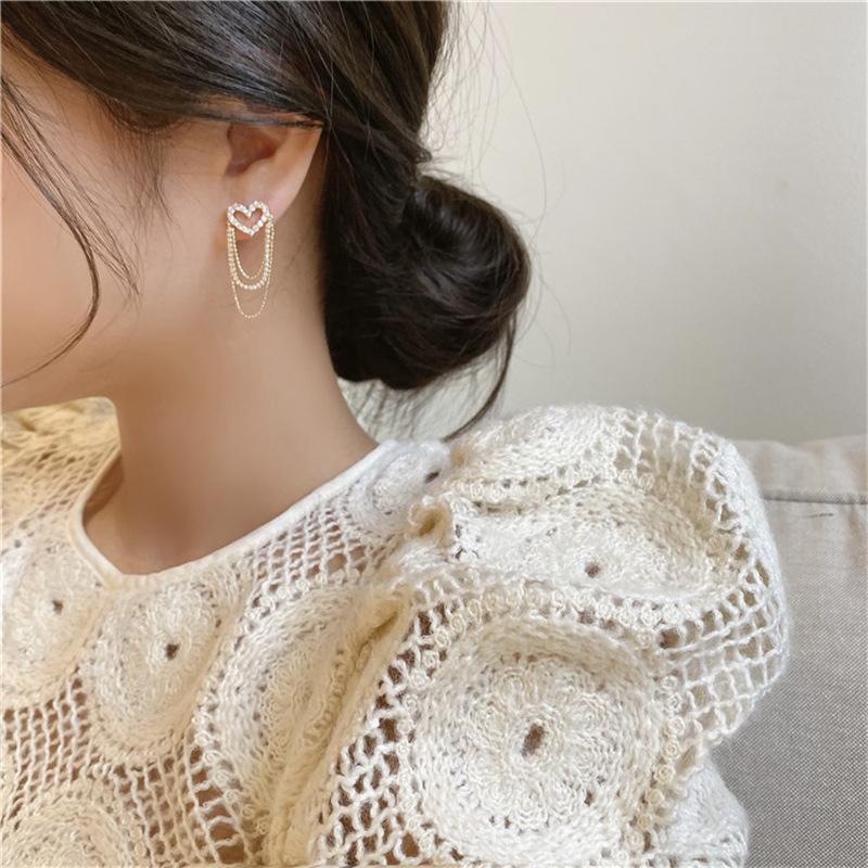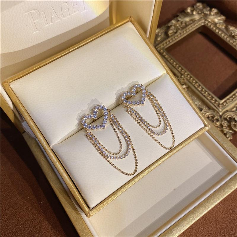 Pendientes de borla de corazón con incrustaciones de diamantes, diseño de nicho de aguja de plata S925 de Corea del Sur, modernos y sencillos, que combinan con todo.